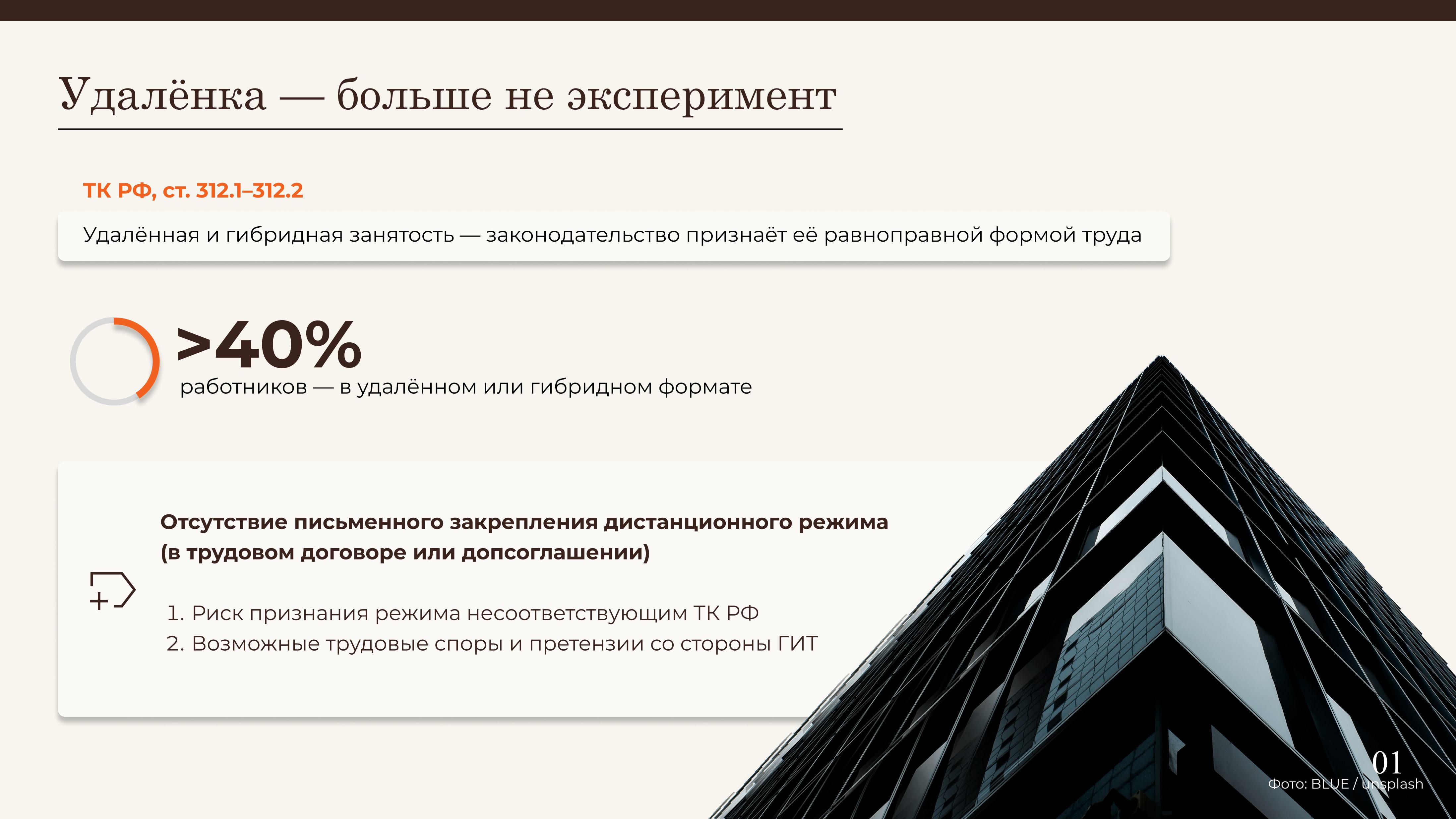 Согласно последним исследованиям, доля тех, кто работает из дома или в гибридном формате, продолжает расти. Ожидается, что к концу года более 40% работников будут постоянно или частично работать дистанционно. Рост данной формы занятости обусловлен не только технологическим развитием, но и тем, что законодательство теперь признаёт дистанционную работу равноправной формой реализации трудовых отношений, при которой за работником сохраняются все основные трудовые гарантии, предусмотренные ТК РФ.