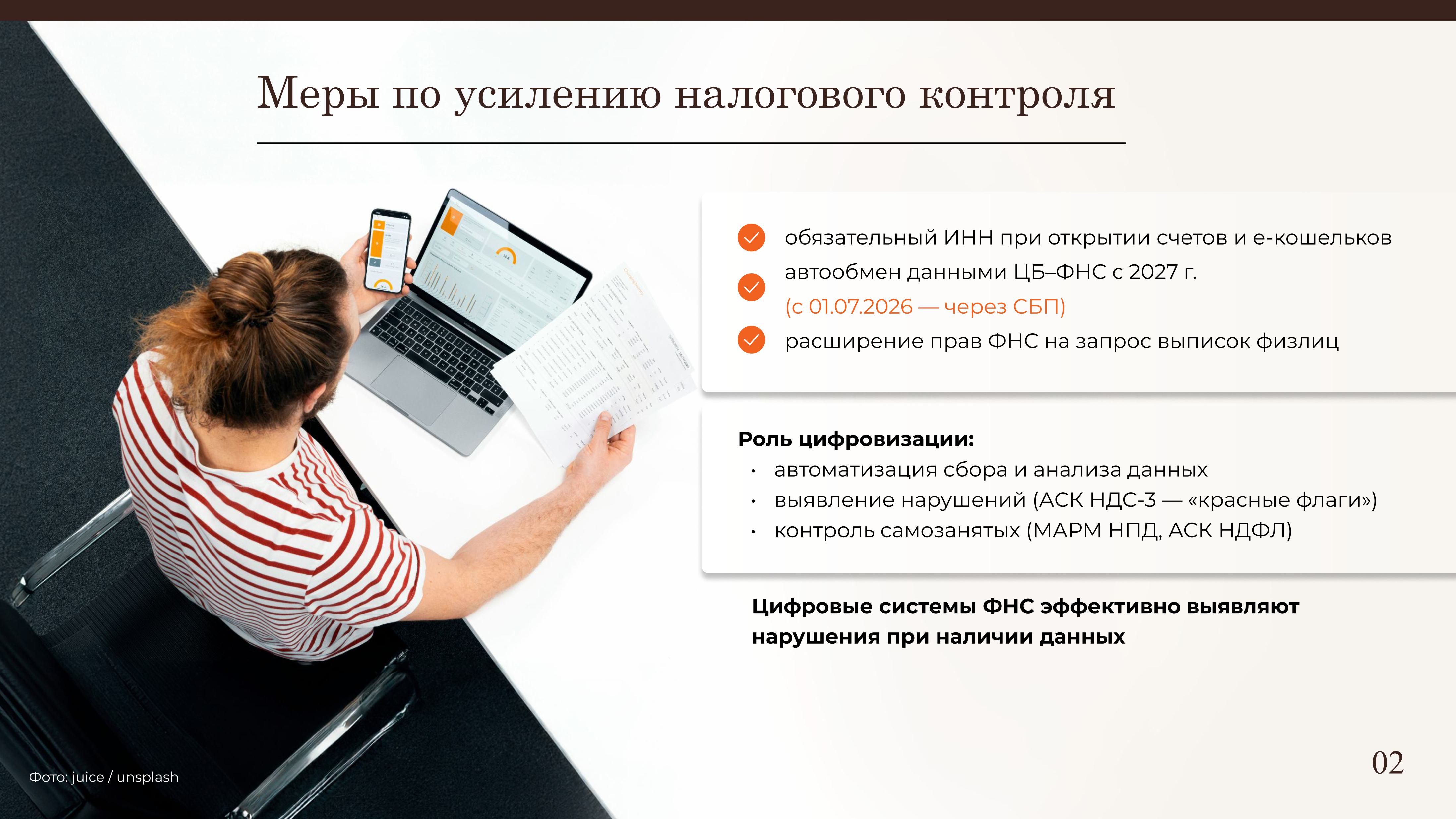 - запустить автоматический обмен данными между ЦБ и ФНС с 2027 года. При этом банки уже с 1 июля 2026 года начнут обмениваться ИНН через Систему быстрых платежей (СБП);
