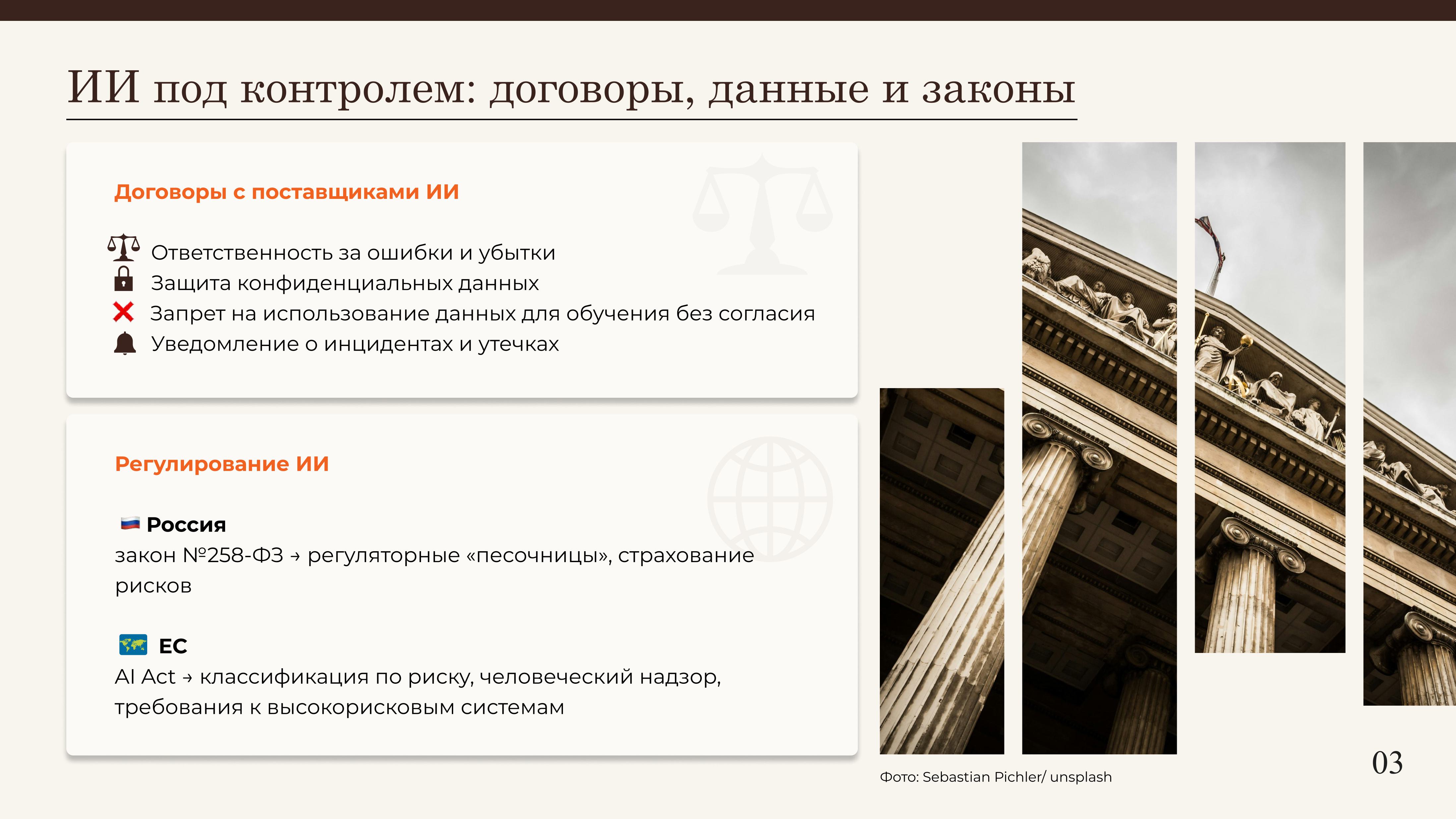 Третья зона риска – договорные отношения с поставщиками ИИ-сервисов.