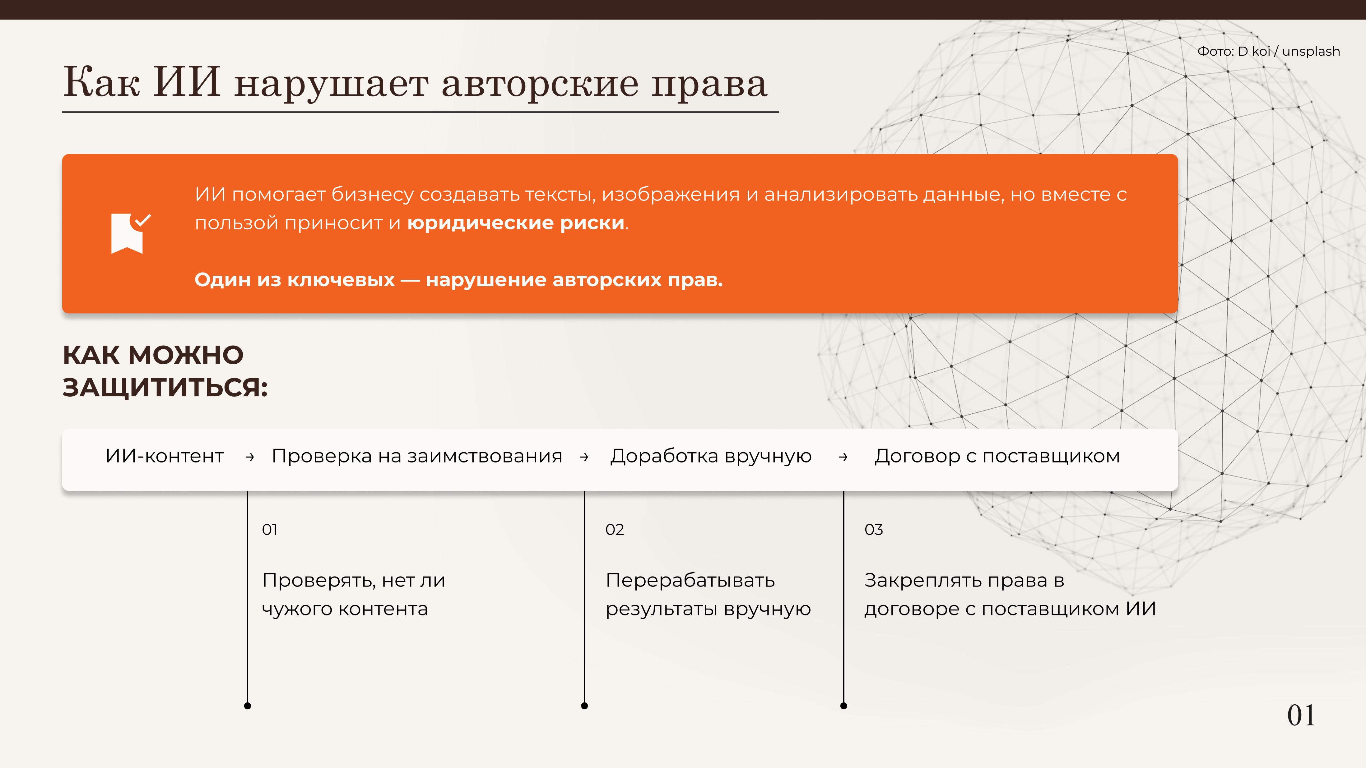 Первая зона риска – авторские права. В Российской Федерации ключевым нормативным актом является Гражданский кодекс РФ (часть IV), а также международные соглашения, участником которых является Россия. Генеративные модели обучаются на огромных массивах данных, среди которых могут быть защищённые произведения (тексты, изображения, музыка и др.). Если результат ИИ повторяет чужие изображения или тексты, это может считаться нарушением авторских прав. Например, недавно мы обсуждали использование фото без разрешения авторов, основные правовые аспекты, касающиеся защиты правообладателей, и меры профилактики для предпринимателей, желающих обезопасить себя от исков, связанных с незаконным использованием чужого контента.
