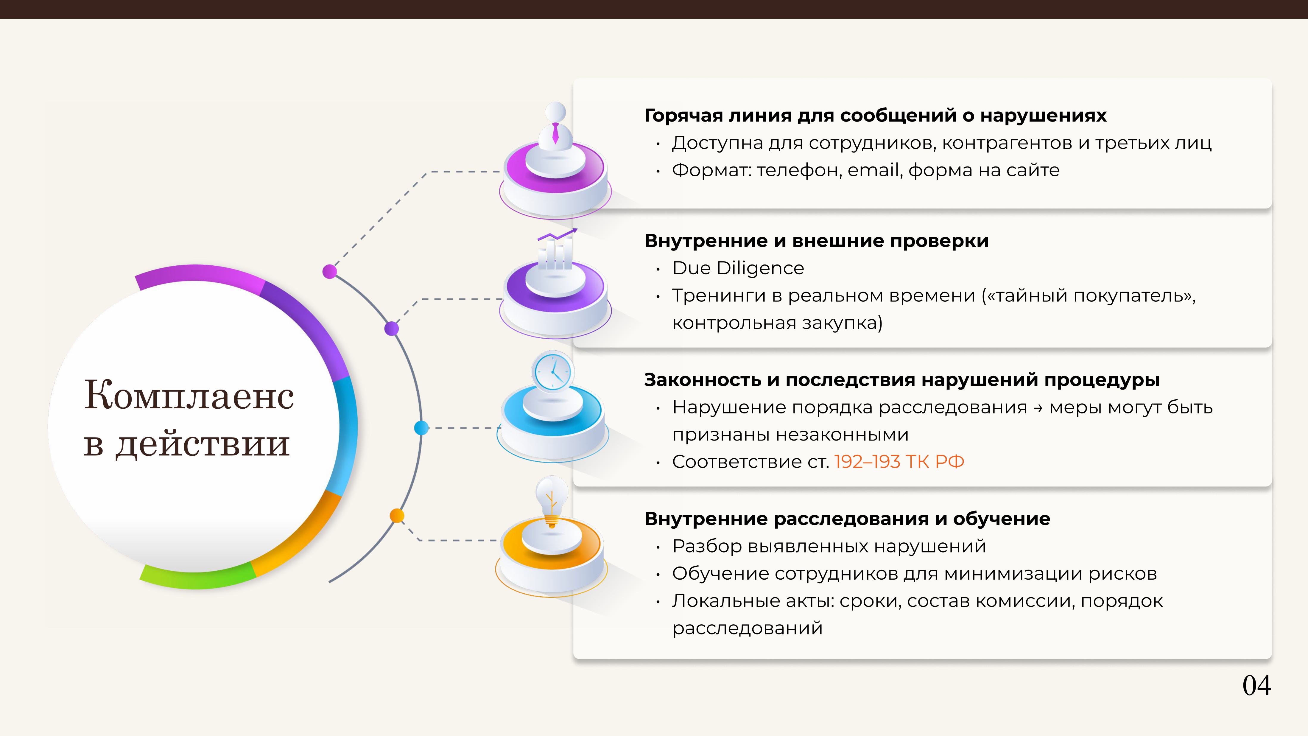 Эффективный комплаенс – сердце бизнеса и целая экосистема, где есть поэтапный анализ рисков, обучение сотрудников, назначение ответственных и постоянное улучшение действующих механизмов работы. Он также включает в себя автоматизацию процессов, комплексную оценку рисков, мониторинг и адаптацию изменений в законодательстве, реально работающие системы получения обратной связи от клиентов и контрагентов, обучение сотрудников, механизмы расследования и привлечения к ответственности.