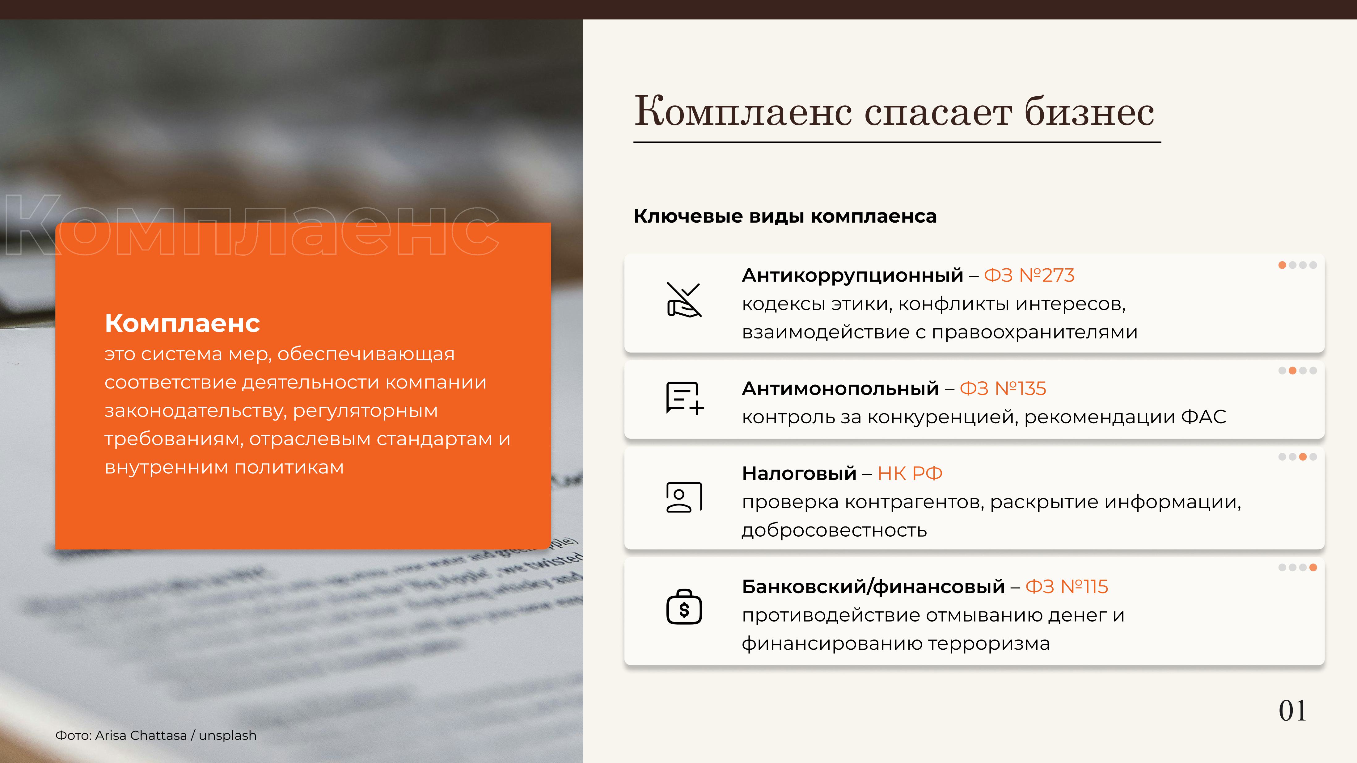 Комплаенс – это комплекс мер, направленных на обеспечение соответствия деятельности организации применимому законодательству, регуляторным требованиям, отраслевым стандартам и внутренним политикам. Законодательством РФ урегулированы такие виды комплаенса как: антимонопольный, антикоррупционный, налоговый, банковский.