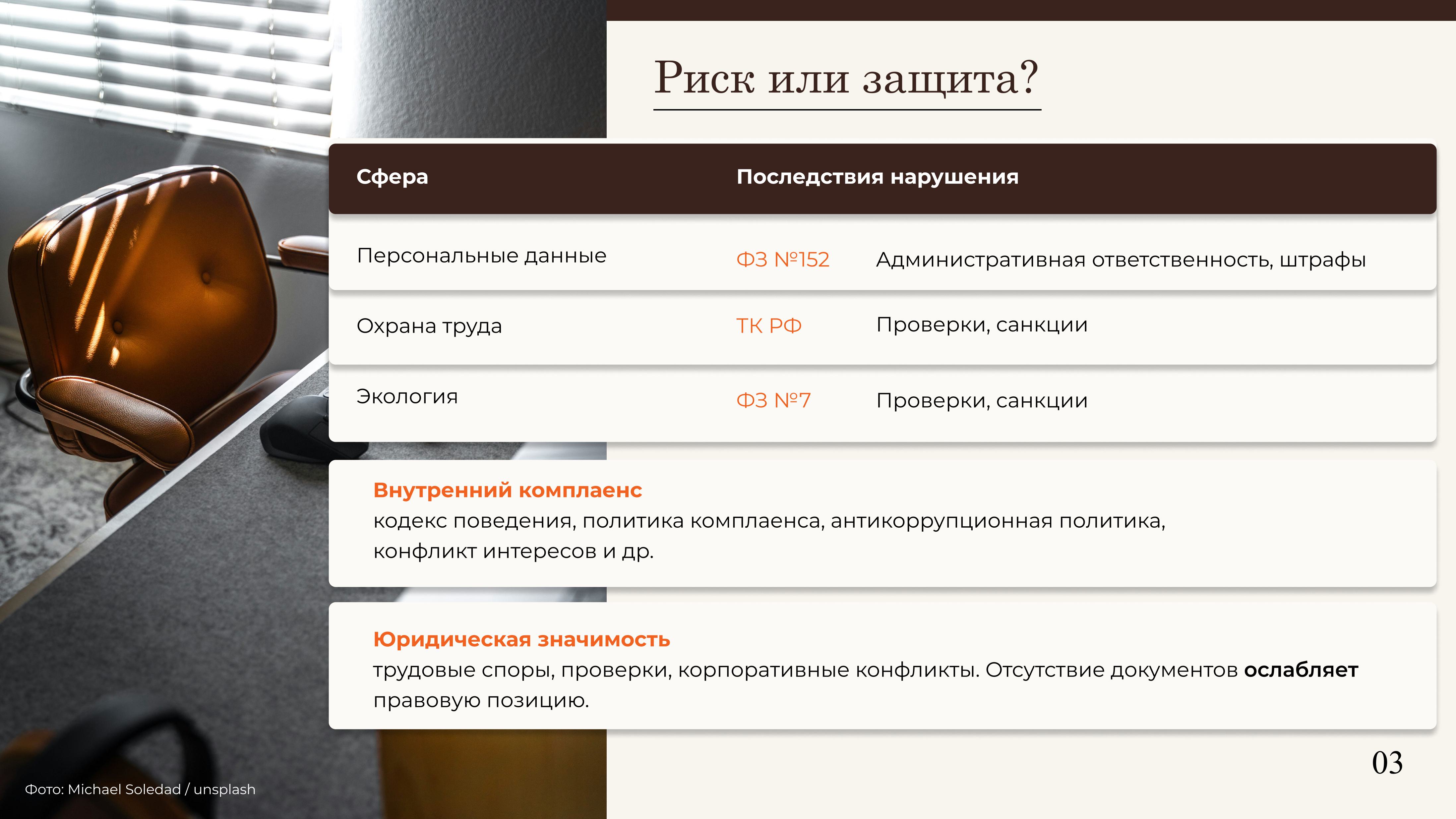 Риски в сфере персональных данных напрямую связаны с Федеральным законом от 27.07.2006 № 152-ФЗ «О персональных данных», нарушение которого влечёт административную ответственность и штрафы. Риски в сфере охраны труда регулируются Трудовым кодексом РФ (раздел X), а экологические риски – Федеральным законом от 10.01.2002 № 7-ФЗ «Об охране окружающей среды». Нарушения в этих сферах всё чаще становятся предметом как плановых, так и внеплановых проверок.