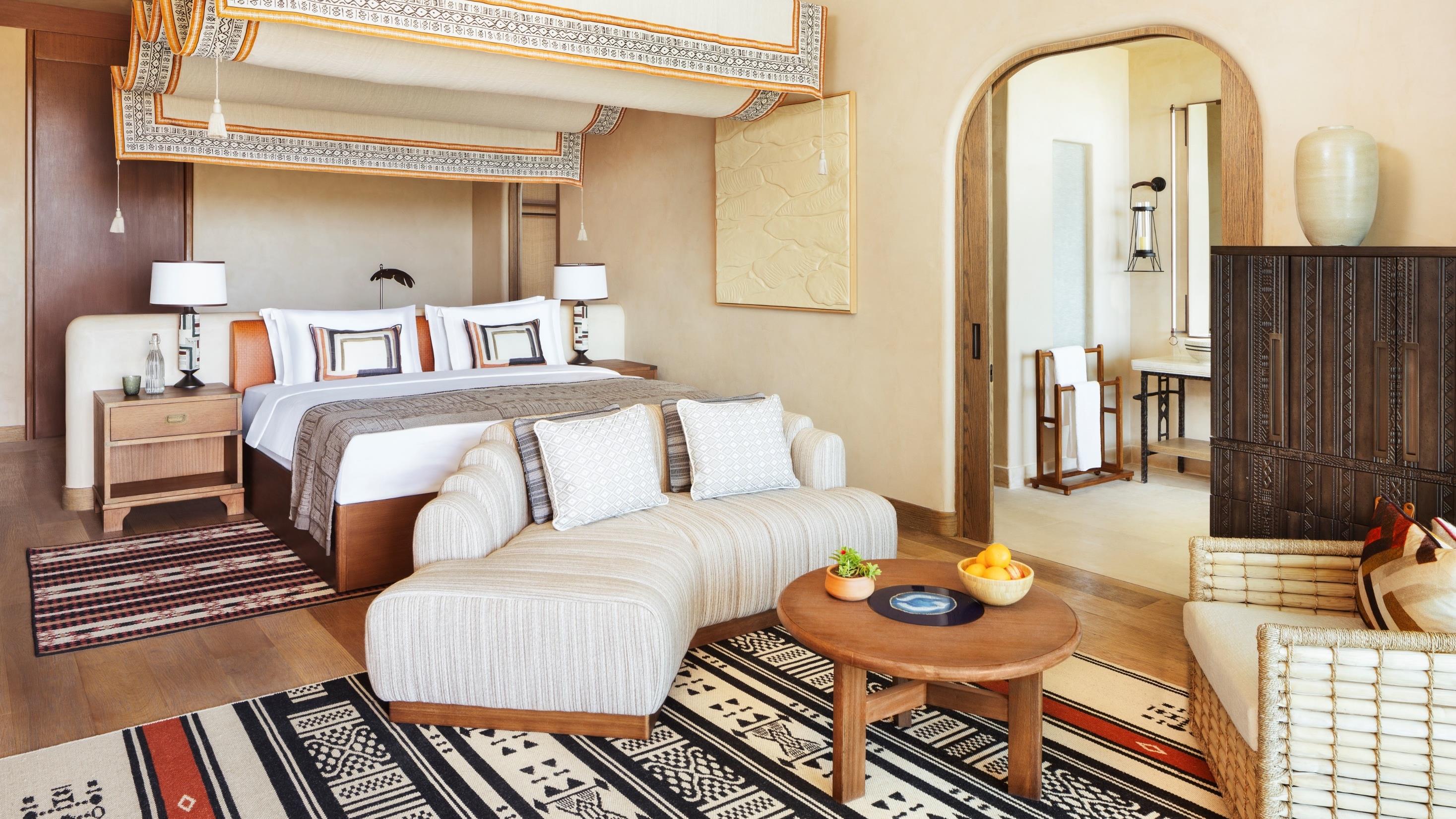 The St. Regis Red Sea Resort с архитектурой, повторяющей форму морских волн, и фирменным ритуалом — торжественным открытием шампанского саблей. Инфраструктура включает 5 ресторанов и доступ к крупнейшему в регионе дайвинг-центру.