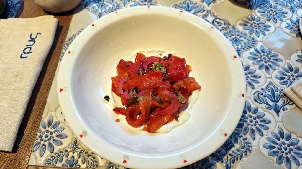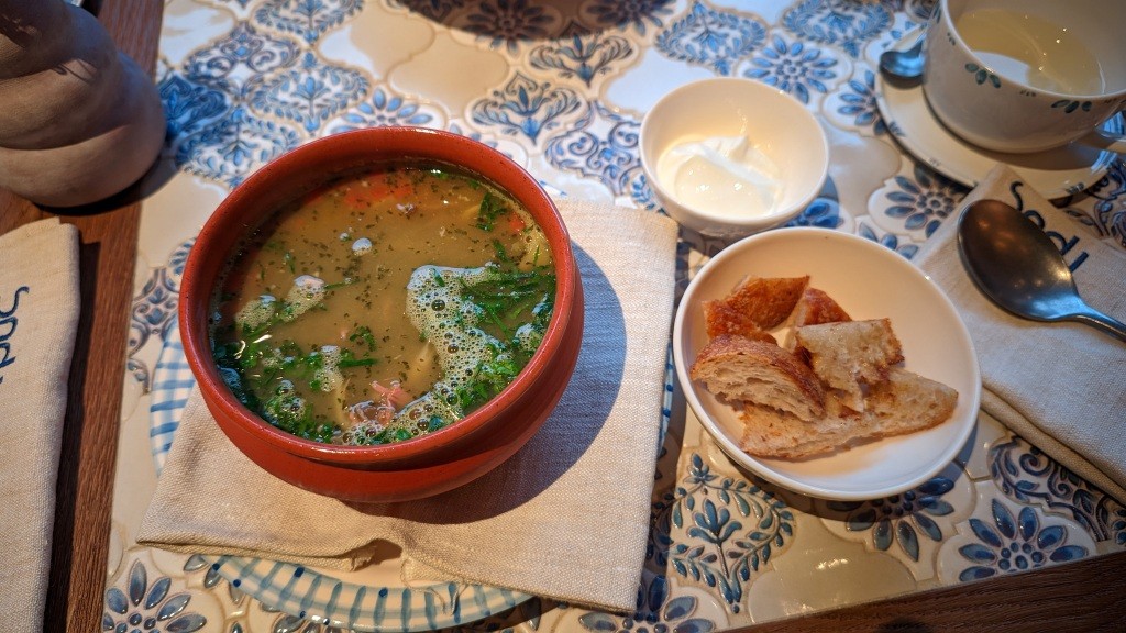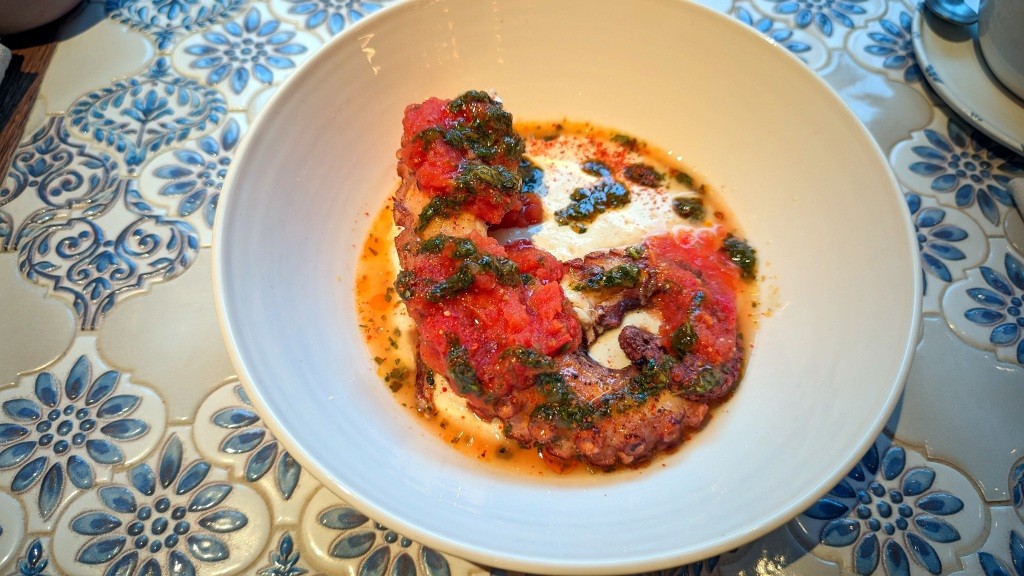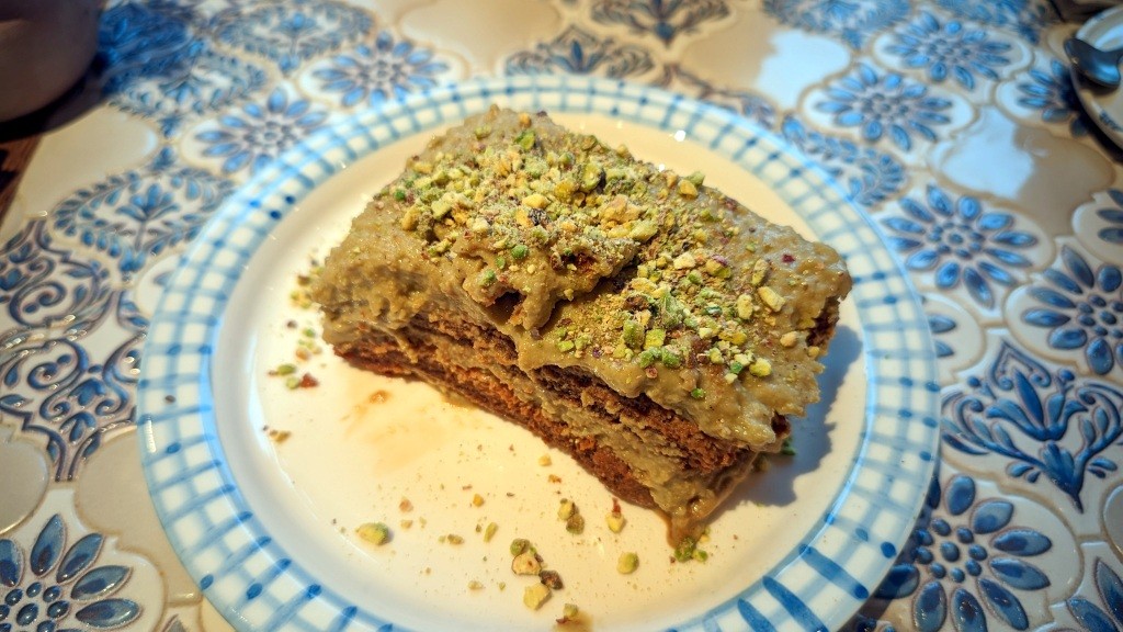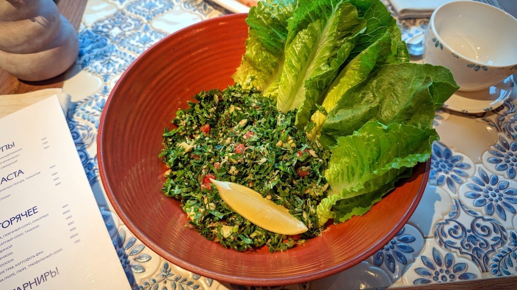 Огромная миска отменного табуле, где зелень с орехами, которых, кажется, больше, чем остальных частей. Или вот только по форме пиде с трюфелем и сморчками. Да, тесто мягкое, как добрый блин, но очень вкусно и толсто. И щедро: много сыра, трюфель, грибы — всё работает, взаимоусиливая вкус. «Мезе». Печёные перцы с анчоусом и лабне — большая порция — как салат средний сейчас в гастробистро — здоровская закуска за триста рублей! Пряный чечевичный суп с ягненком — прекрасен всем, это как минимум. Консистенция, баланс специй, травок, богатство, дорогая серьезность. Первая ошибка кухонная — плохо разогретая большая лапа осьминога с тахини и томатом, да еще и соус холоден! Срез внушительно диаметра шикарен фактурой, а не радует! Не пересол, как кажется, как уверен был первые две ложки, а это сыр фета, как творог в прослойках яркой ленивой лазаньи. Фисташковый тирамису, где много орехов, крупно тертых, где удовольствие, где роскошно пропитанные савоярди — этот срез источает блеск лучшего, когда ДО пробы ставишь зачёт.