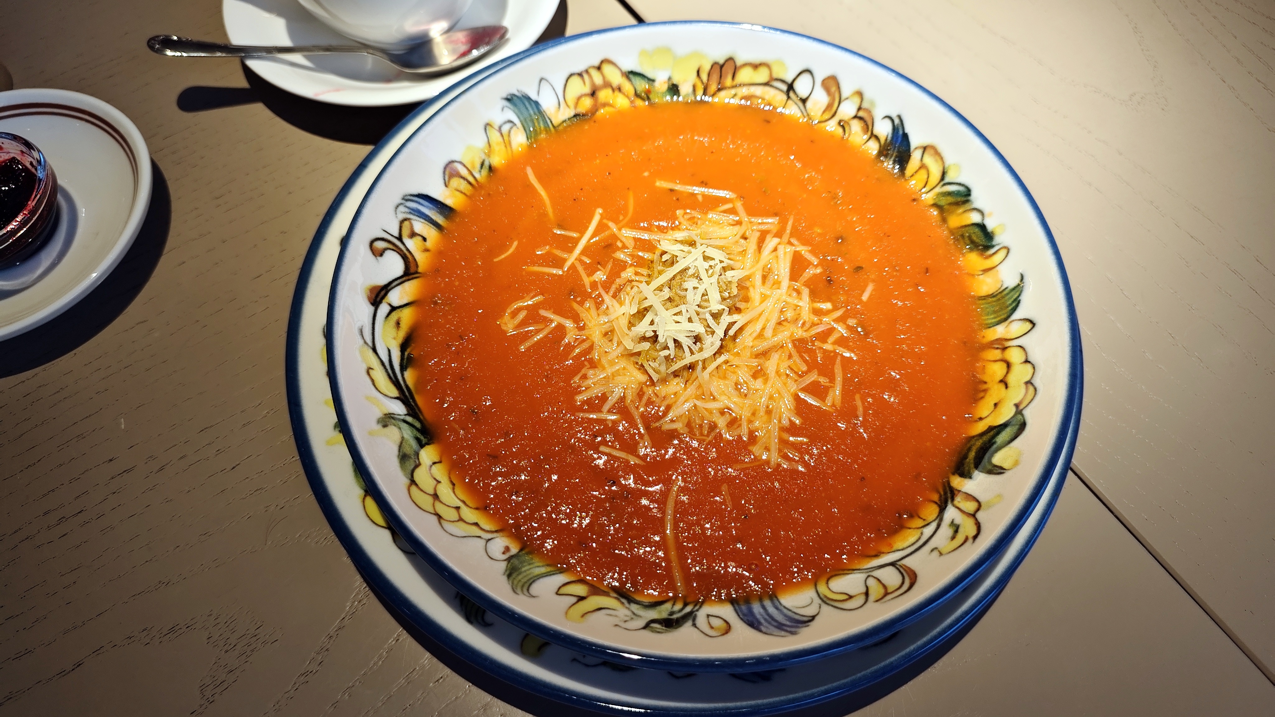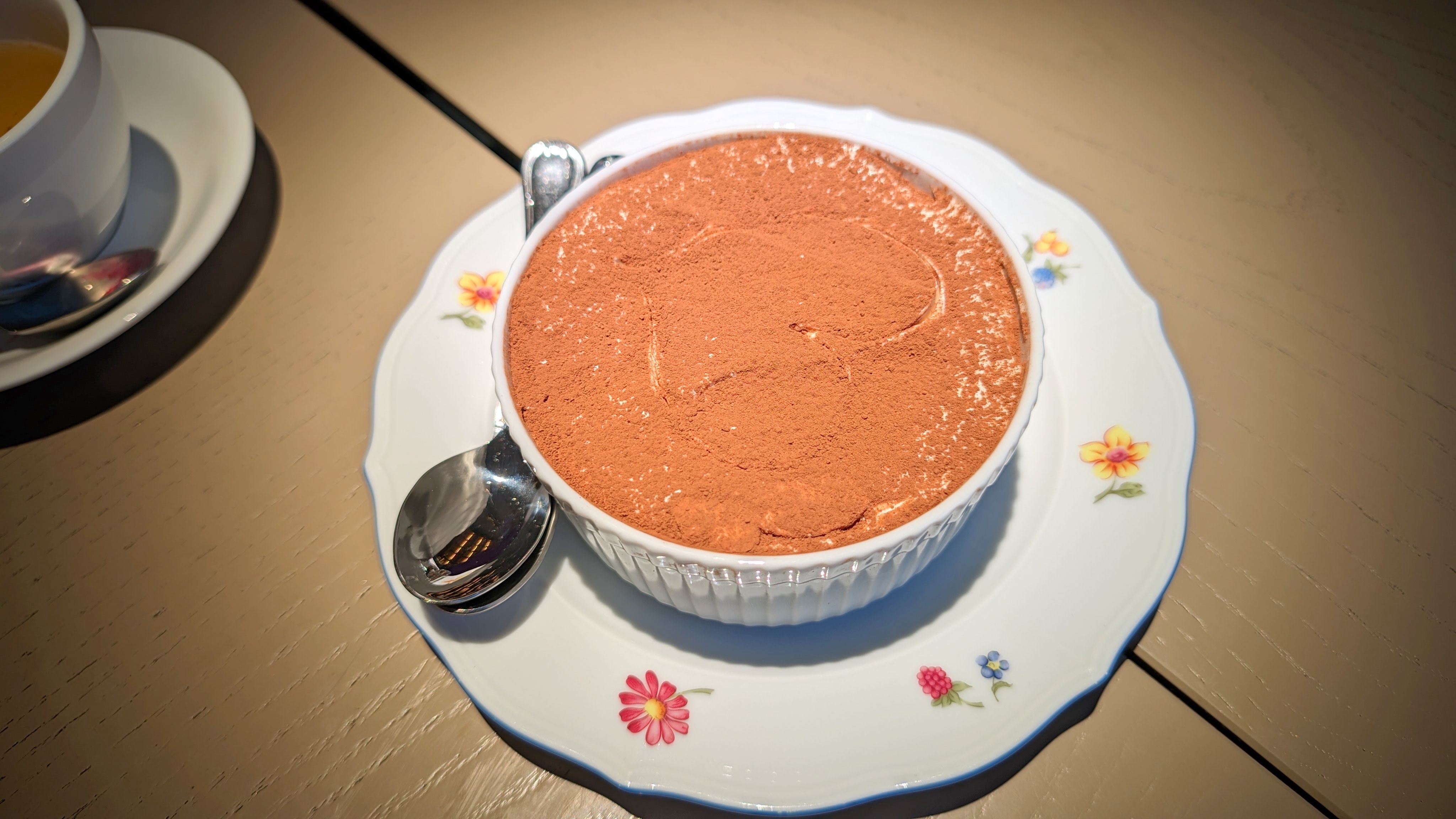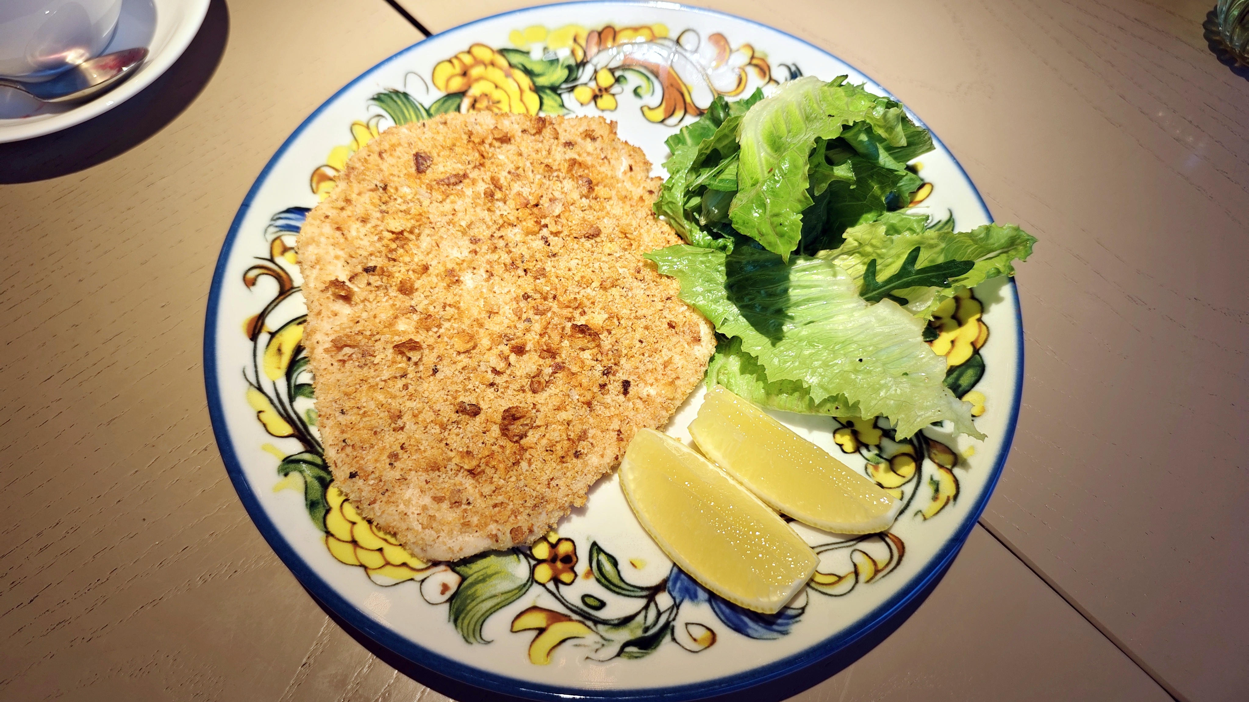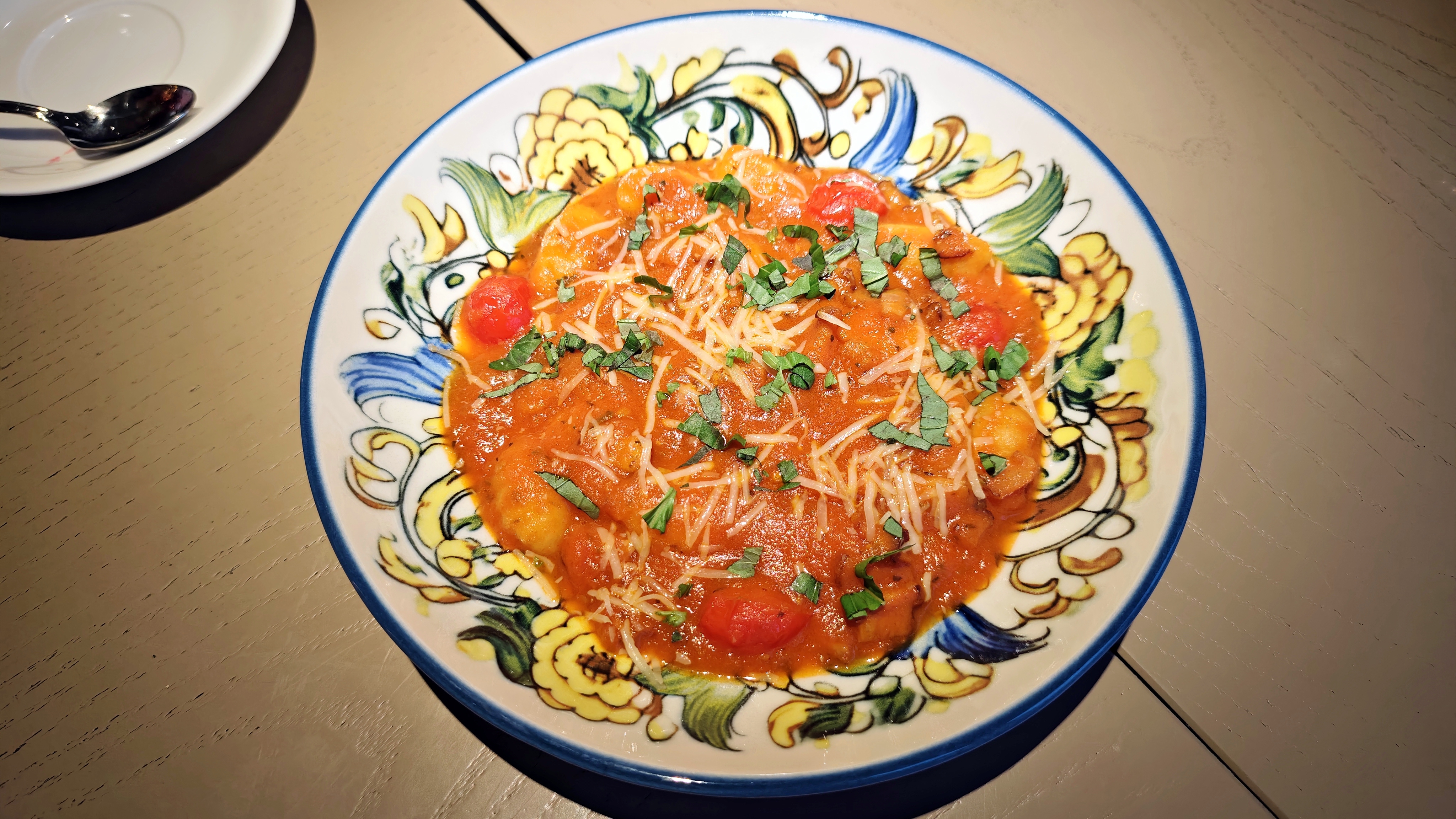 В копилку плюсов Томатный суп — приготовили замечательно, еще и снабдили неожиданной столовой ложкой мясного фарша. Соуса в Ньокках чуть больше привычного, но когда он хороший, когда кусочки, палочки обжаренной панчетты так заметны, еще один вклад в копилку хорошего. Фасад — умелая обманка Курицы по-милански — если хотел повар имитировать самое сухое блюдо из возможного, присыпав крошкой, у него вышло гениально! Но внутри прекрасная, смело приправленная курица! Комплементом, за ошибки, принесли Тирамису, что очень интересно сделан: классика, вроде, пропитки полно и больше, а остаются совсем небольшие фрагменты хрустящего савоярди. В любом случае, за подарки не ругаем!
