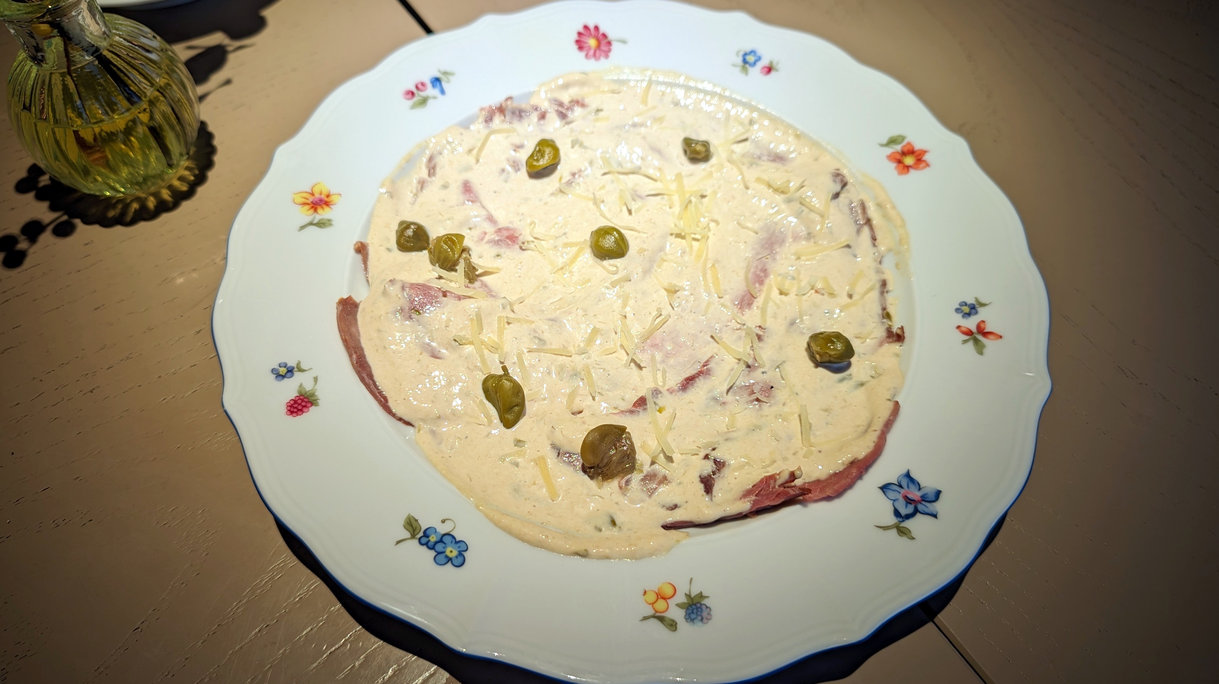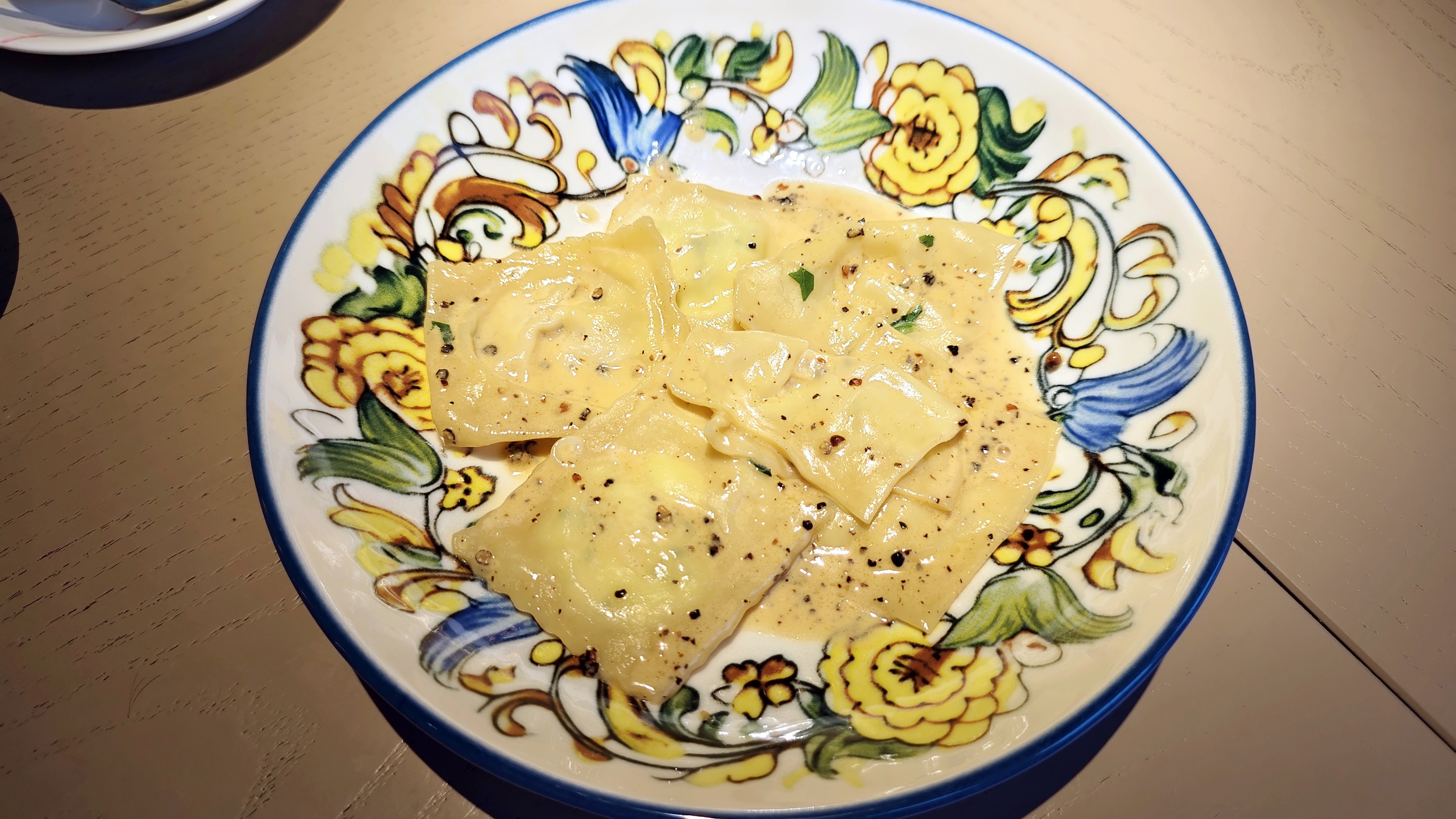 При этом нет скидок тестовых на открытие, нет скидок дневных или комплементов, даже в виде воды или хлеба. Сервис начинает странно. Молодой человек спокоен, уверен, не суетится. Принимая заказ, начинает продажи, четыре штуки, как по мне, совершенно нелогичные. Потом, после первых пяти минут, всё очень неплохо, даже скажу так: прекрасно выкрутились из дурной ситуации, что не стала по итогу большим минусом. Салат с кальмаром — это скромный один капюшон и салатик рядом, как гарнир, на небольшой плоской тарелочке. Ничего плохого, но где 200 граммов и где ресторанность? Вителло тоннато, где сыр совсем не нужен, тем более такой, но сделано качественно, все части блюда с праздником как ингредиент! А вот равиоли с соусом качо е пеппе — тут совсем не знаю, какая была идея: квадратики с сыром — принесли часть рваных, часть просто пустых, что в центре тоньше бортов. Ни один не ел — вернул. Блюда в счёте нет.