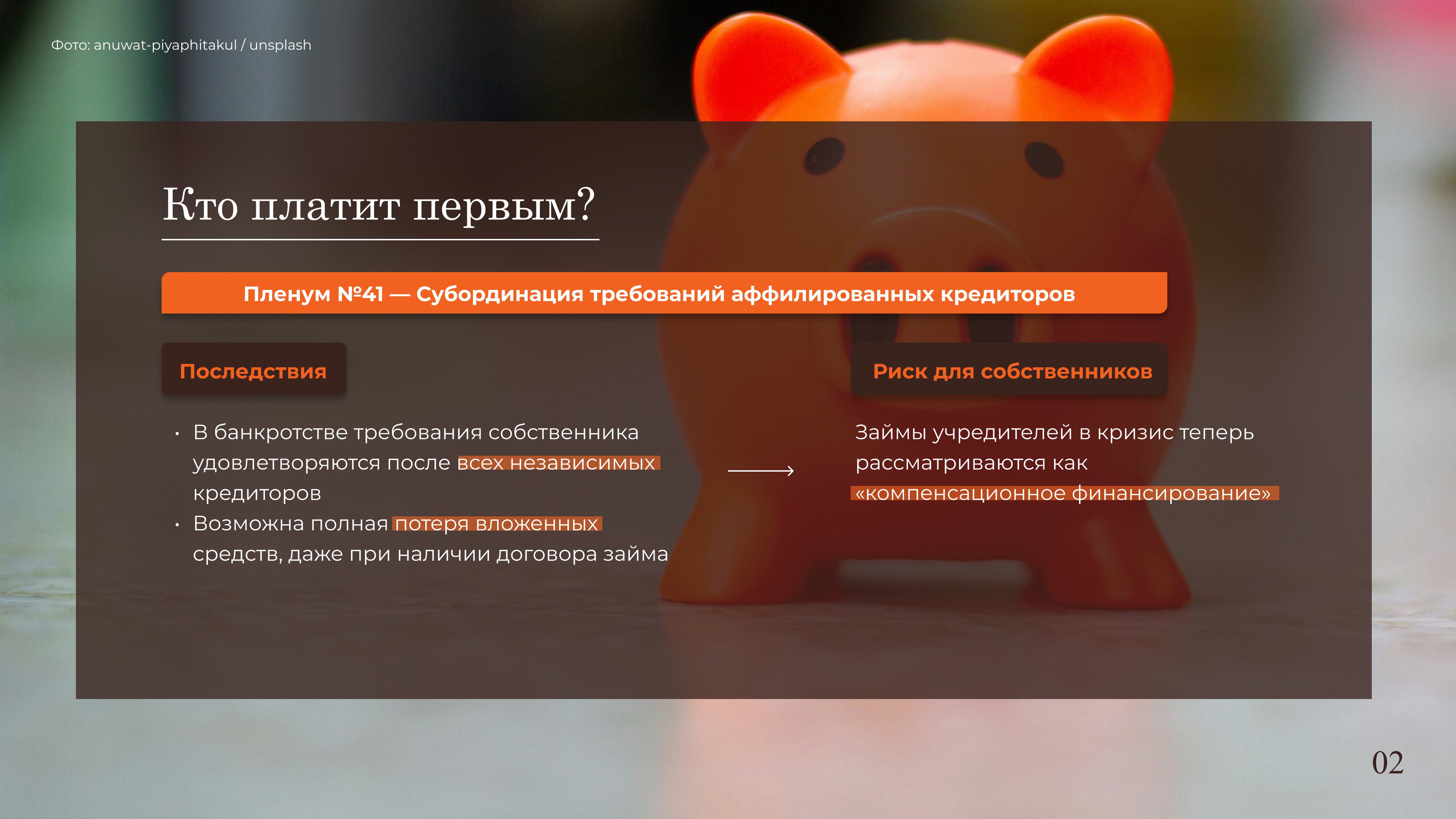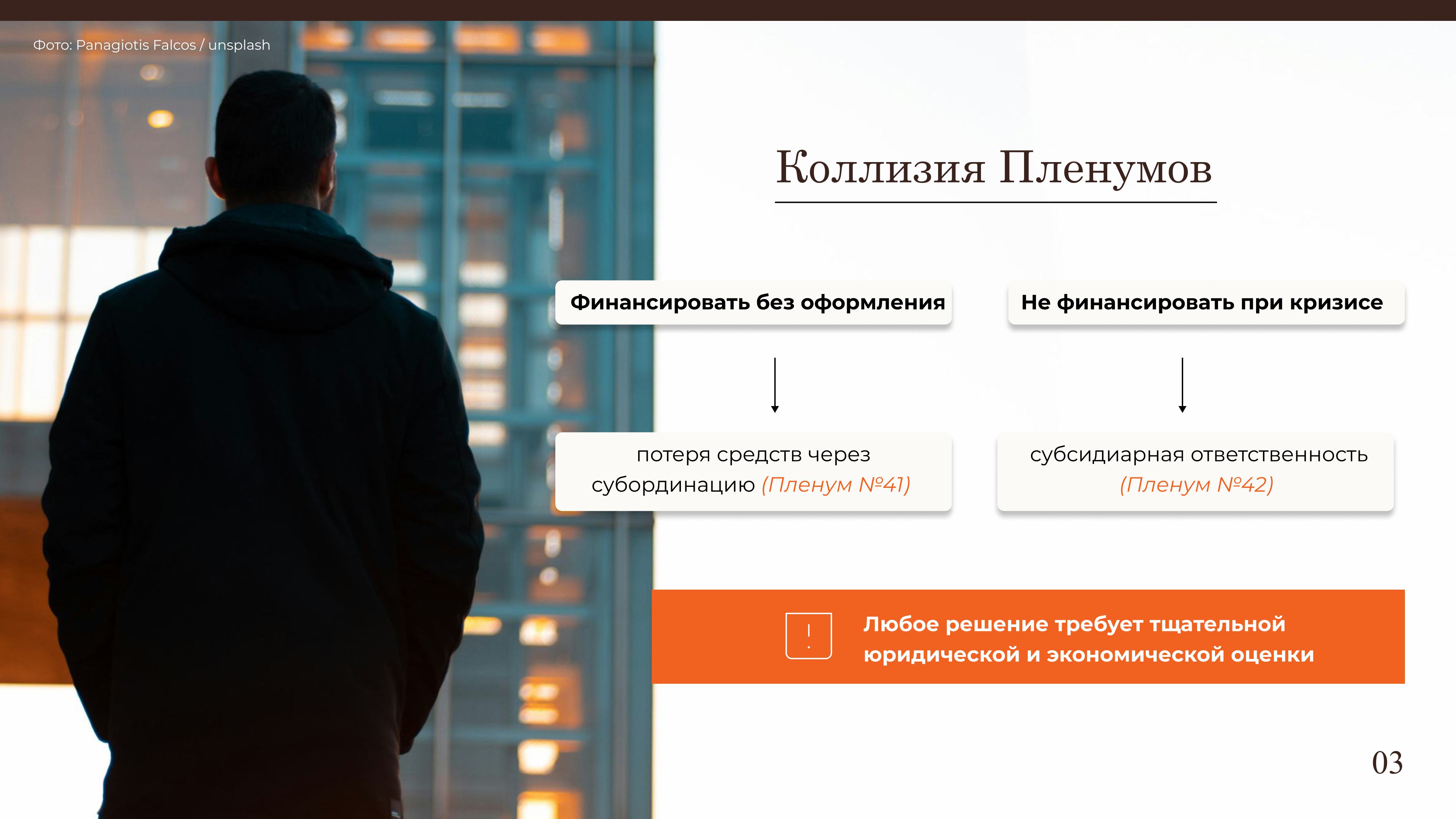 Совокупное применение двух Пленумов ставит бенефициара в ситуацию жесткого правового выбора.:- Отсутствие финансирования при признаках кризиса ведет к субсидиарной ответственности за неподачу заявления о банкротстве (Пленум № 42).