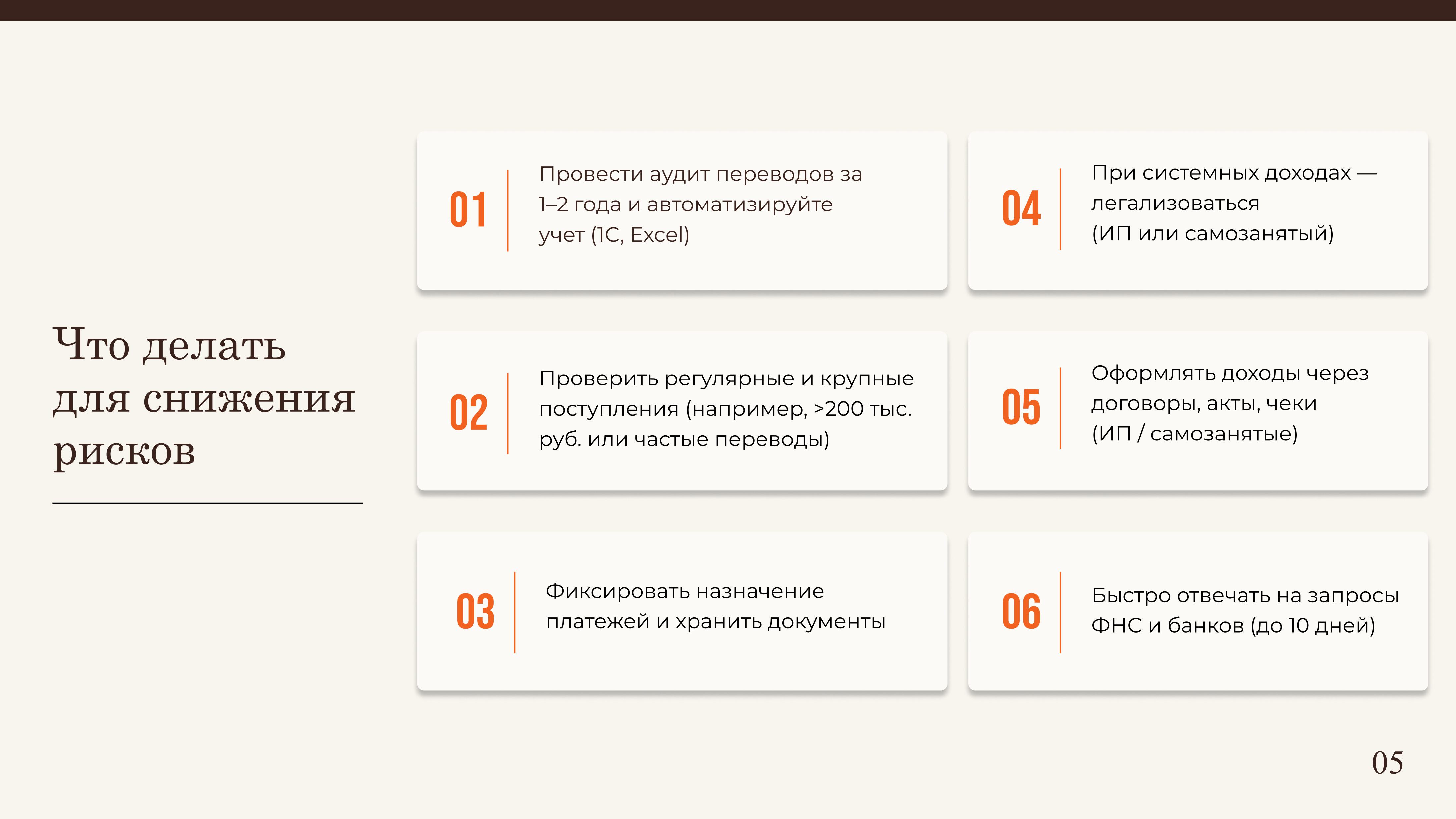 - Проведите внутренний аудит переводов физлицам за 1-2 года: выявите регулярные поступления без договоров или пометки "подарок";