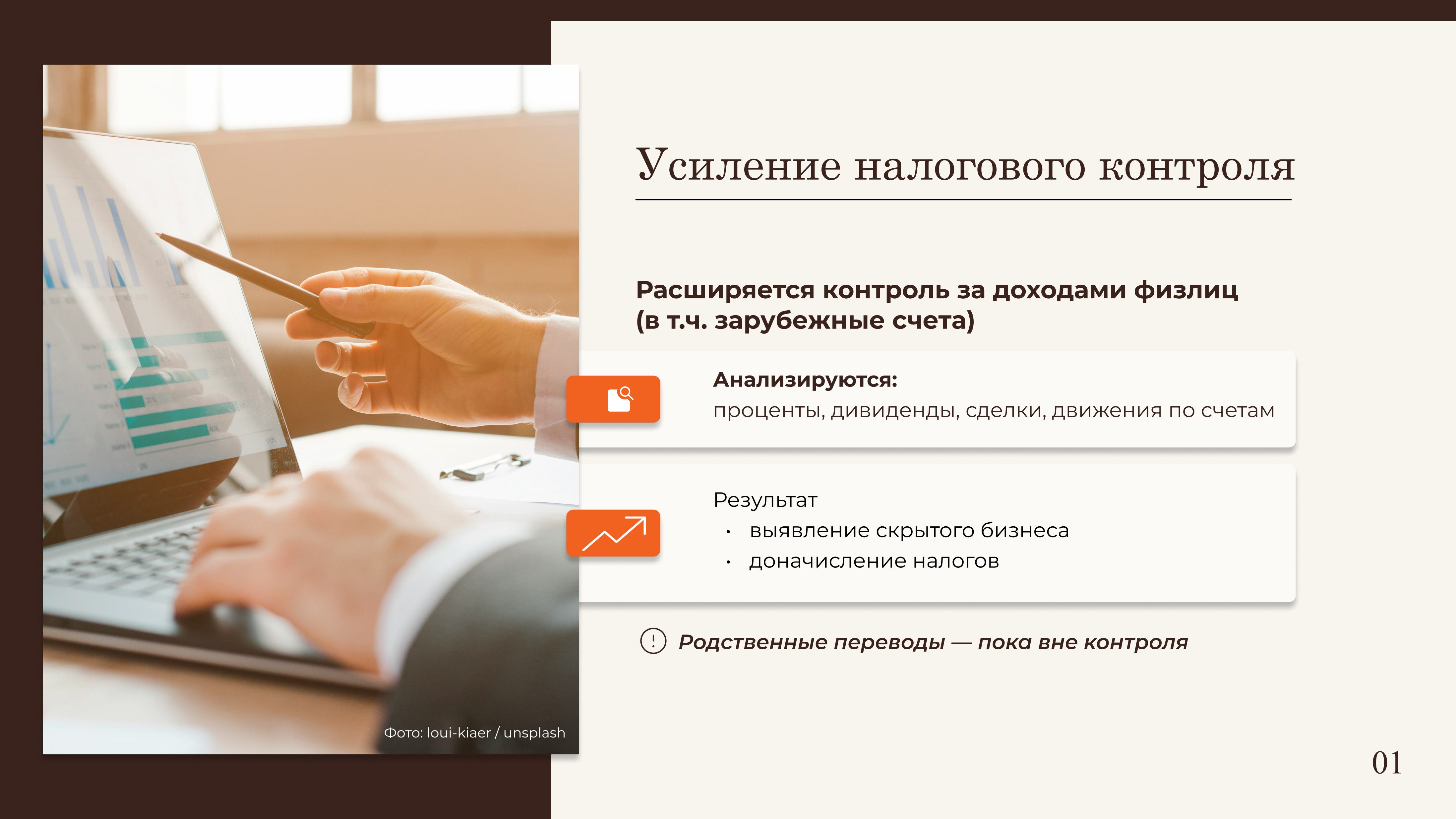 Налоговые органы уже усилили контроль за доходами россиян на зарубежных счетах в рамках автообмена между странами, все чаще поступают дополнительные запросы от банков и самих налоговых органов. Важно, что налоговый контроль уже затрагивает не только крупный сегмент, он становится все шире. С помощью отработанных на бизнесе программ и алгоритмов налоговые органы анализируют доходы и расходы, в том числе проценты по вкладам, купоны и дивиденды по ценным бумагам, прибыль от продажи финансовых активов, поступления и расходования средств на счетах и многие другие факторы.