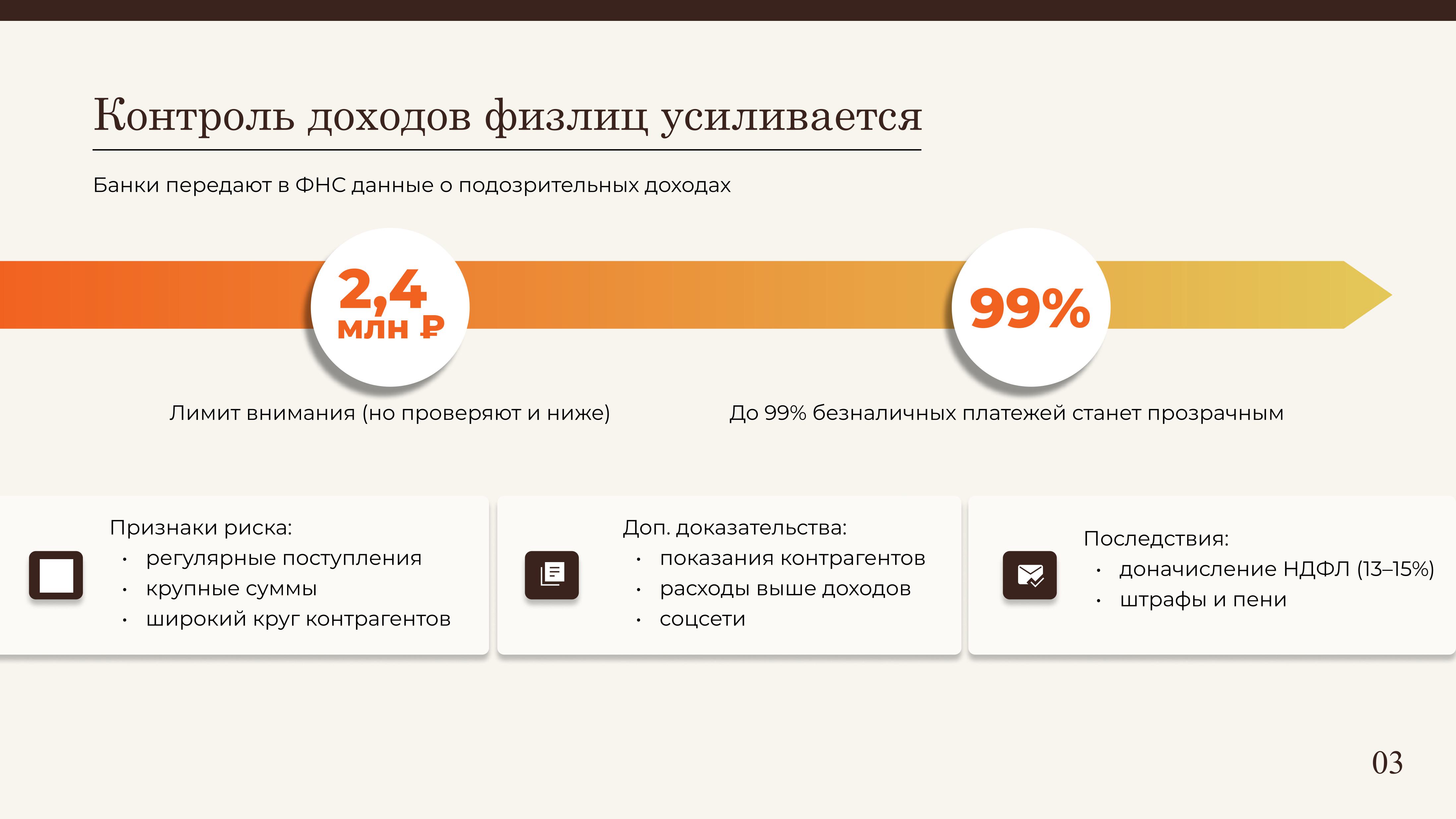 Банки обяжут передавать в ФНС информацию о физических лицах, в отношении которых выявлены риски ведения предпринимательской деятельности (получение систематического дохода). Ключевой параметр контроля — лимит в 2,4 млн рублей незадекларированного годового дохода (это одновременно максимальный доход самозанятого и предельный размер дохода для минимальной ставки НДФЛ 13%). Однако систематическое получение дохода ниже данного лимита не означает, что налоговые органы упустят вас из внимания. По оценкам Минфина, новый механизм обмена позволит обеспечить прозрачность до 99% безналичных платежей.