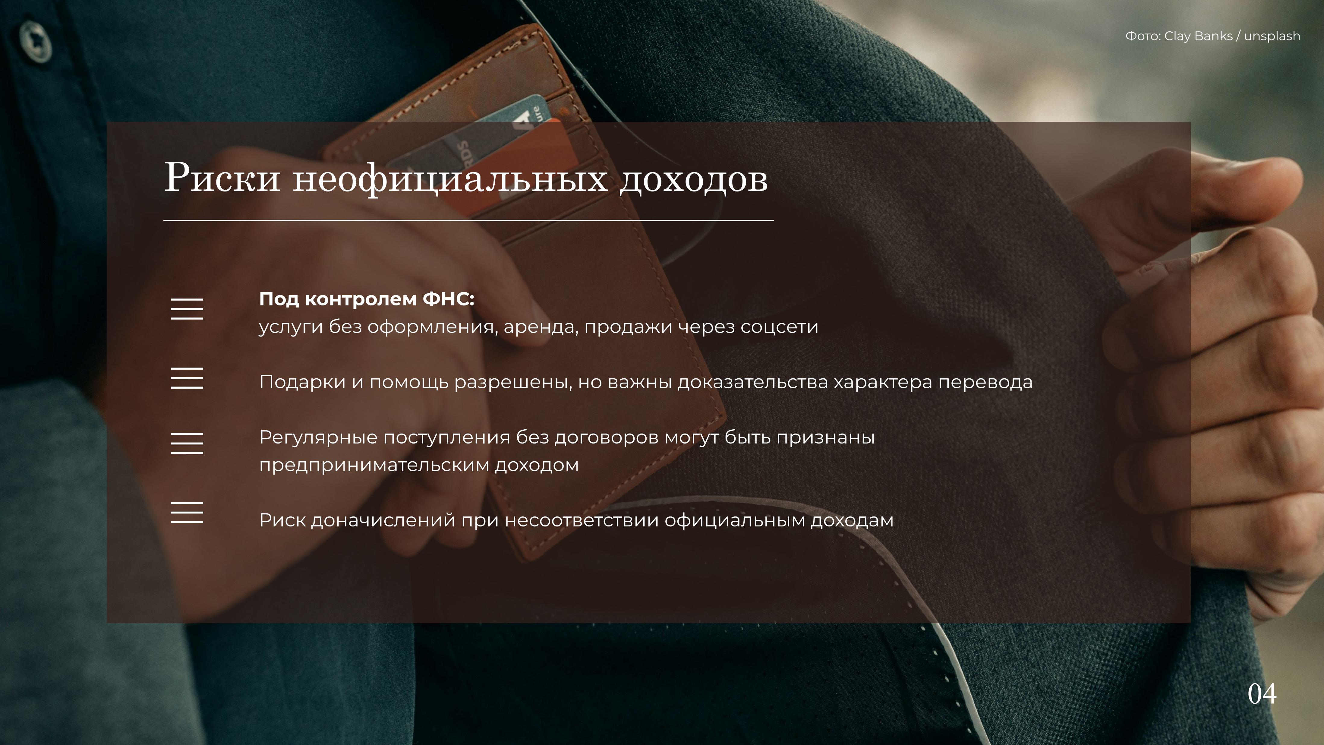 Среди секторов, попадающих под внимание, я бы выделила: неофициальное оказание услуг (косметологи, репетиторы, психологи, грумеры и проч.), сдача имущества в аренду, торговля товарами, в том числе через соцсети. При этом не вводится запрет на перевод денежных средств в качестве подарков, финансовой помощи, — значение приобретает доказывание.