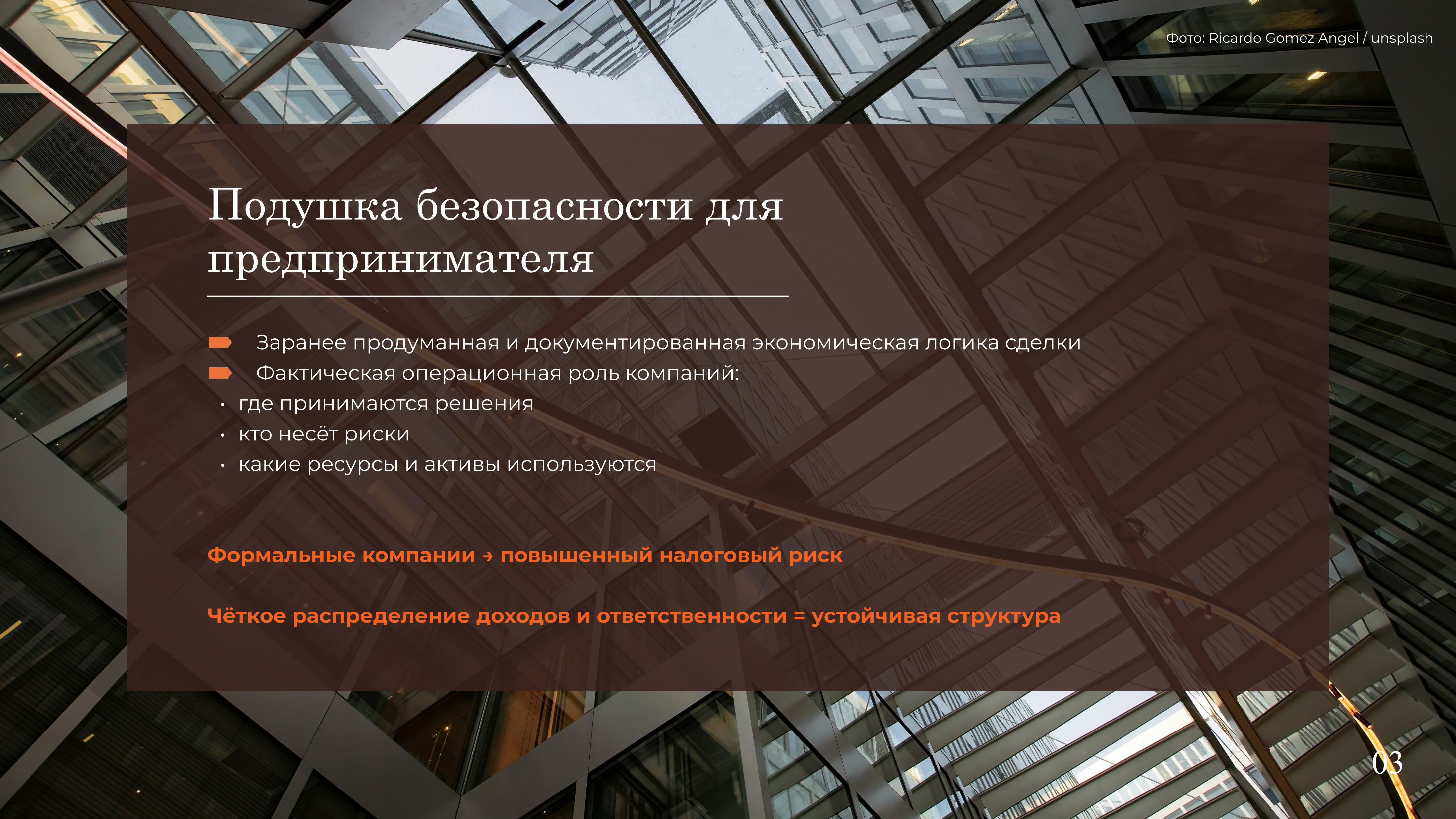 Главная «подушка безопасности» для каждого предпринимателя — заранее продуманная и документально подтверждённая экономическая логика сделки. Налоговые органы при проверках анализируют не только «бумаги», но и фактическое поведение сторон, например: где принимаются управленческие решения, кто несёт риски, располагают ли компании персоналом, активами и ресурсами, и так далее. Использование формальных компаний рассматривается как фактор повышенного налогового риска. На практике именно отсутствие собственной операционной роли у отдельных звеньев структуры чаще всего становится аргументом для переквалификации сделок. Устойчивая структура, напротив, предполагает, что каждая компания выполняет понятную роль, а распределение доходов соответствует распределению рисков и ответственности.