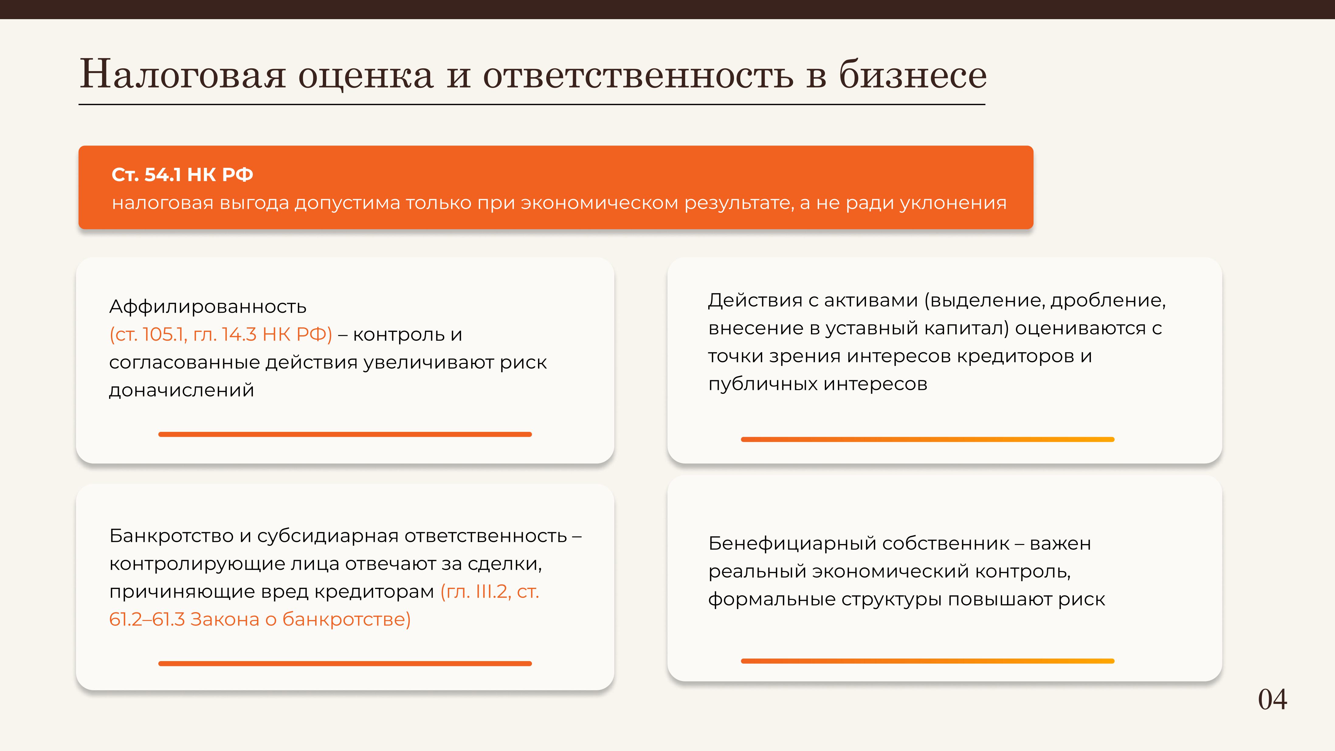 Что же касается аффилированности, ВС РФ неоднократно подчёркивал, что при наличии контроля или согласованных действий между участниками группы правовые последствия оцениваются исходя из их совокупного поведения. То есть, дробление бизнеса, перераспределение выручки или активов между взаимозависимыми лицами без объективных экономических причин с высокой вероятностью может быть признано незаконным. Важно помнить, что передача имущества, выделение или разделение компаний, внесение активов в уставный капитал оцениваются с точки зрения их влияния на интересы кредиторов и публичные интересы. Если такие действия совершаются на фоне ухудшения финансового положения, они могут быть расценены как действия, направленные на вывод активов. Это, в свою очередь, является основанием для оспаривания сделок и налоговых доначислений.