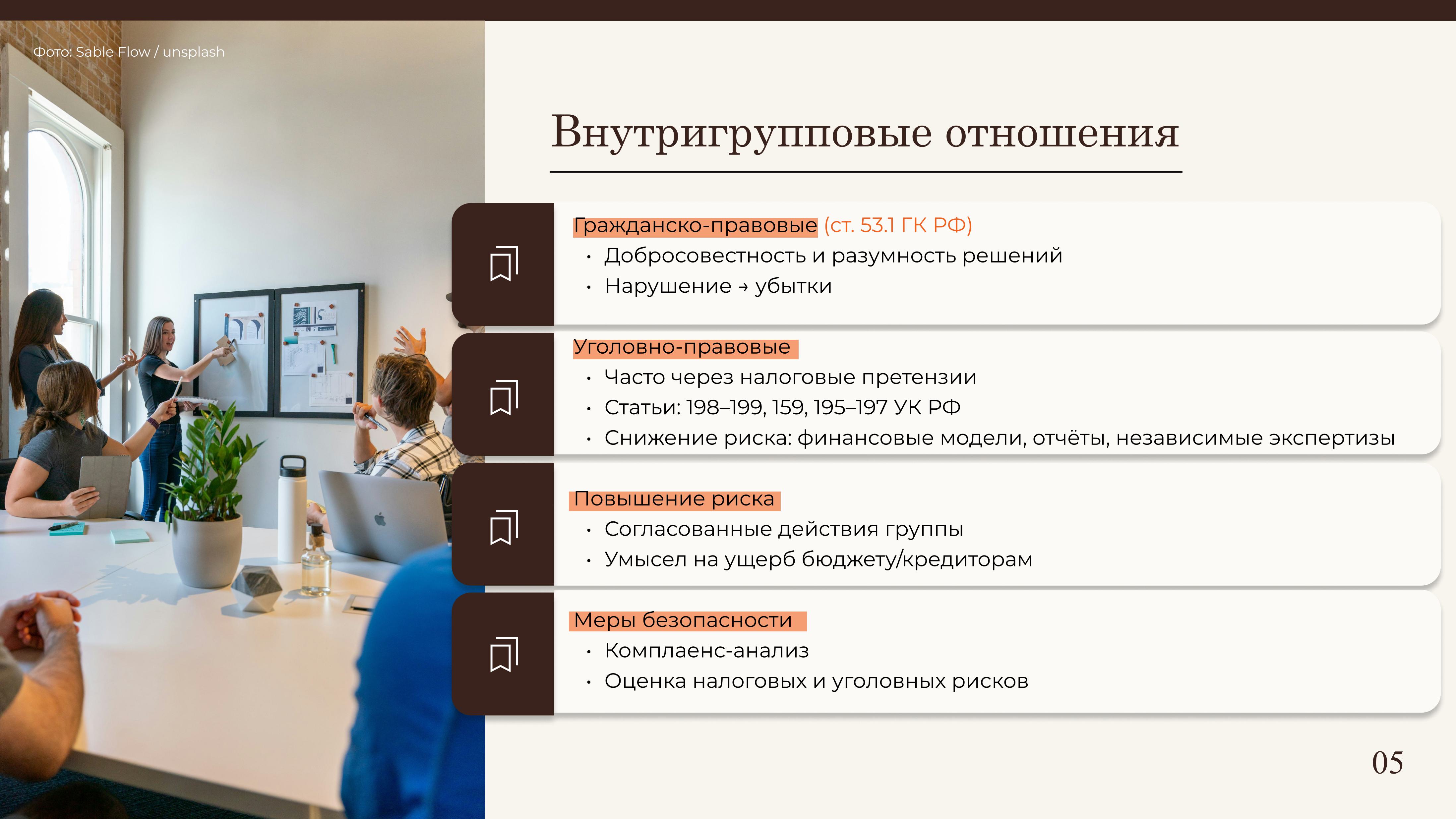 Особое место занимают уголовно-правовые риски. Практика показывает, что формальным поводом для этого чаще всего служат налоговые претензии. Наличие заранее подготовленных финансовых моделей, расчётов, отчётов оценщиков и заключений независимых консультантов существенно снижает вероятность того, что хозяйственные решения будут признаны фиктивными.
