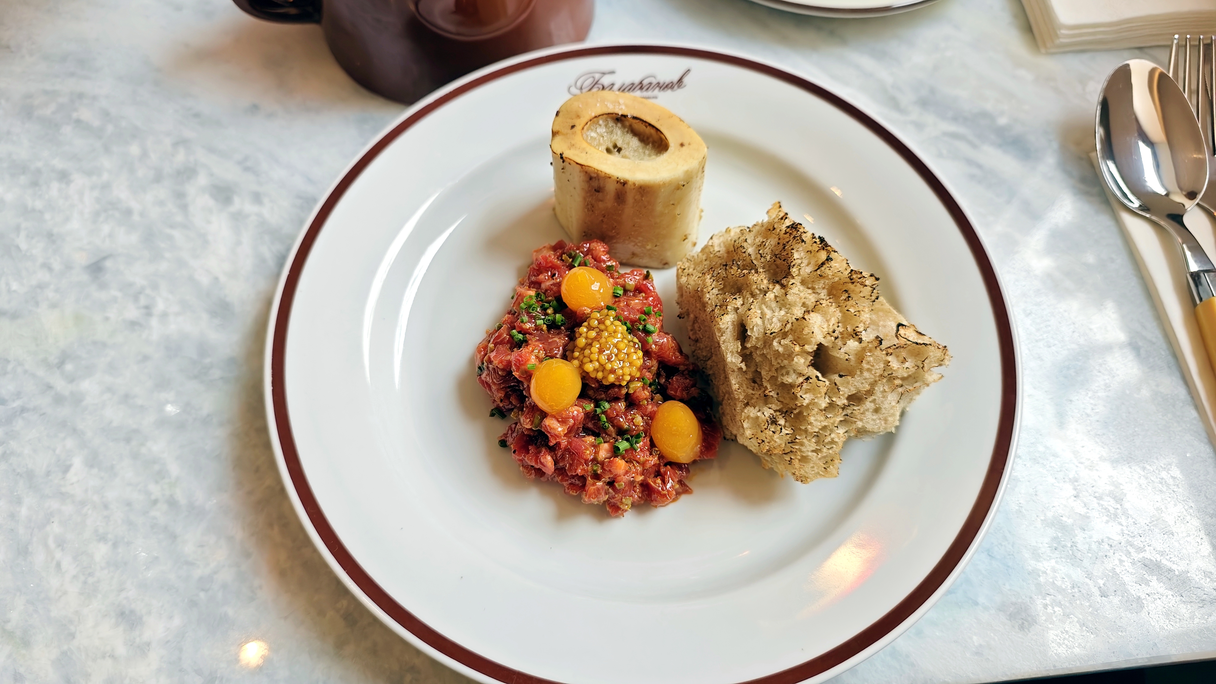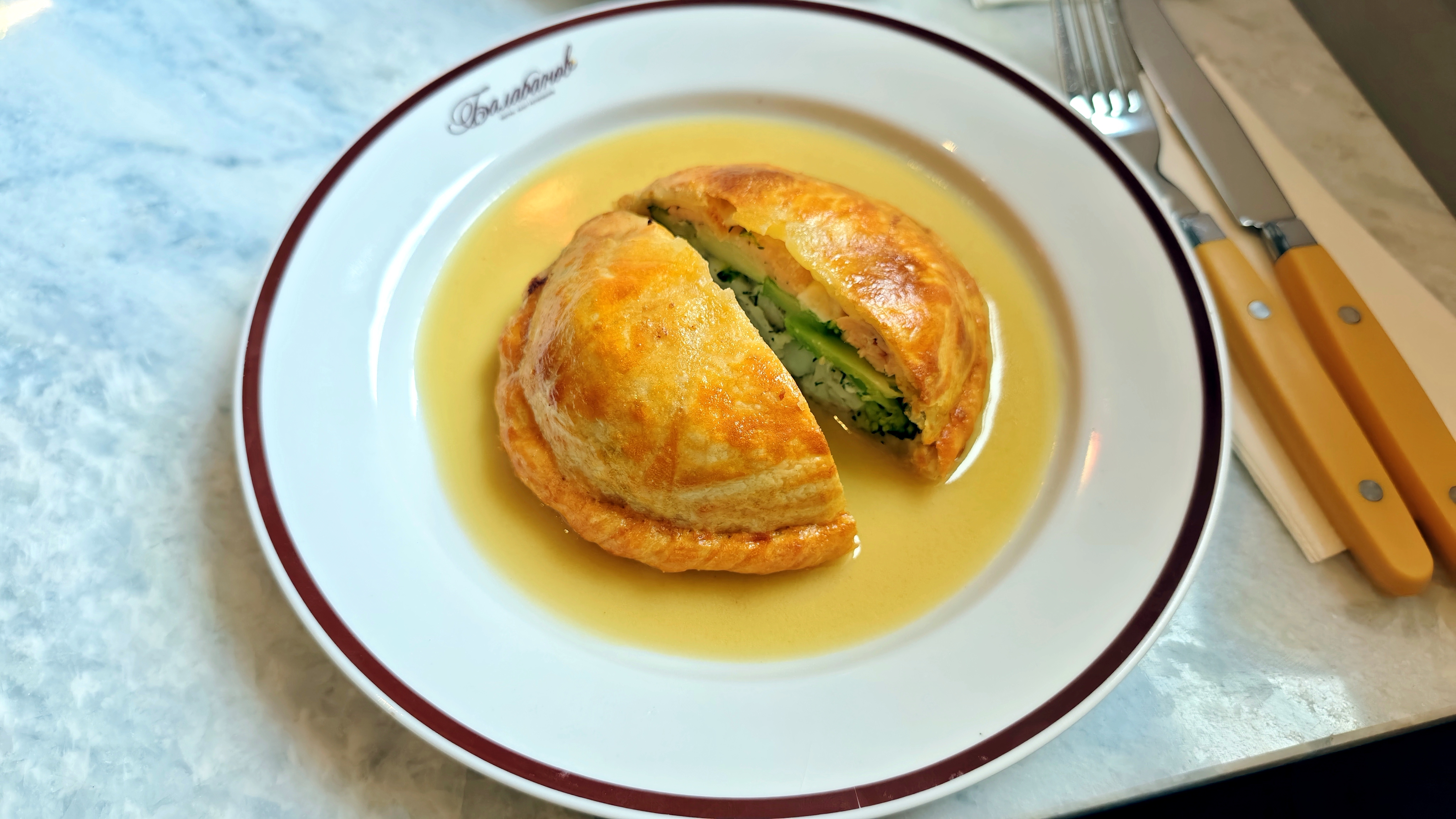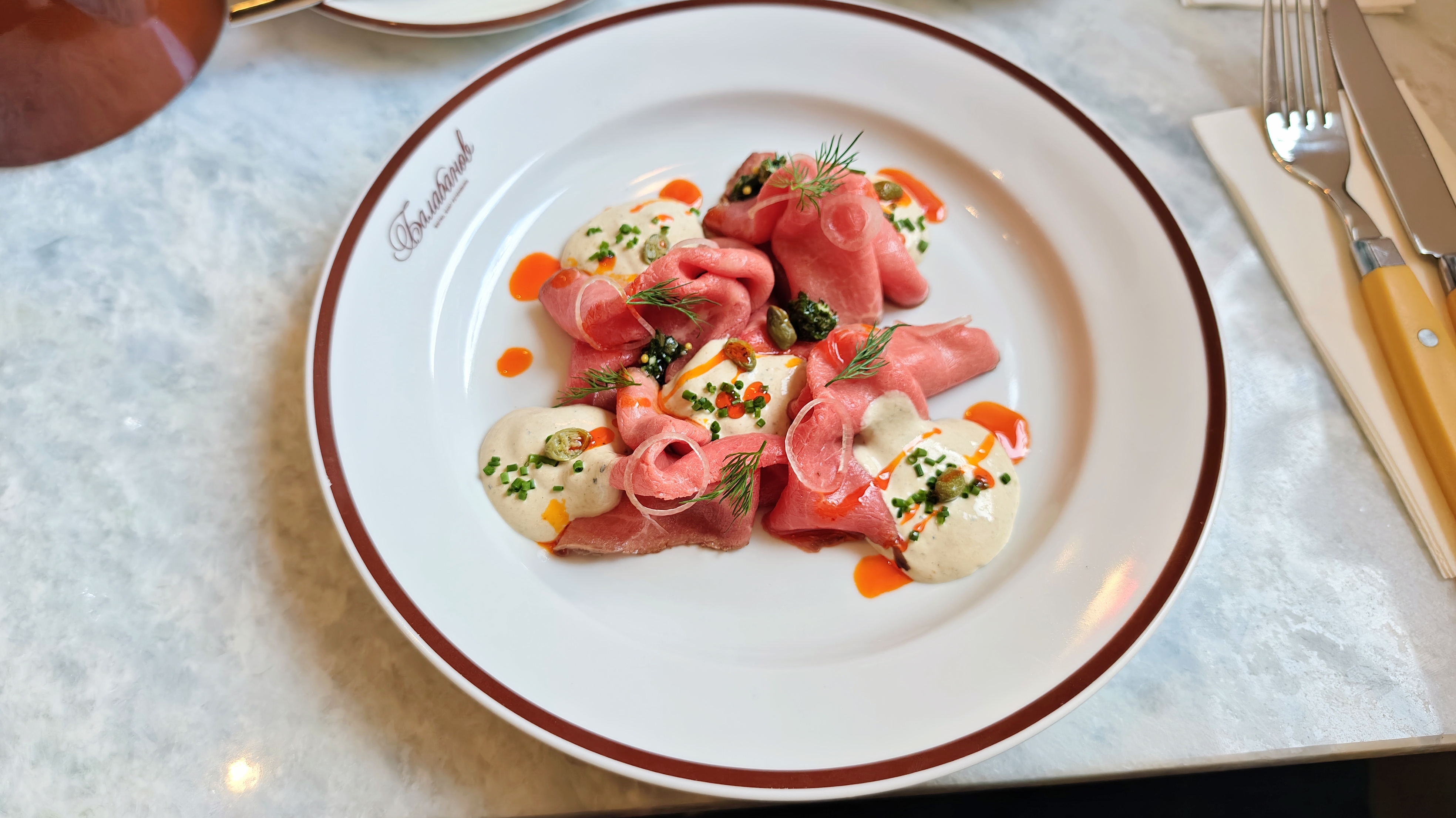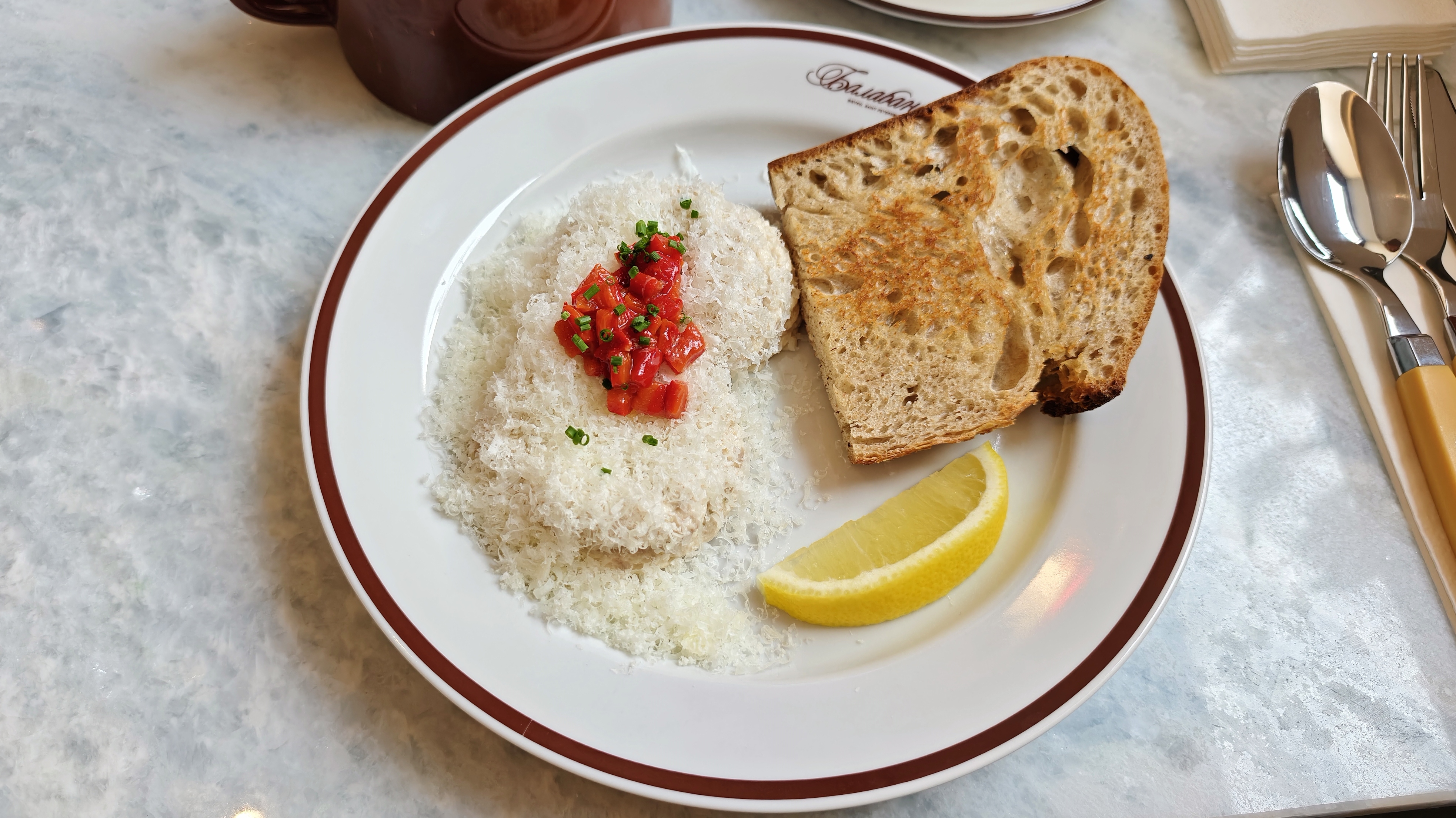 Я бы принял на проработках тартар из говядины с костным мозгом: классика замеса с горчичным зерном, в меру жирного мозга из удобной кости. Видели, знаем про эту игру — самый сочный, как только что сделали, ростбиф с соусом из шпрот — ничего сложного, но отменно сделано. Зачетный рийет из леща с пармезаном — как из просто какой-то копчёной рыбы. Гороховый суп с копчёностями — густой, мощный, недетский, смелый, с доброй, честной массой и аль денте бодрым горохом. Как блюдо Говядина с белыми грибами на горячее — это совсем крохотный кусок мяса толщиной меньше мизинца. С другой стороны, это стейковое мясо, приготовленное в медиуме. Пирог с рыбой, где в слоях цельные филе, третья часть — брокколи, но так органично введена, легка, что не рушит впечатление «рыба-рыба». Только вот не радует совсем жидкий соус: на беарнез не похож, мало пристаёт к еде.