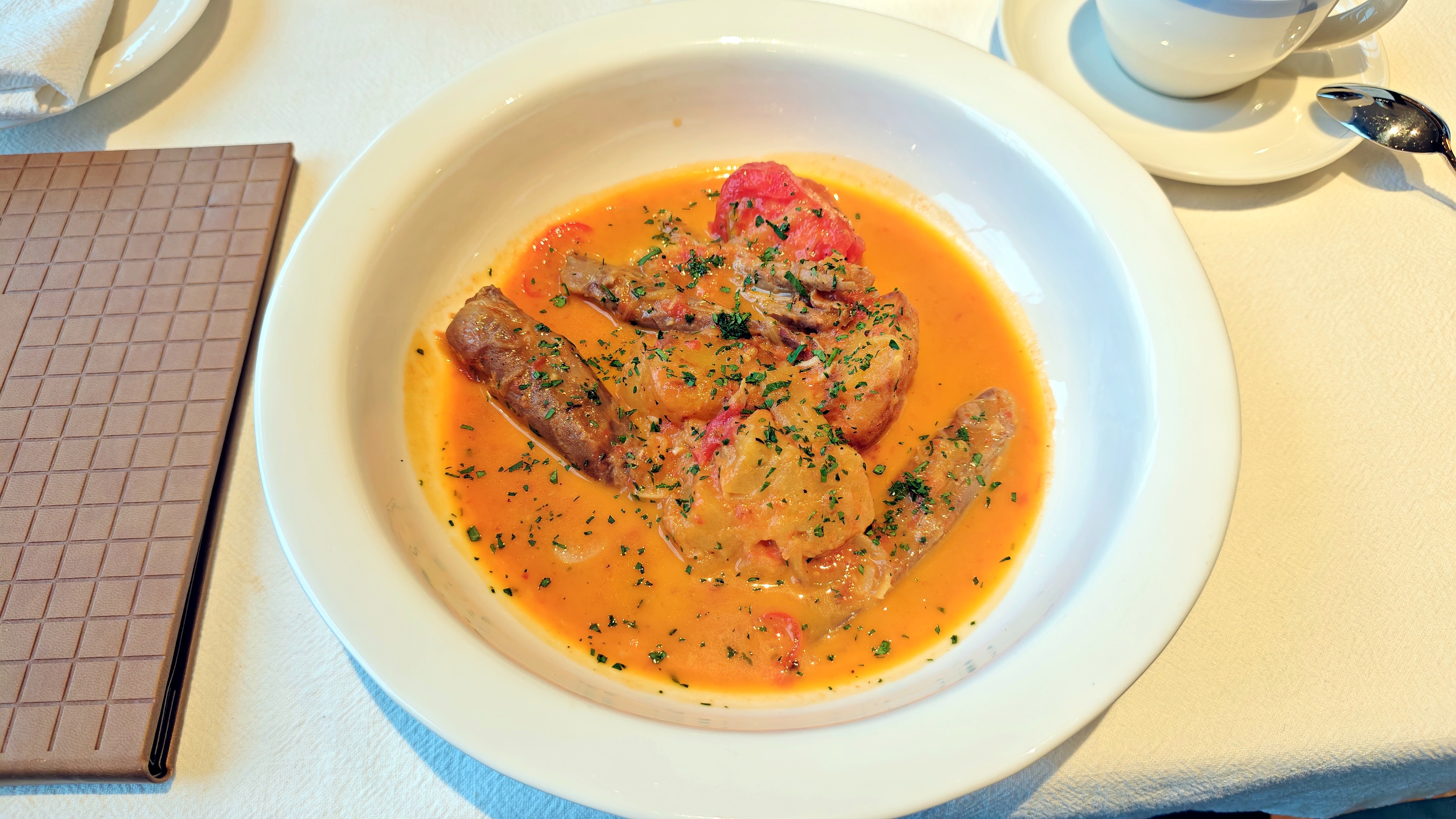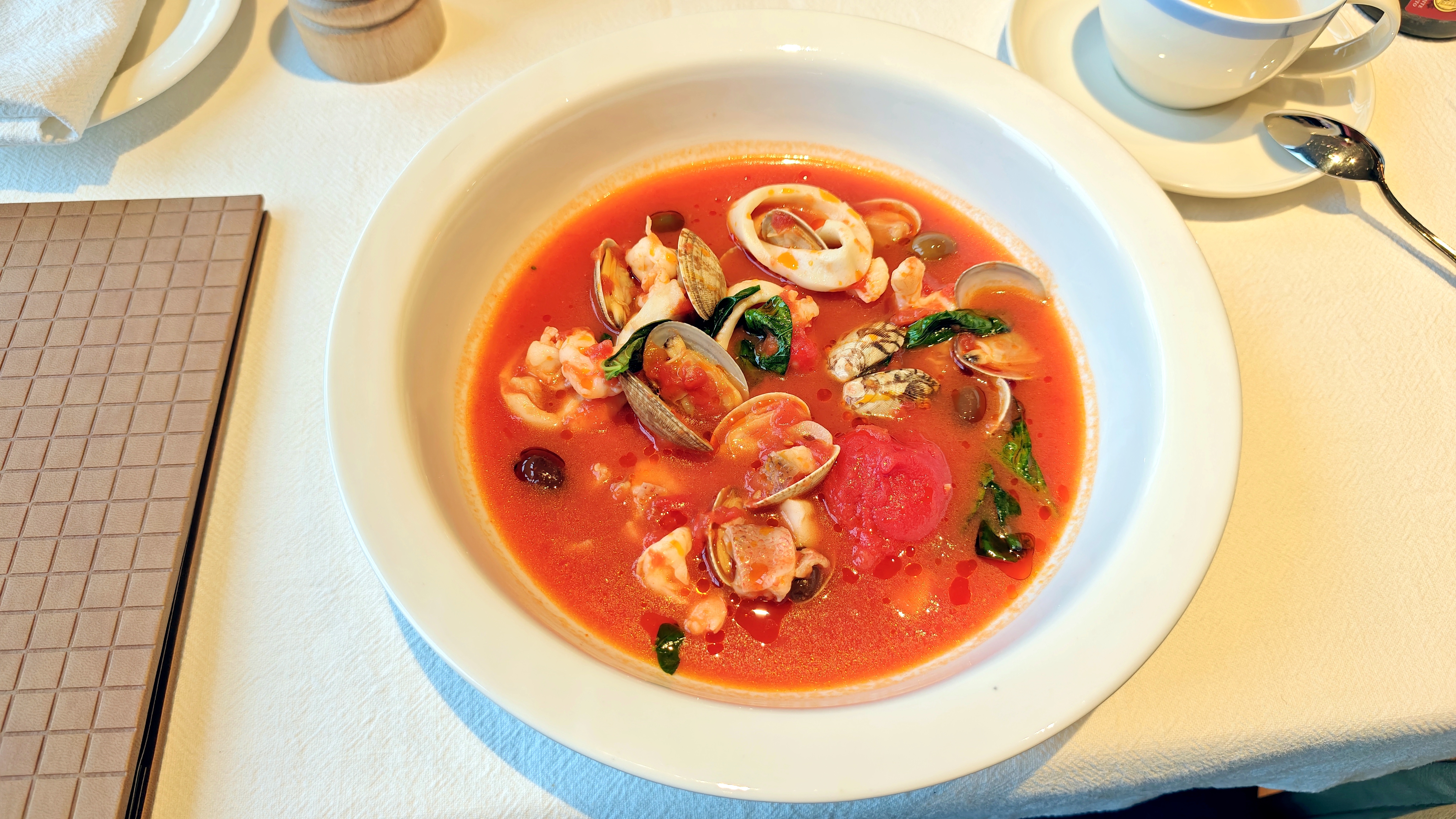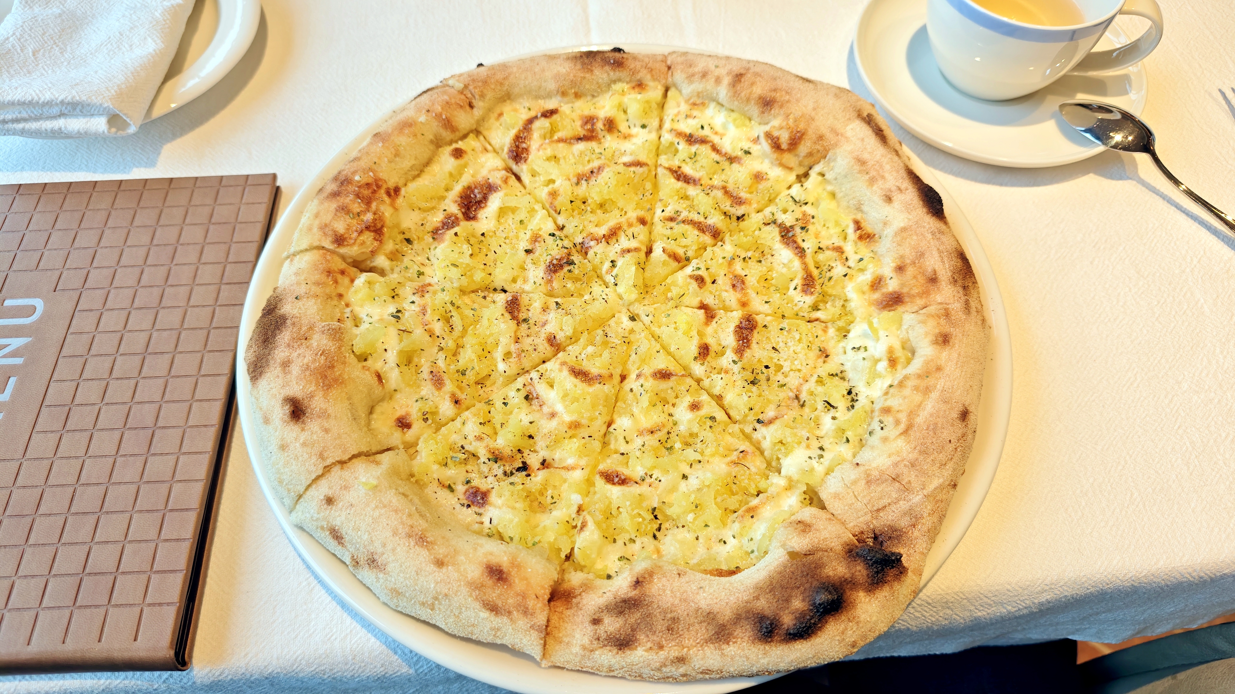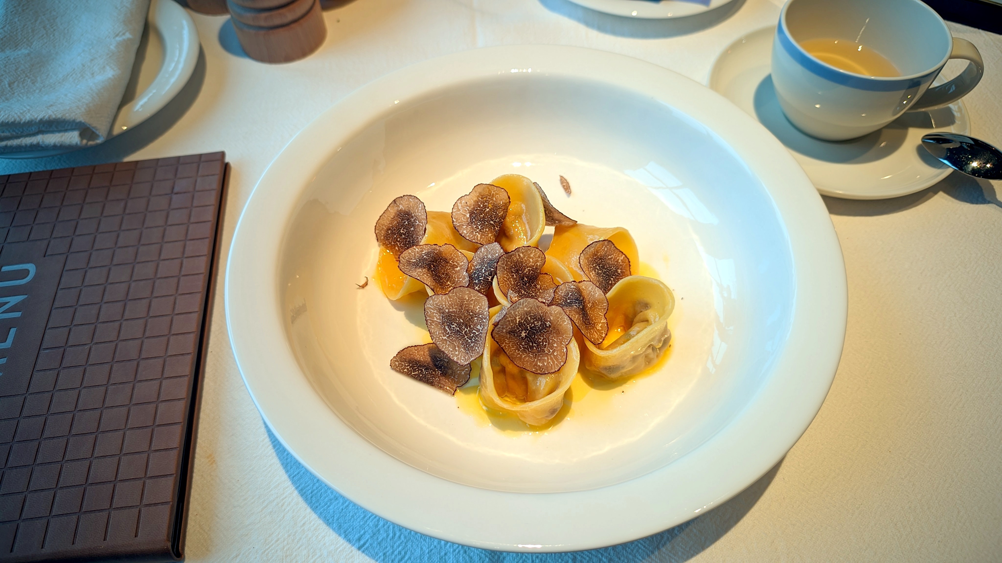 Своя пекарня — это не только тренд, это тепло в дом! Вроде никогда не ел эту диковину — Теста ин кассета — современный, классный студень с крем-горчицей — ЧТО В НЁМ ИТАЛЬЯНСКОГО, я не знаю. Карпаччо из осьминога, где весь объем под слайсами создан слоем свежей и яркой томатной «пасты», сверху только нарезка титульного продукта. Пицца с картошкой и пармезаном имеет прям отличное живое тесто, а вот начинка пресна, скучна, как не пробовали. Солил, но не сильно помогло. Рыбная похлёбка по-итальянски — вообще не рыбная — морепродуктов больше, чем рыб мелким кубиком, выходит, это один из лучших таких супов за года четыре! Аль денте паста, классика масляного соуса, небольшая, но не теряющаяся начинка — Тортеллини с белыми грибами и черным трюфелем. Рагу с ягненком с печеными, отлично напитанными соусом овощами, корнеплоды так просто упоительны, мясо кусками цельными. Крем-карамель — врушка! Это «неплохой крем с сиропом» — много сладкой воды. В плоской тарелке, с плоской ложкой, ну, не самый фееричный финал трапезы…