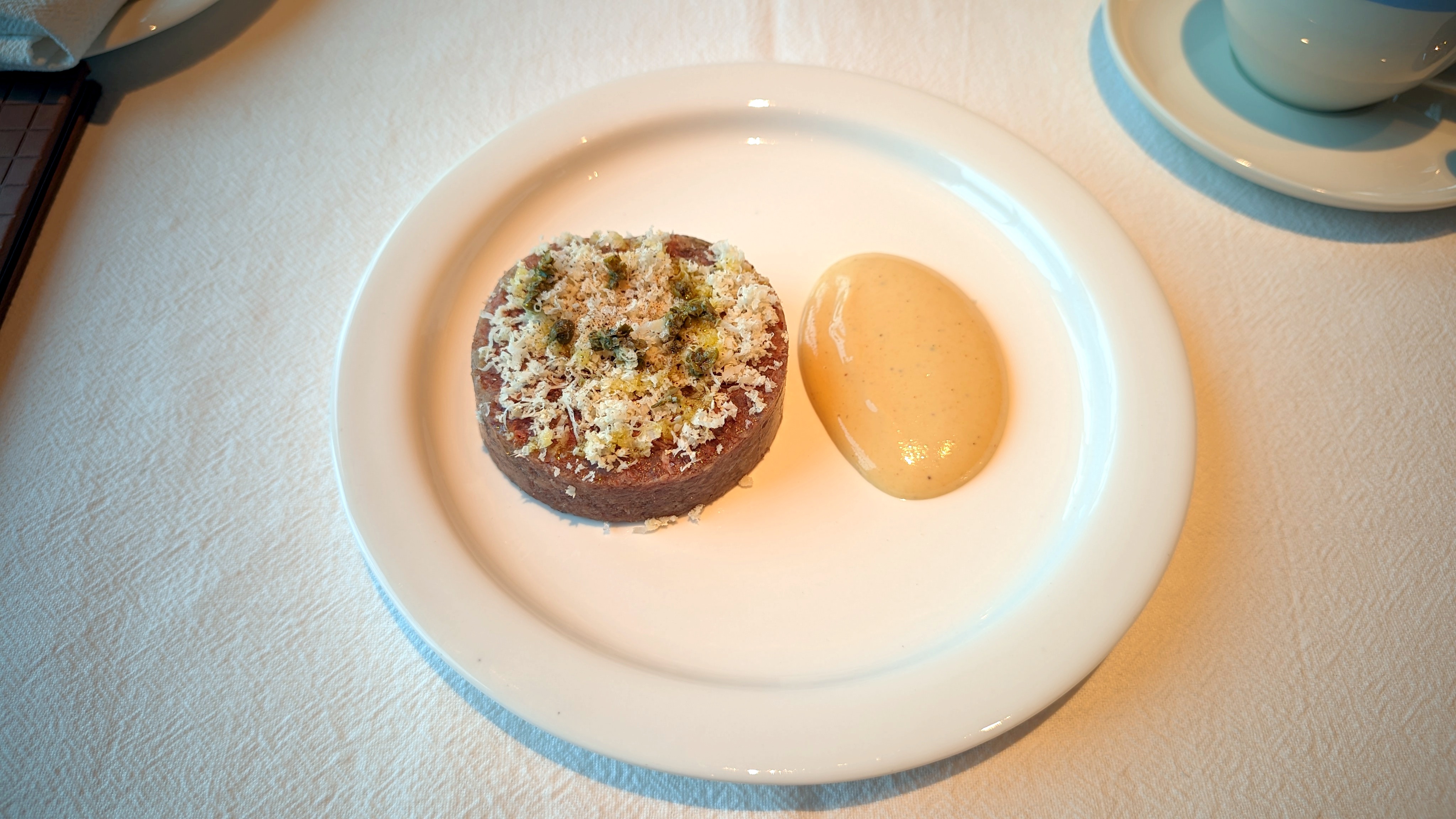 Совершенно разные цены — как лодку на волнах шатает: тартин и бриошь по 800 рублей, хотя есть хлебушек и за 250. Деревенский салат на овощах за 1800, как и всё остальные в разделе — без мяс и крабов. Креветки с мякотью апельсина в закусках — 3800, при этом перец рамиро — 750. Средний чек 2800 или же за 5000: это без напитка, конечно. Отличная встреча и проводы, сервиса… много, но люди, четыре человека подходят к столу поработать, как будто все сотрудники должны хоть единожды предложить второй раз что-то, унести смятую салфетку или подать комплемент — булочку картофельную с луком.