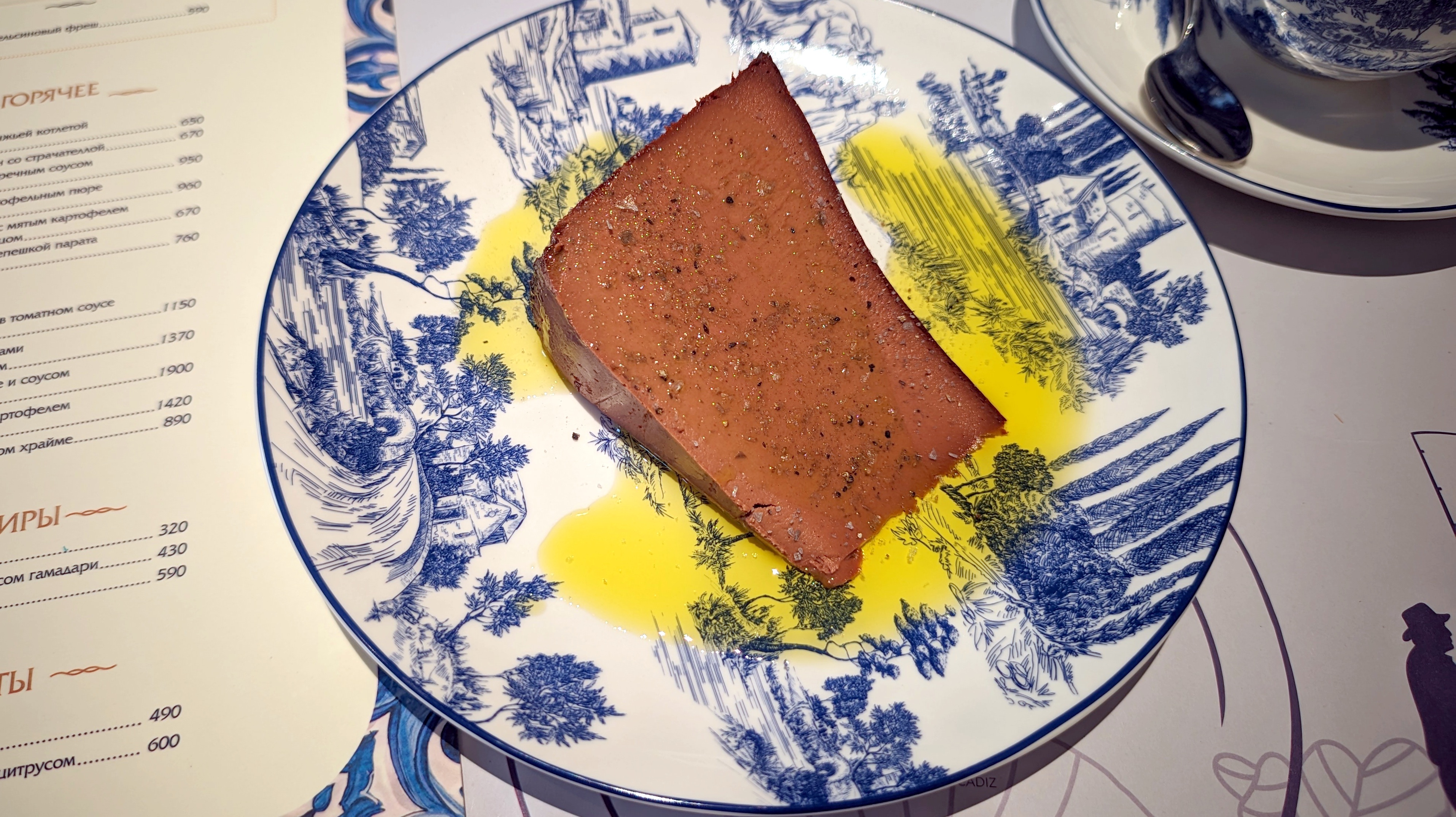 Зато камбала, несколько кусочков, богатство и интерес, которые чутка нивелирует морковка слишком большими кусками. Два слайсированных язычка ягнёнка с перечным соусом и пюре из батата — нежных, но без потери приятных фактур. Гребешки с белыми грибами и картофельным гратеном, который оказался самым слабым с кулинарной точки зрения за весь обед: пресный до края. Зато шикарно-сливочные грибы в такт соусу, хорошо приготовленные крохотные гребешки. И финал — баскский шоколадный чизкейк с солью, посыпаемой за столом, и оливковым маслом.