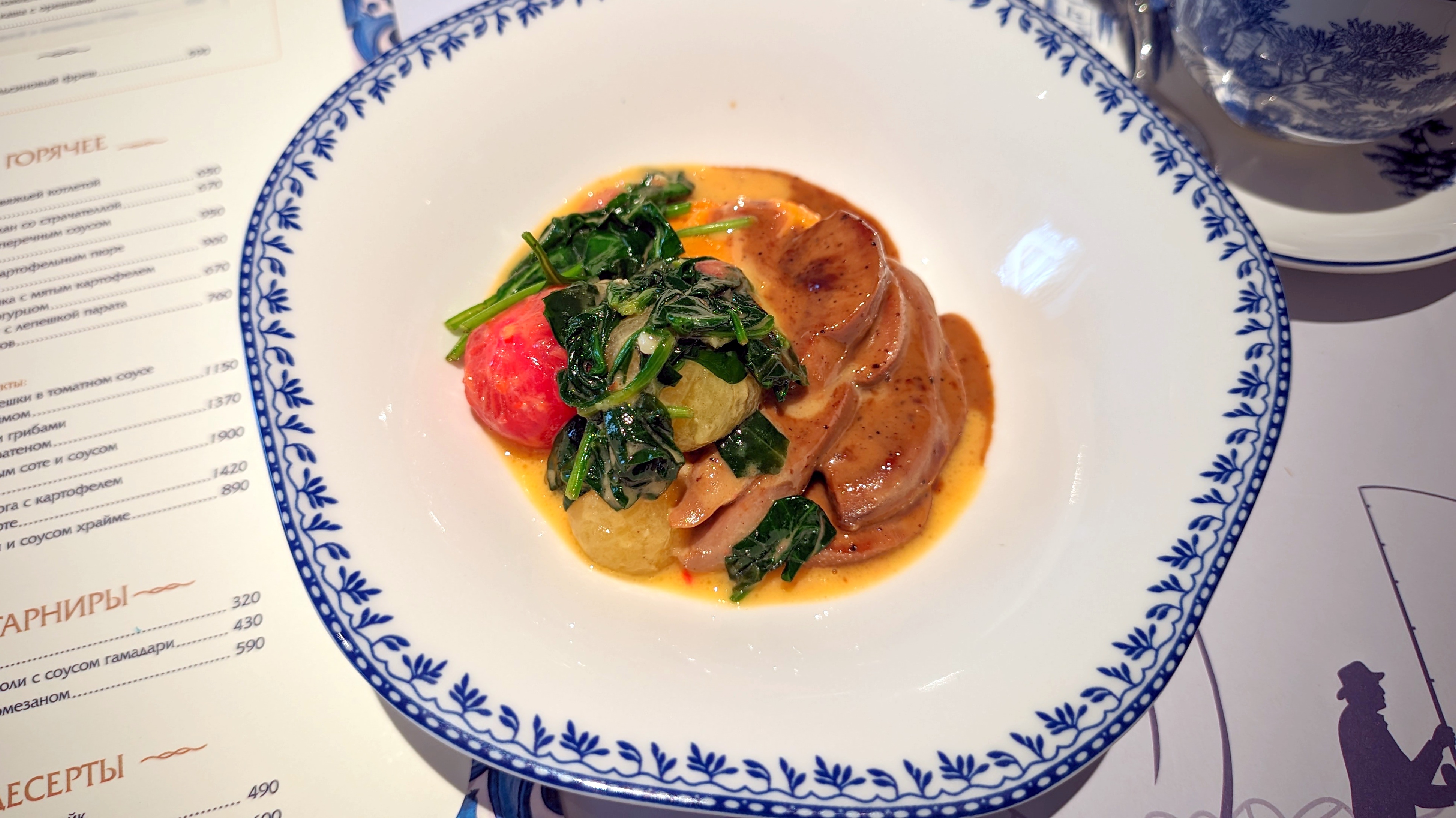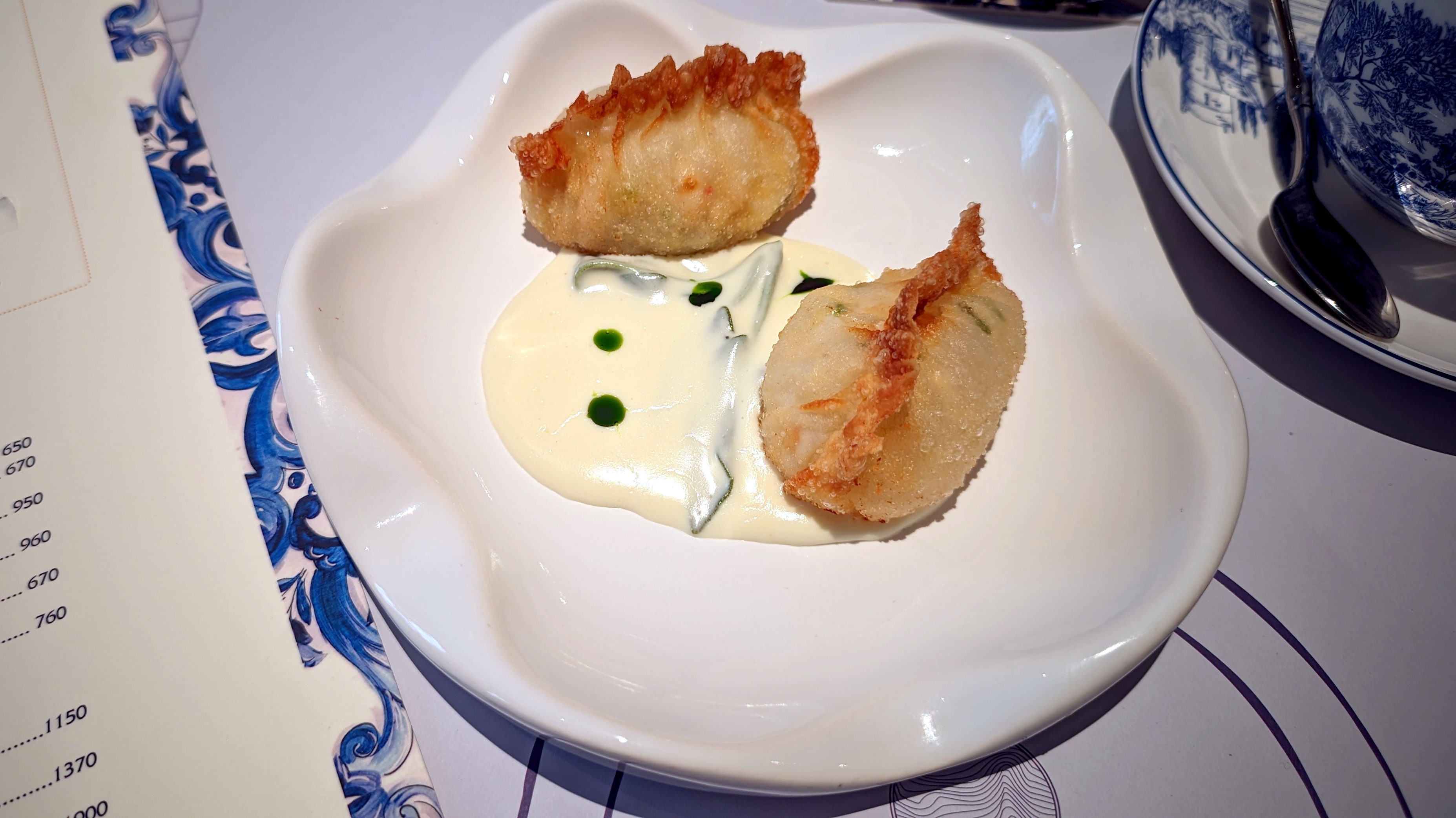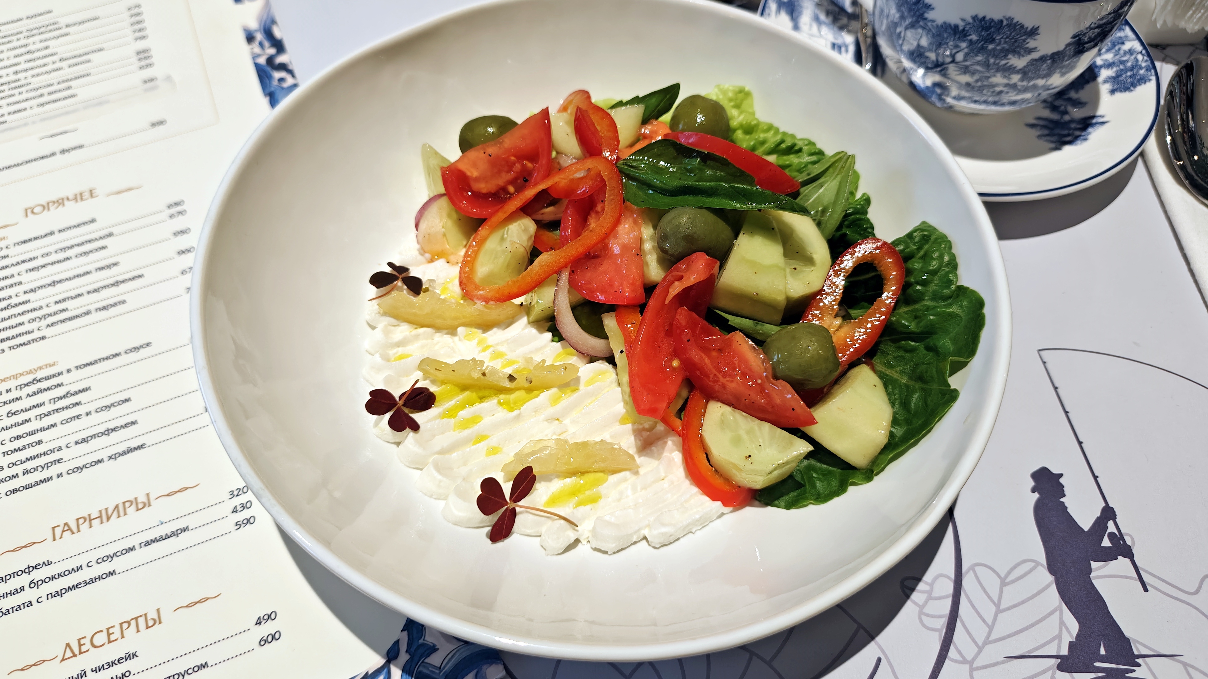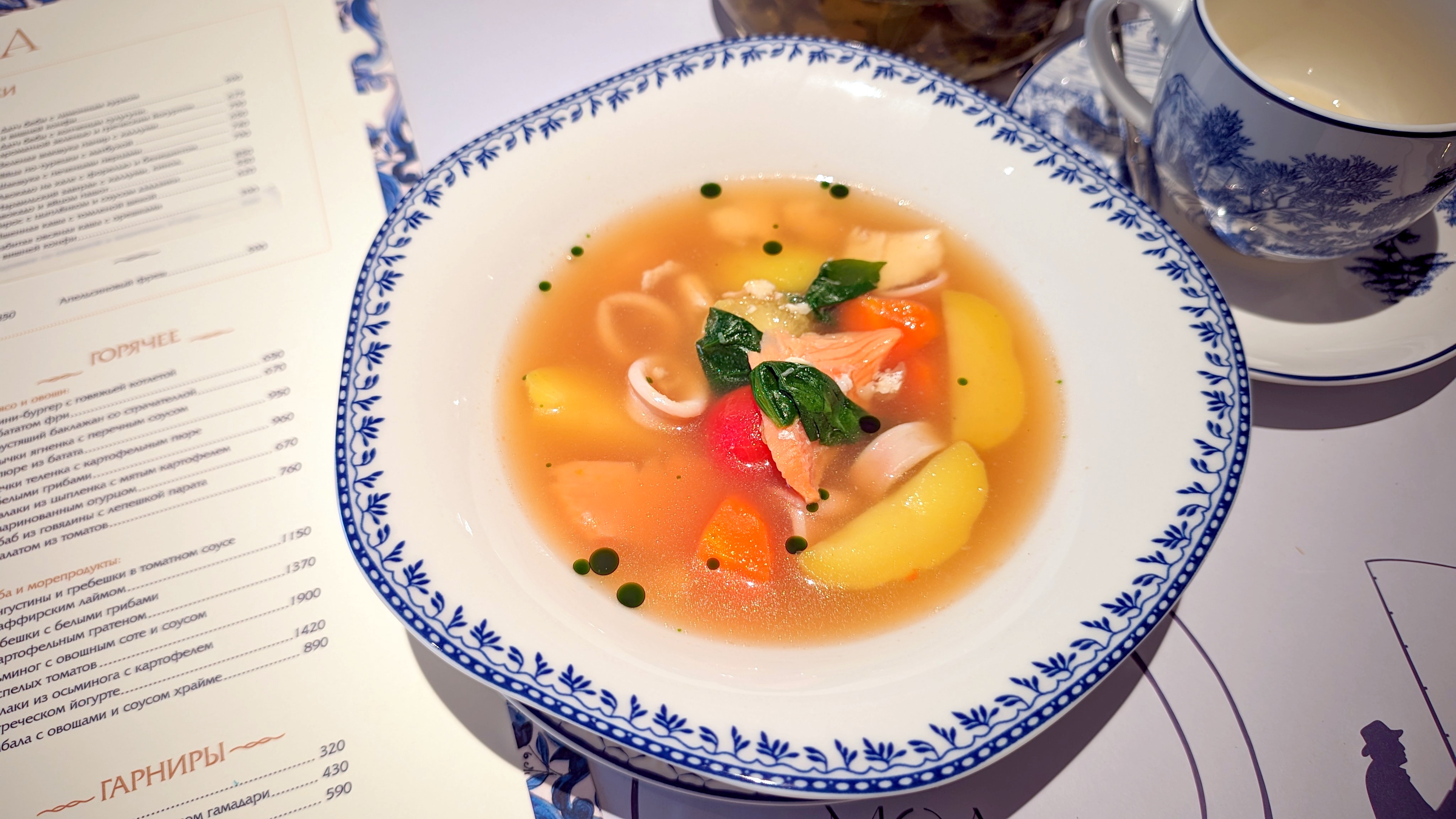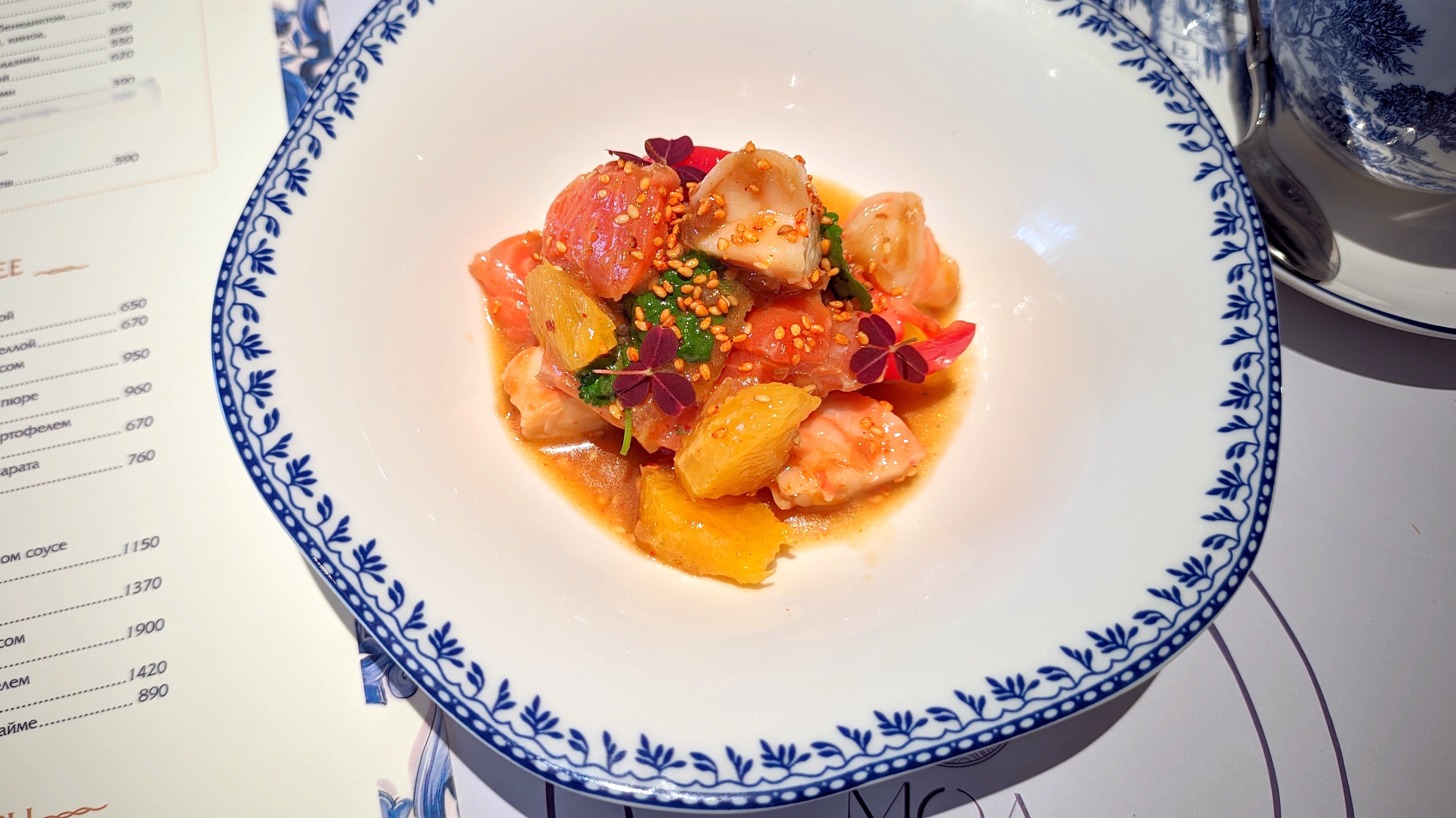 Оценить сервис сложно: местами очень радует, советовал бы не увлекаться работой коллективом, каруселью лиц у стола и предупреждать про ожидание — пауза со стартами в полтора раза больше привычного. И это… Посекунчики с креветкой — вот сего ждал, ел и видел у других, а это два небольших… вонтона размером, обжаренных в масле целиком. Тесто в полмиллиметра, лёгкое, радостное, фарш сочный, даже бульон реально готов сИкаться у менее умелого гостя. Но почему так мало? Треть от больших и половина от остальных греческих салатов. Да тут ещё и не кусок цельной настоящей греческой феты, а густой-густой крем. Севиче из форели с креветкой — заправка почти вся на продуктах, на цитрусовых, кусками крупнее рыбы, но это здорово. И нет претензий по размеру, когда ярко. По объёму бульона опять удивление — лёгкий рыбный суп с кальмаром!