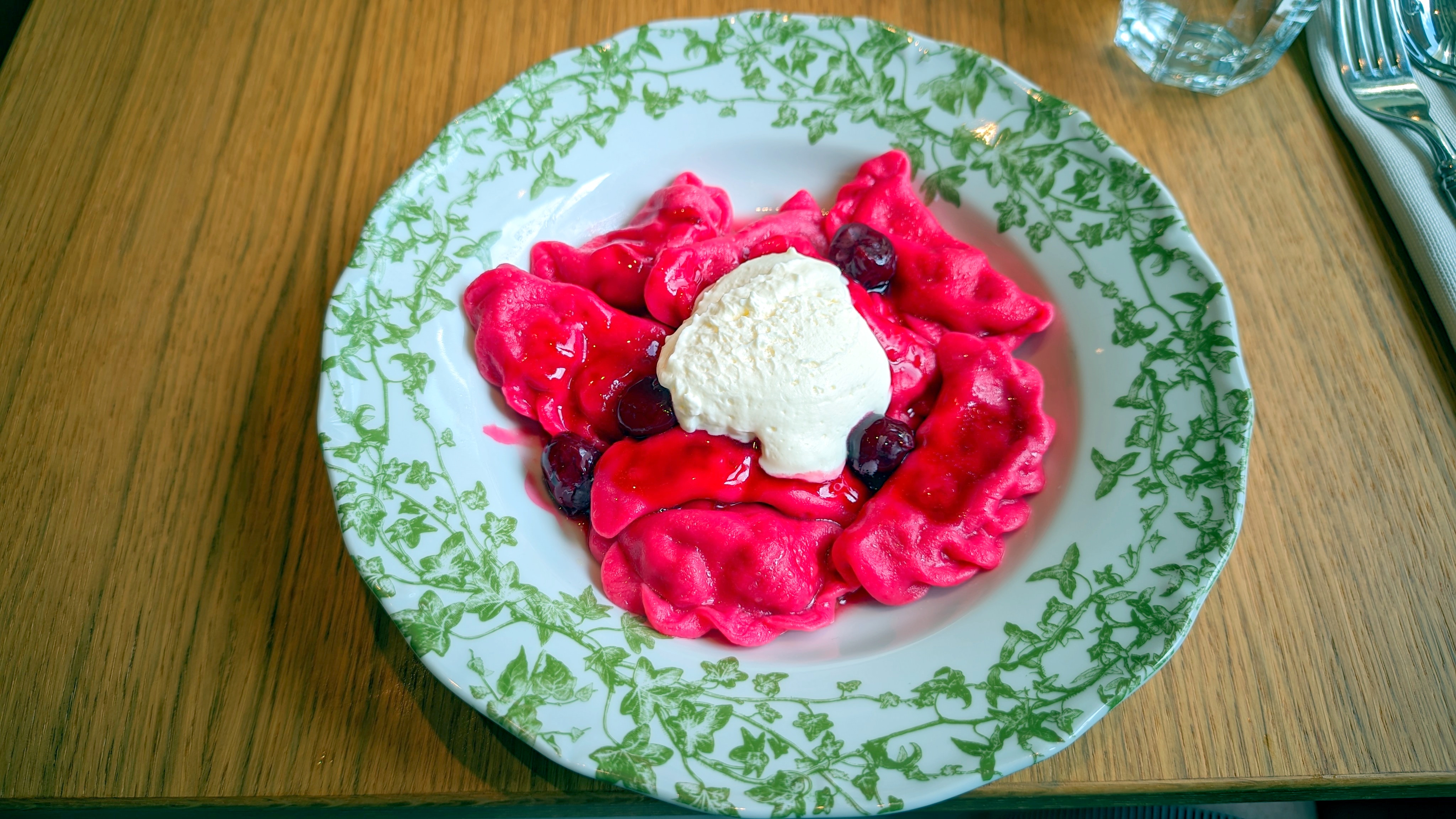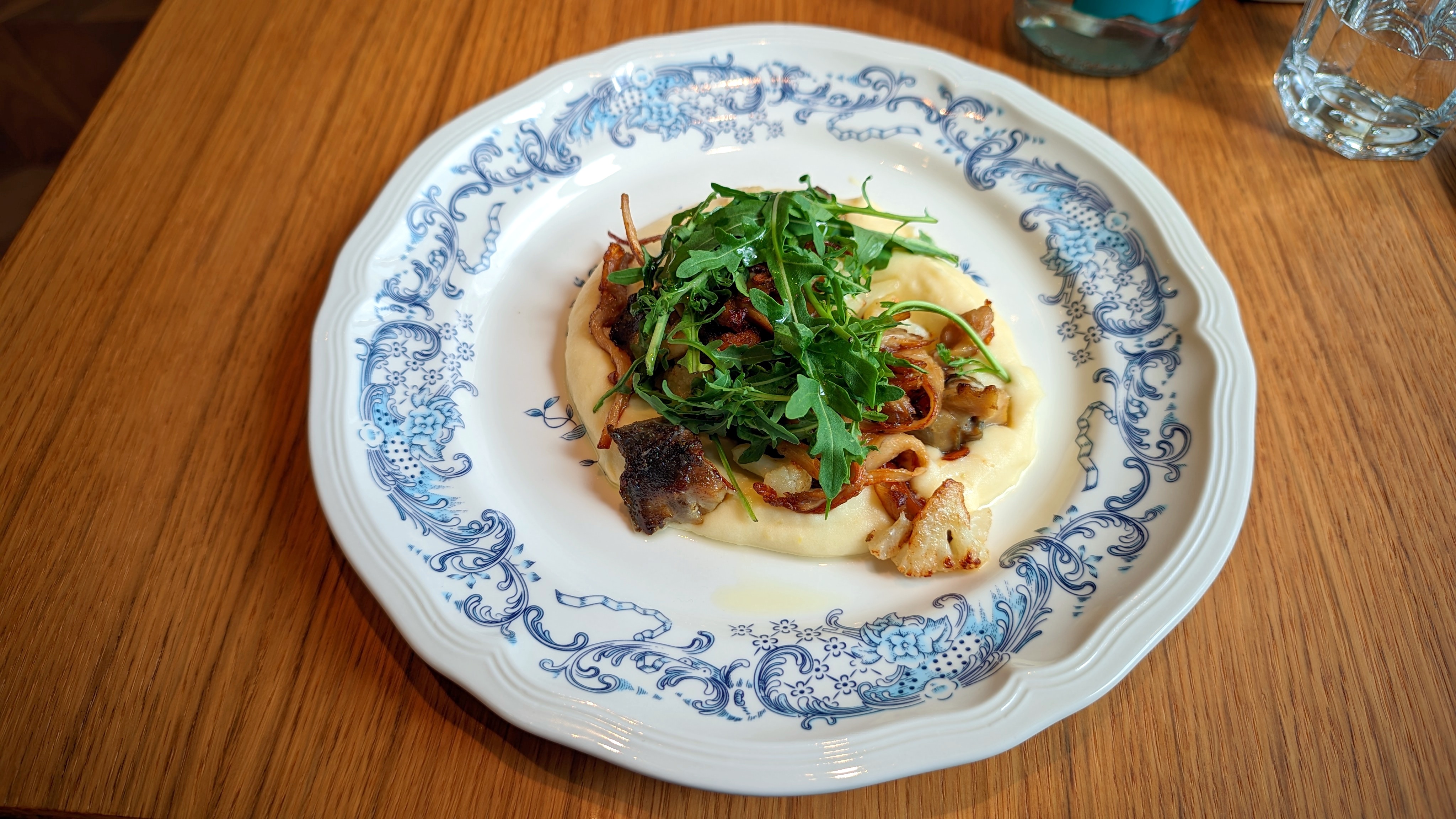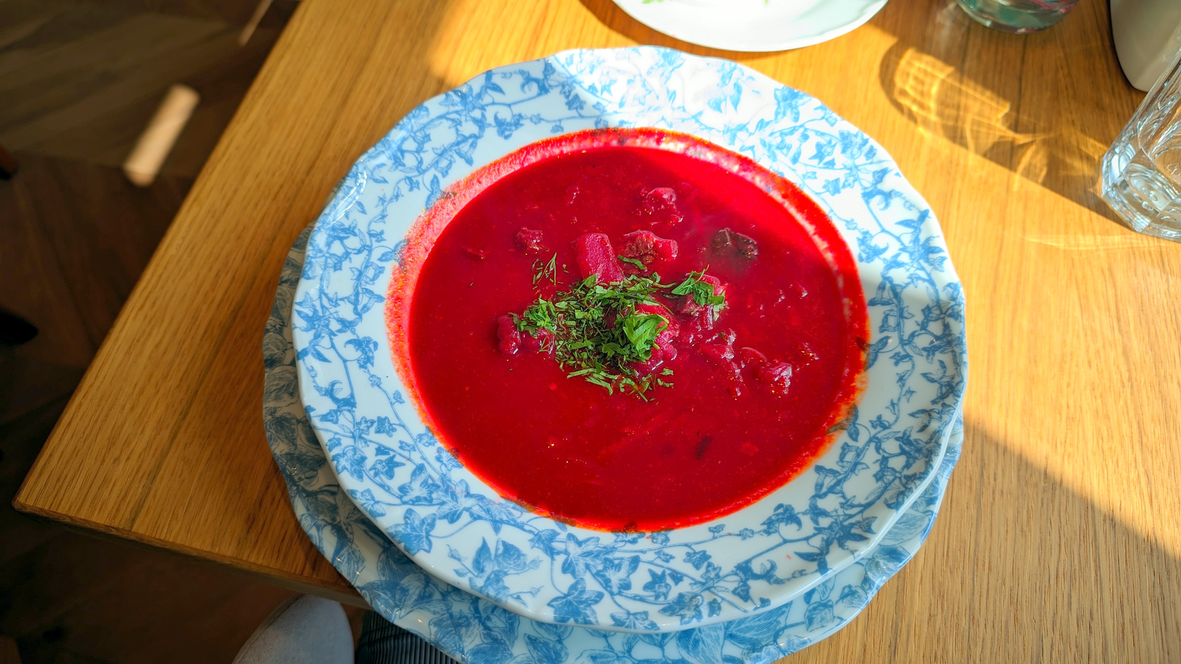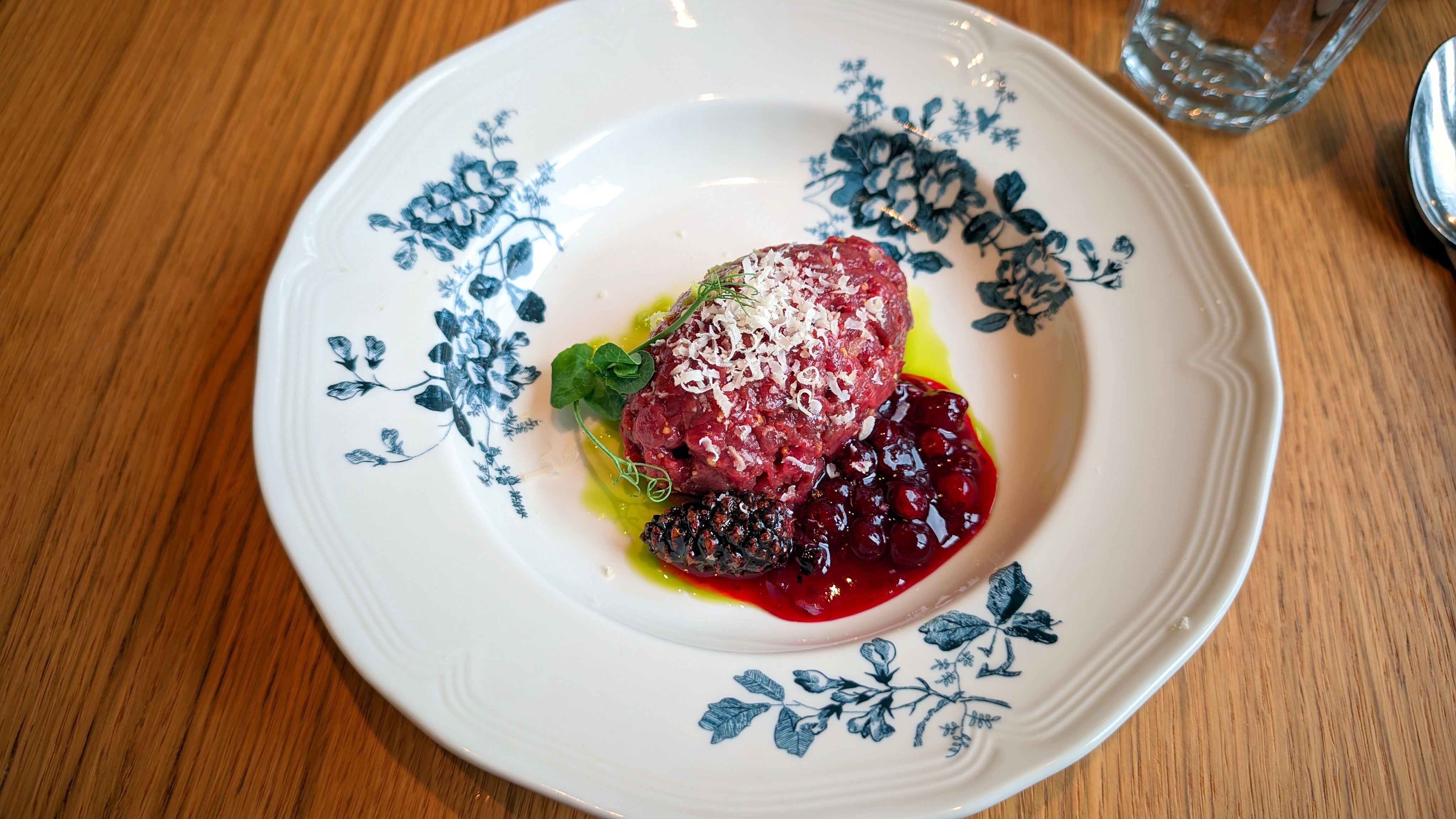 Меню на удобном для обзора листе А3, и мне нравятся всё. Редкий случай, когда ничего не хочется исправить. Кроме пресного, не приправленного вкусами филе рыбы, хорошей, доброкачественной, но я заказал сугудай из муксуна. Самое дорогое блюдо из счёта оказалось самым неудачным. Котлетка фарша тартара из оленя с брусникой заправлена в сладких тонах, да, еловая шишка и варенье. Принимаю идею, исполненную отлично. Борщ с копчёной грушей — один из лучших за год! Как чуток введено перебитой или протёртой гущи, от этого приятная имитация серьёза и настоя, кубики мяса, тон, богатство. Когда и жанр любимый, и исполнено великолепно. Абхазский салат с кефалью и восторгом: мелкий кубик свежий овощной, зелень выразительная, не теряющаяся, не труха, рыбка. Пирожки выпечные, как свежие. Фарш в мясном тот самый, домашний, не слепившийся котлетой, и капустный не хуже. Азовские рапаны с вешенками — всего понемногу, но приготовлено хорошо: ярко, смело, выразительно, с корочками на контрасте с нежным пюре — небольшое, но законченное блюдо. Шикарная подача шашлыка из свинины: лучше, наверное, не видел всё последнее время. Дуэт тарелок, а не унылость доски, нежное мясо, свежайшие овощи дорогого фасона. Редко ем подстилку-лаваш, но тут такие соки, оставить нельзя. Час двадцать от заказа: вареники с вишней вместо десерта. Красиво окрашено — цветом, вкусом, и ягоды внутри лопающиеся, и ягоды, помимо начинки, и крем.