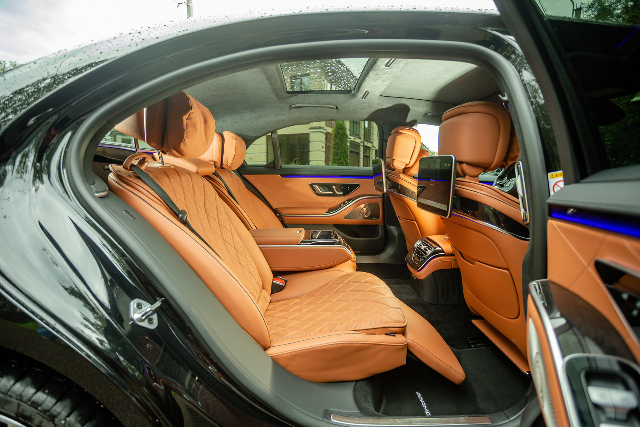 Сзади чуть привычнее. Королевские кресла с массажем и оттоманкой, бархатными подушечками, двумя мониторами и съемным управляющим планшетом – законы современного представительского класса. Поэтому возвращаюсь обратно за руль. Очень пухлый и нежный – из AMG-пакета.