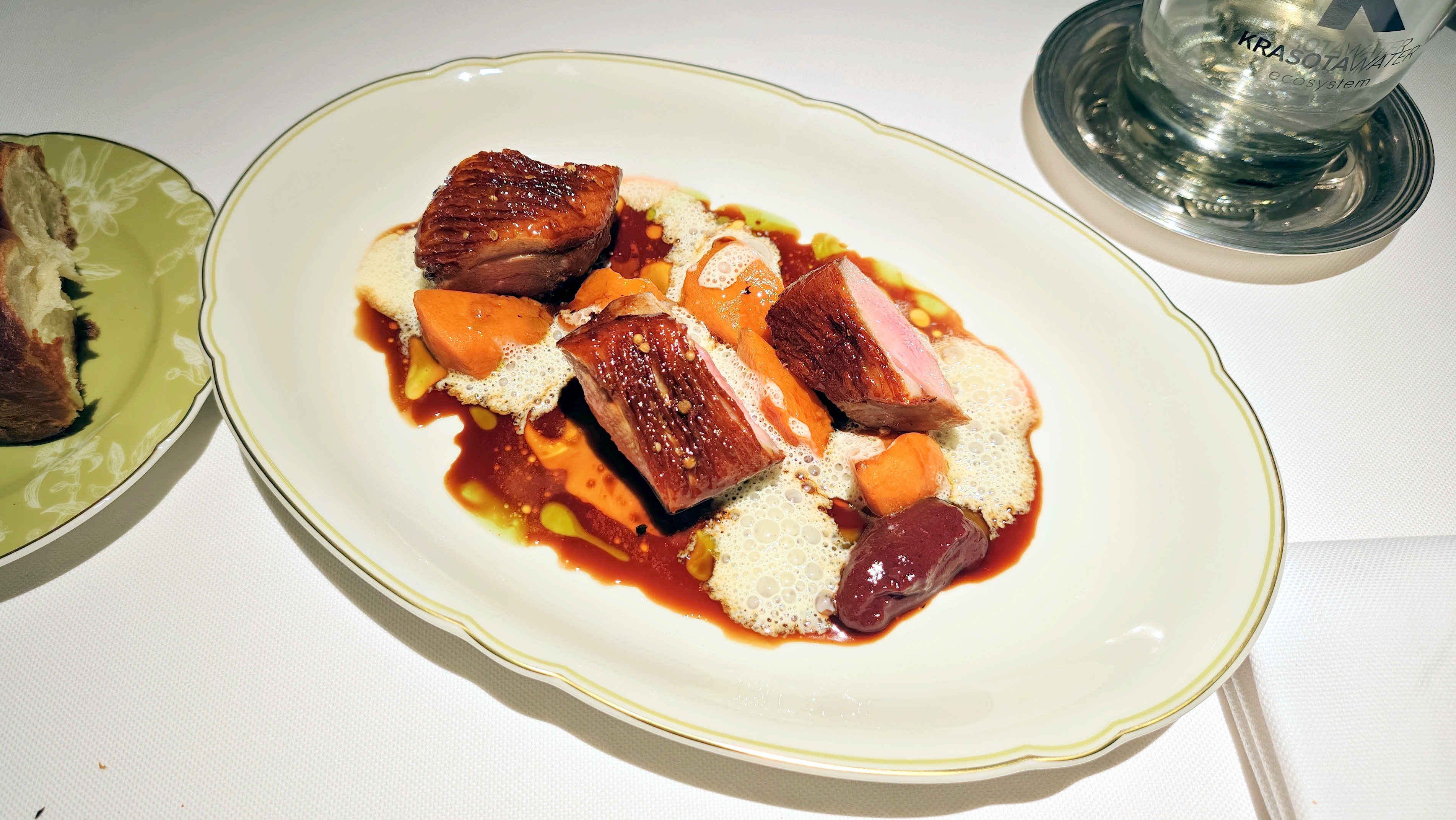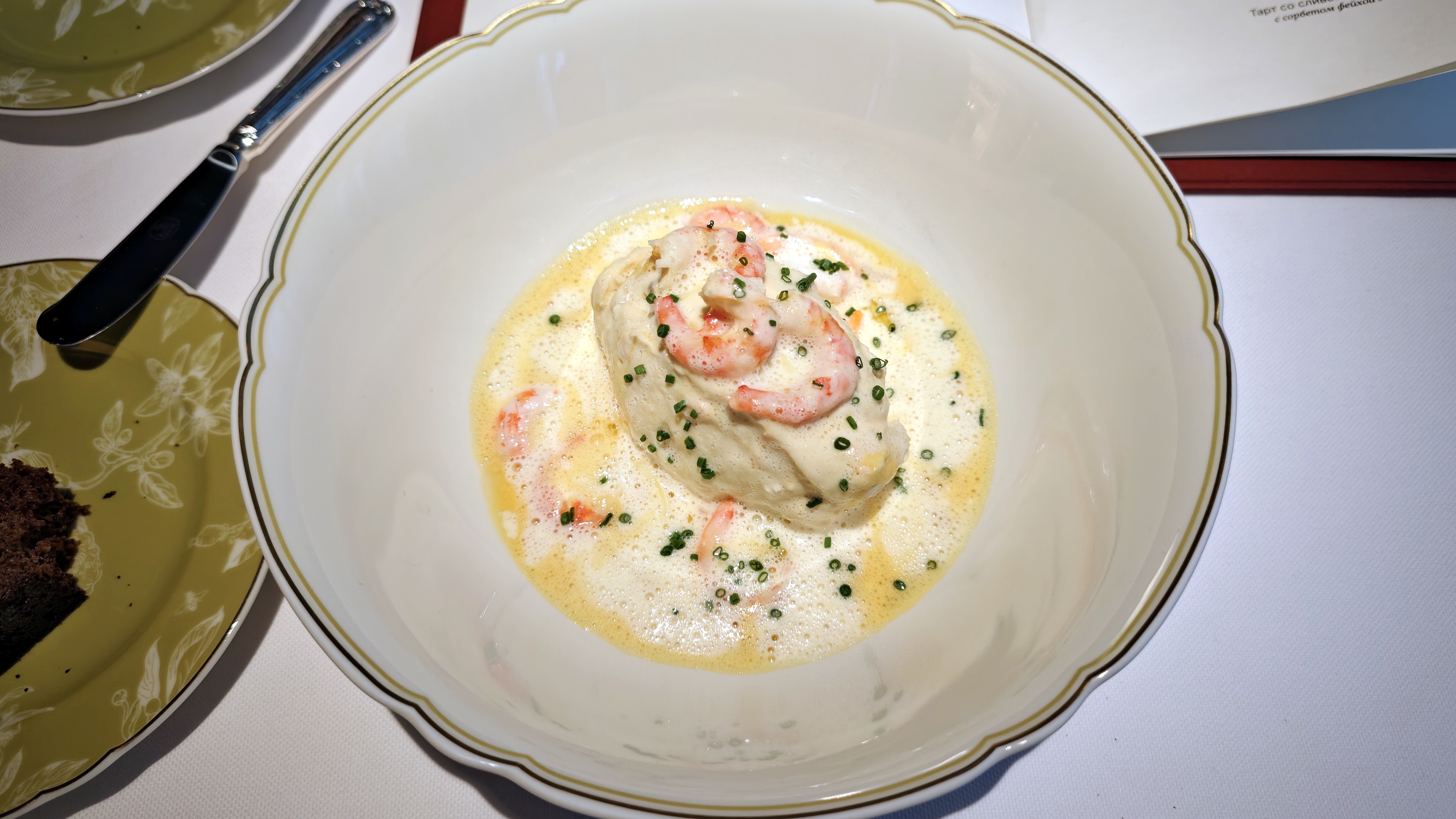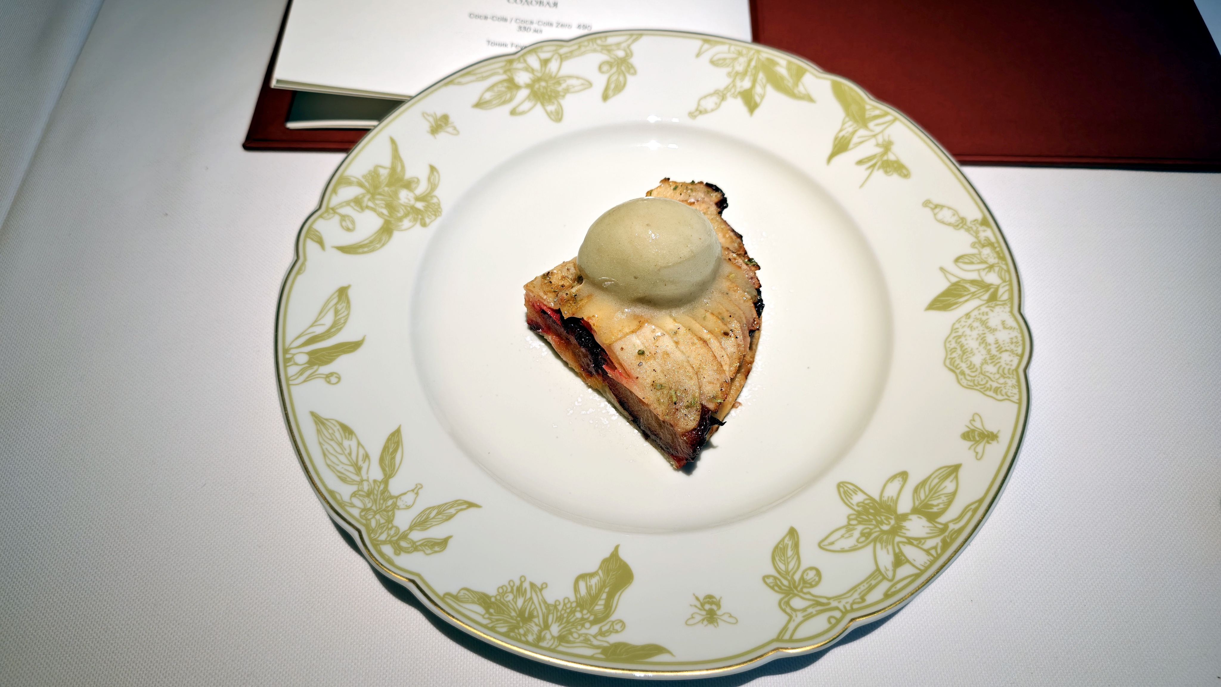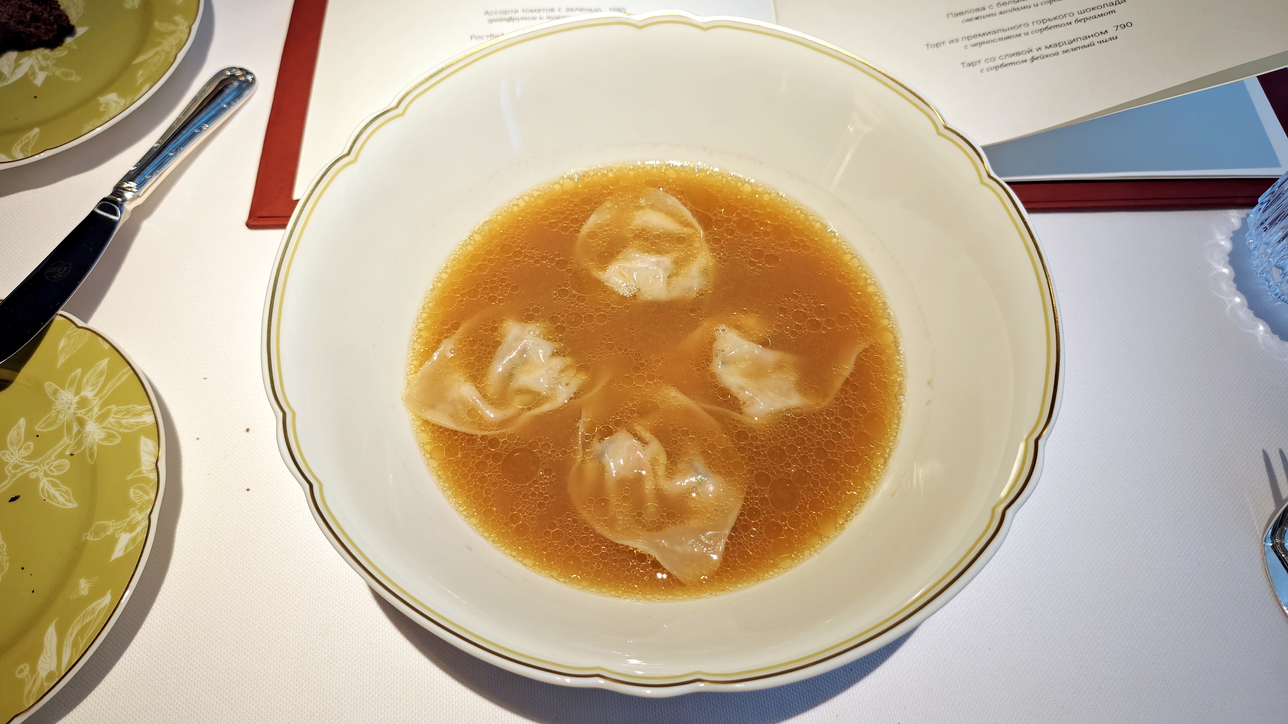 Каштановый крем-суп с фаршированными сморчками, где за верхним мраморным слоем совершенно классический нежный крем. Консоме из сезонных грибов с вонтонами из кубиков мраморной говядины с добавлением квартета грибов и сыра маасдам для доброты и связности, но бульон прежде всего: на вешенках и белых, такой полнотелый и самоценный. Утиная грудка, что не из сувида, с редкими зёрнами горчицы, с упоительной глазированной тыквой, с миндальным и мясным соусом. Кнель из щуки, судака и лосося — как паровая, лёгкая, воздушная... Слишком диетическая в чём-то важном, но повар это понимает и даёт контраст с северными креветками и биском. Три десерта в меню: Павлова с белым шоколадом и контрастом температур с сорбетом личи. Торт из горького шоколада, где вдвойне развлекателен чернослив внутри. И тарт со сливой под черепицей яблочной, а внутри чили остринка.