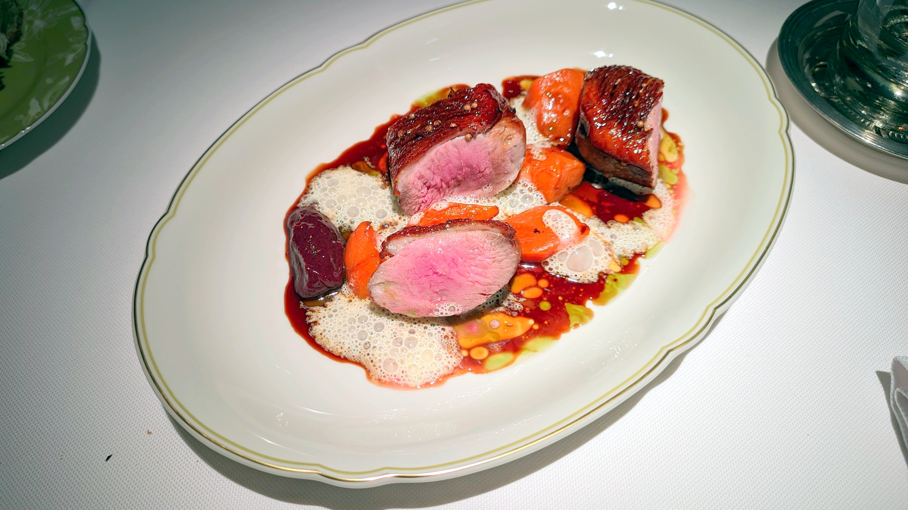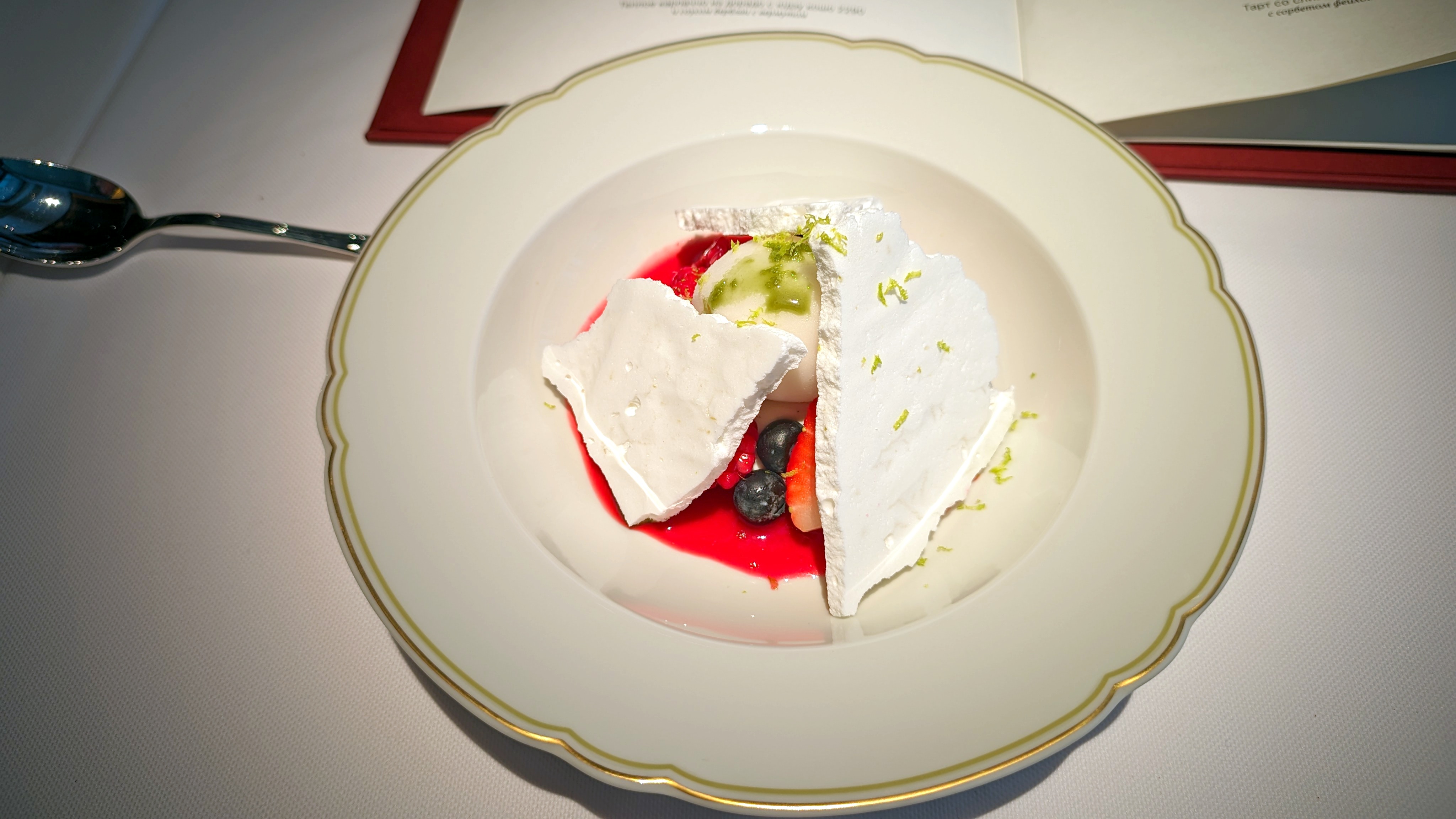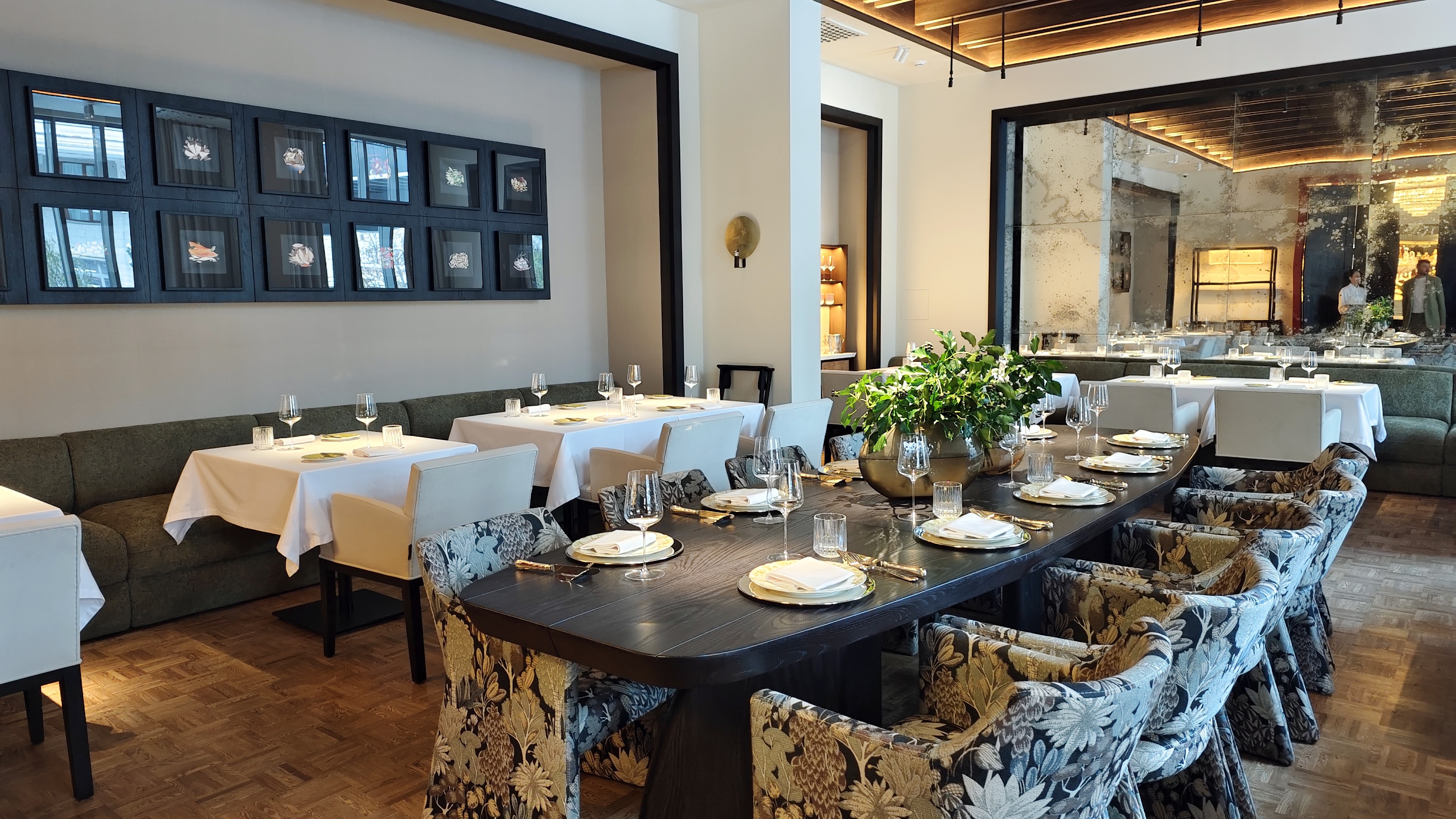 Каштановый крем-суп с фаршированными сморчками, где за верхним мраморным слоем совершенно классический нежный крем. Консоме из сезонных грибов с вонтонами из кубиков мраморной говядины с добавлением квартета грибов и сыра маасдам для доброты и связности, но бульон прежде всего: на вешенках и белых, такой полнотелый и самоценный. Утиная грудка, что не из сувида, с редкими зёрнами горчицы, с упоительной глазированной тыквой, с миндальным и мясным соусом. Кнель из щуки, судака и лосося — как паровая, лёгкая, воздушная... Слишком диетическая в чём-то важном, но повар это понимает и даёт контраст с северными креветками и биском. Три десерта в меню: Павлова с белым шоколадом и контрастом температур с сорбетом личи. Торт из горького шоколада, где вдвойне развлекателен чернослив внутри. И тарт со сливой под черепицей яблочной, а внутри чили остринка.