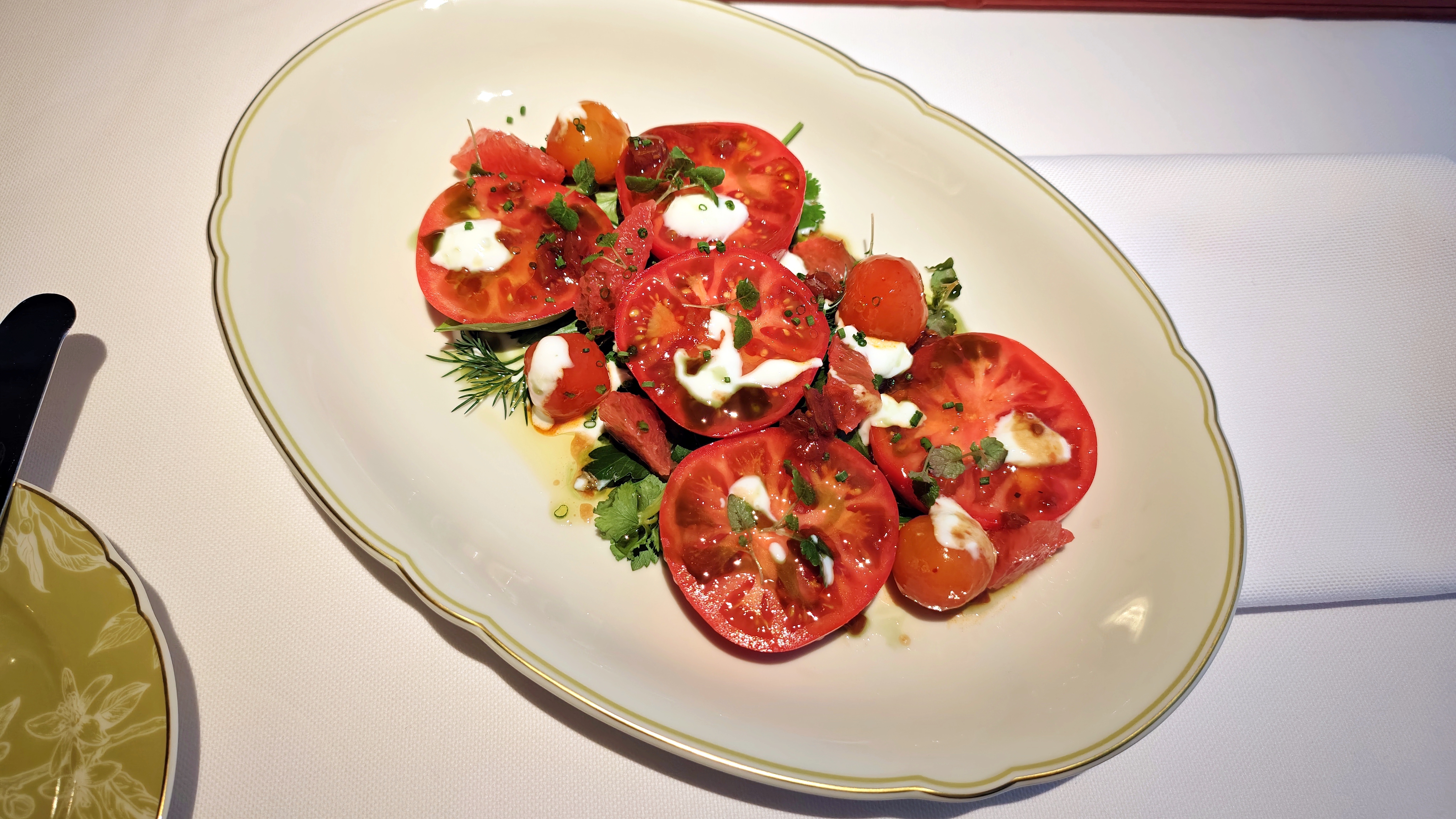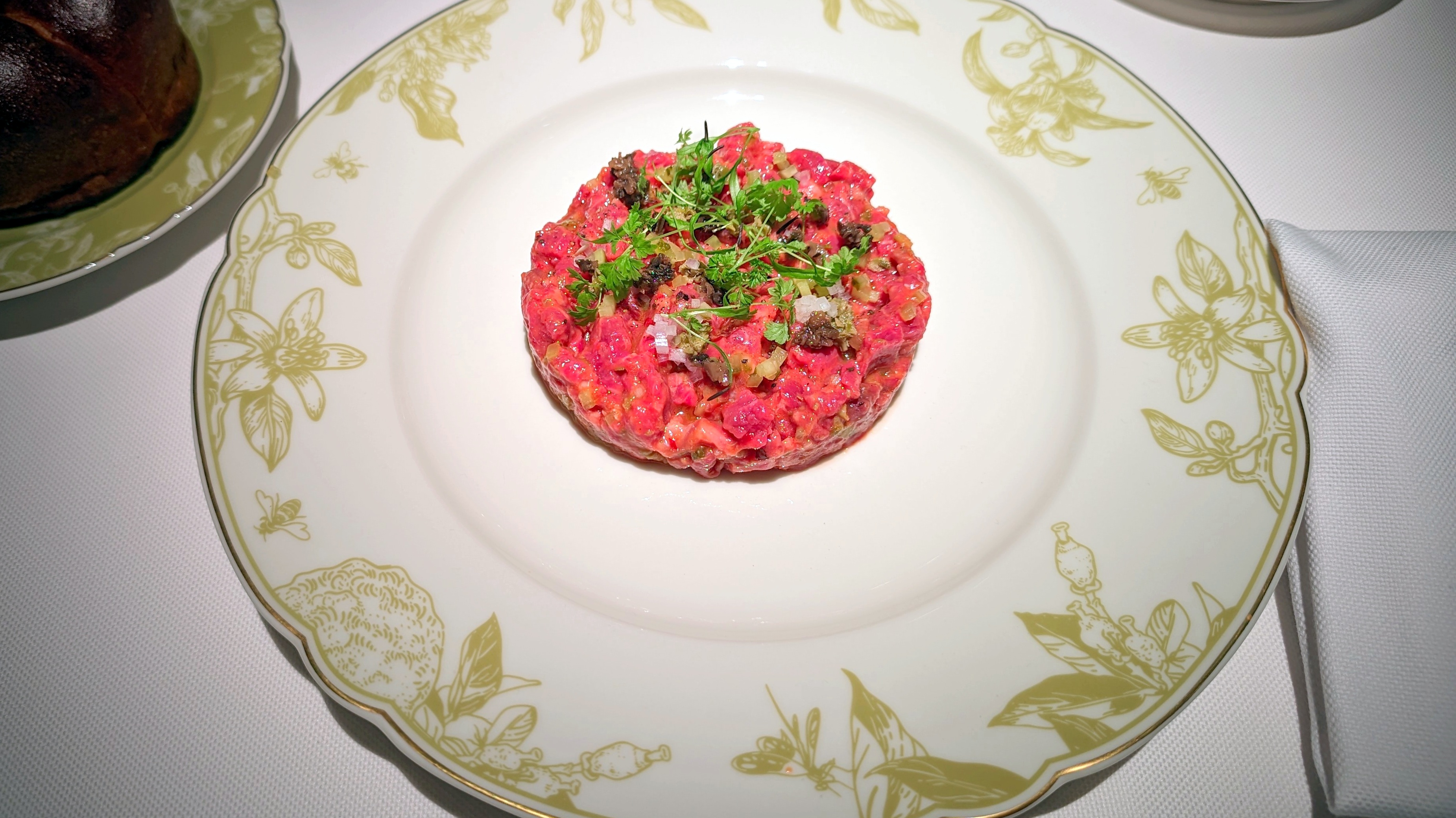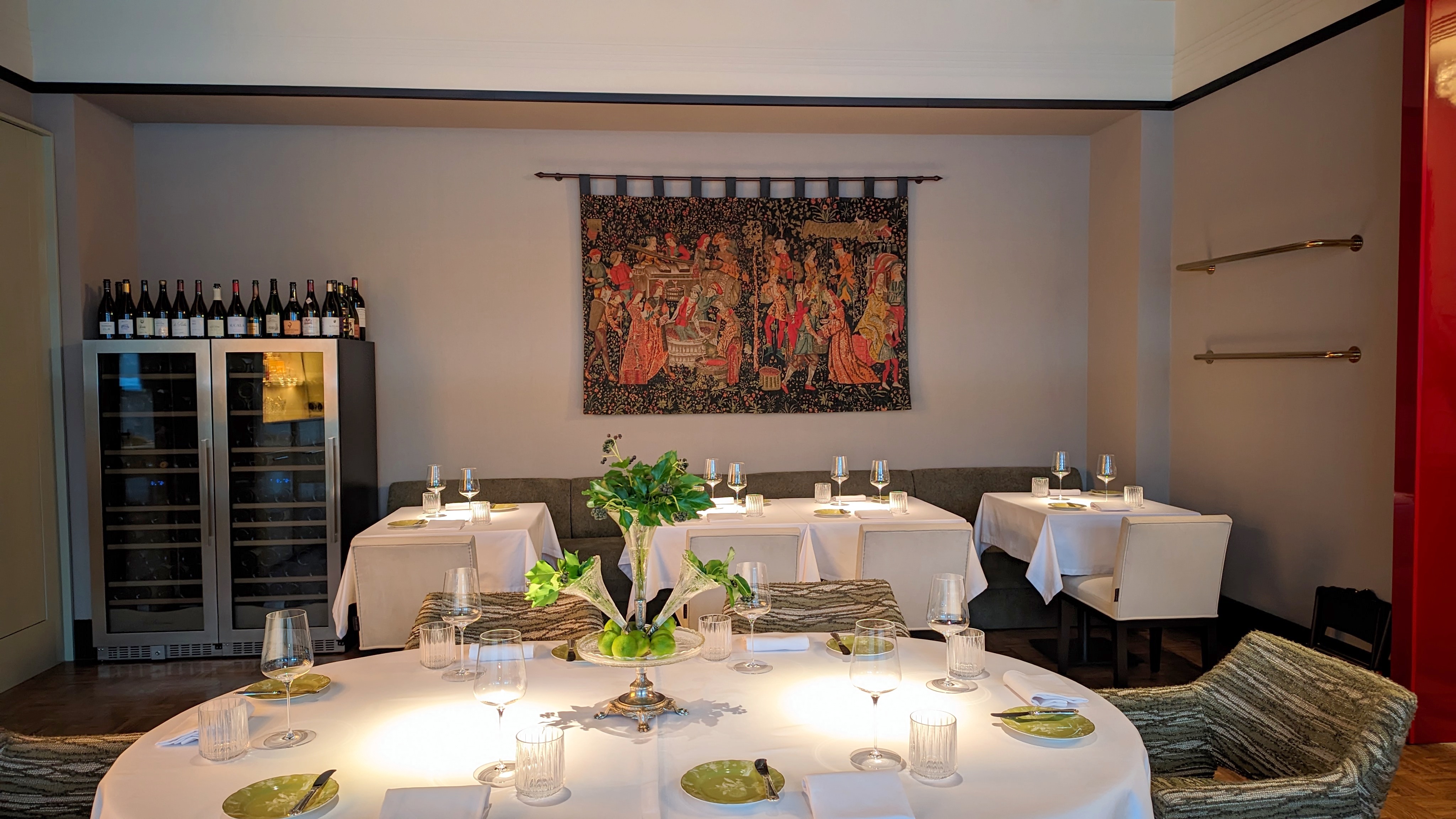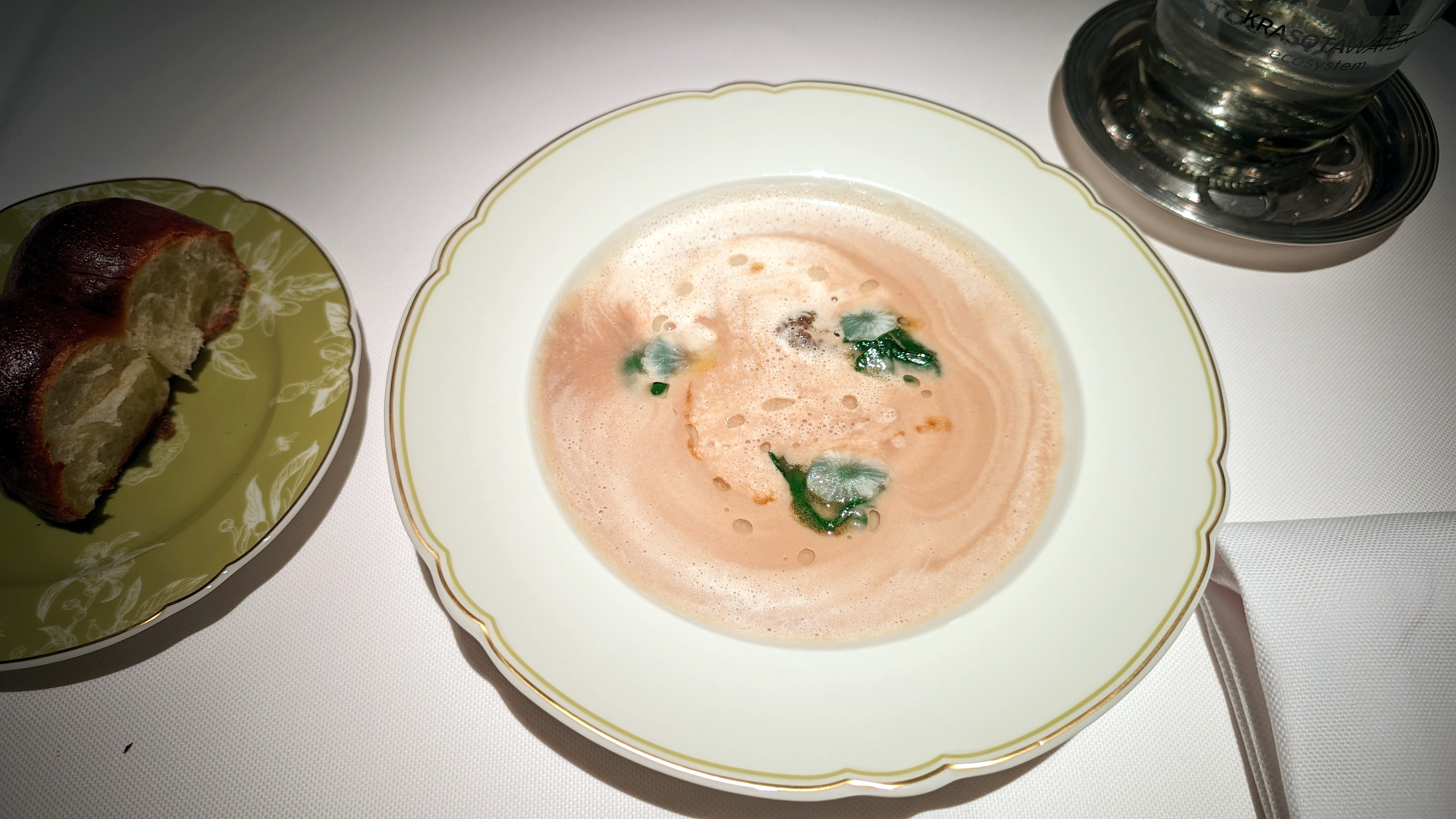 Каштановый крем-суп с фаршированными сморчками, где за верхним мраморным слоем совершенно классический нежный крем. Консоме из сезонных грибов с вонтонами из кубиков мраморной говядины с добавлением квартета грибов и сыра маасдам для доброты и связности, но бульон прежде всего: на вешенках и белых, такой полнотелый и самоценный. Утиная грудка, что не из сувида, с редкими зёрнами горчицы, с упоительной глазированной тыквой, с миндальным и мясным соусом. Кнель из щуки, судака и лосося — как паровая, лёгкая, воздушная... Слишком диетическая в чём-то важном, но повар это понимает и даёт контраст с северными креветками и биском. Три десерта в меню: Павлова с белым шоколадом и контрастом температур с сорбетом личи. Торт из горького шоколада, где вдвойне развлекателен чернослив внутри. И тарт со сливой под черепицей яблочной, а внутри чили остринка.