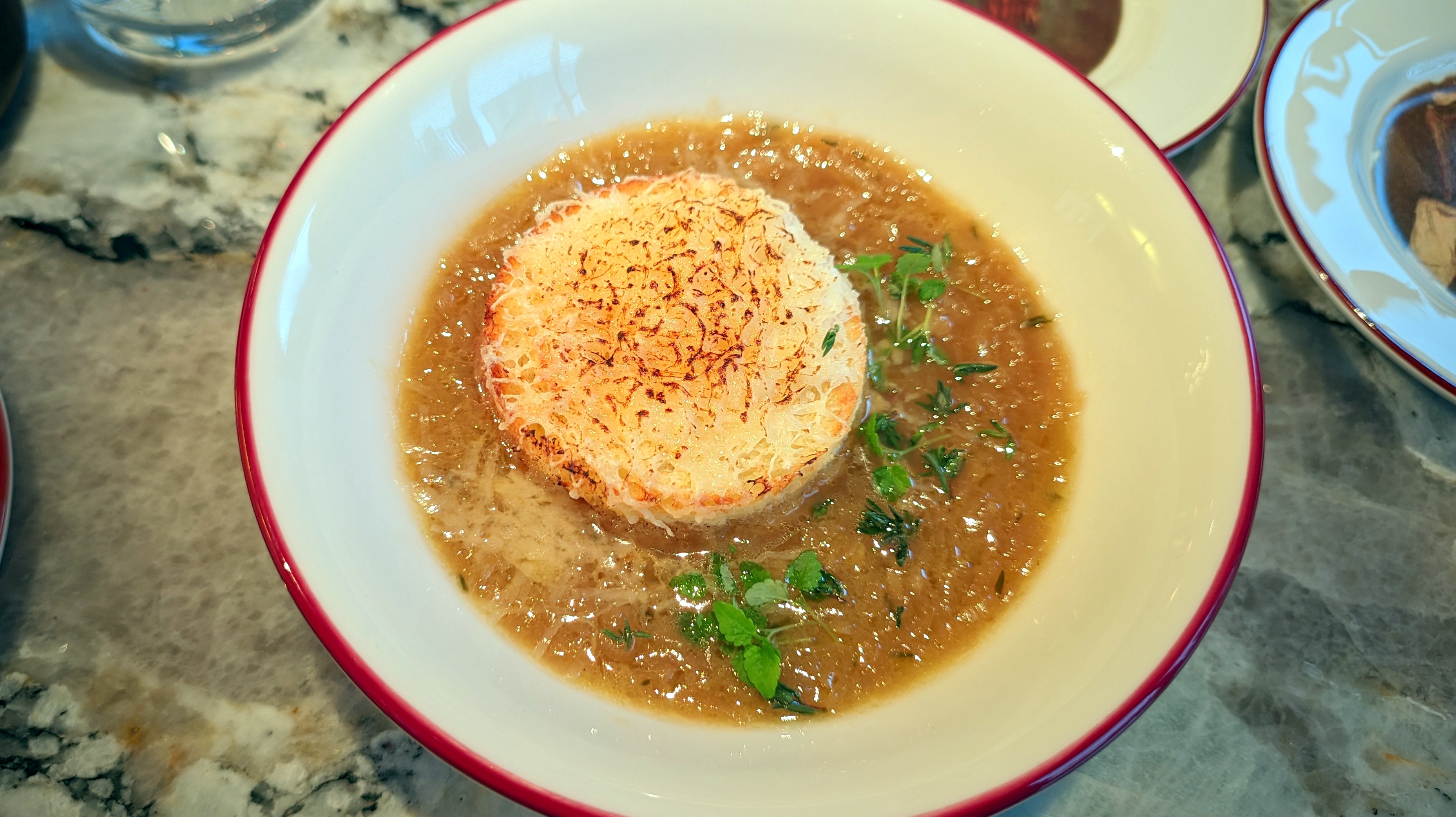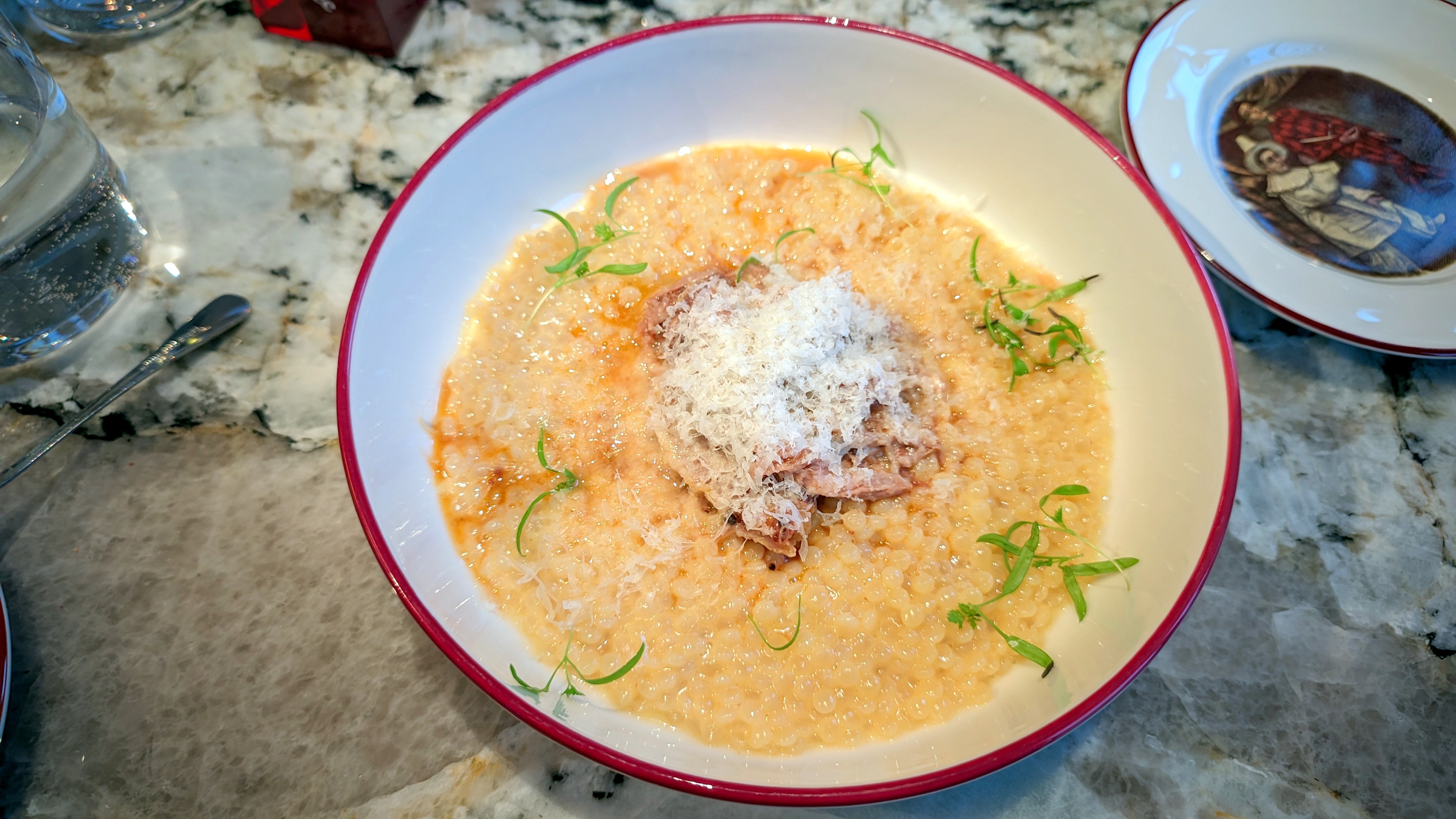 Луковый суп по правильному лекалу делал знающий человек, но вот сладость первую, с несильным тимьяном, я бы уравновесил кислинкой вина, которую совсем не поймал. Категорически интернационально люблю все птитимы, жемчужные кускусы, орзо и рисони этой планеты, но тут ждал именно классической пасты с уткой за 1200 в любом форм-факторе. Шарики теста с рагу из волокон хорошо приготовлены, в лёгком соусе, пармезан пахуч на горячем, но лучше прописать или проговорить. И цена, цена точно не бьётся с поданным.