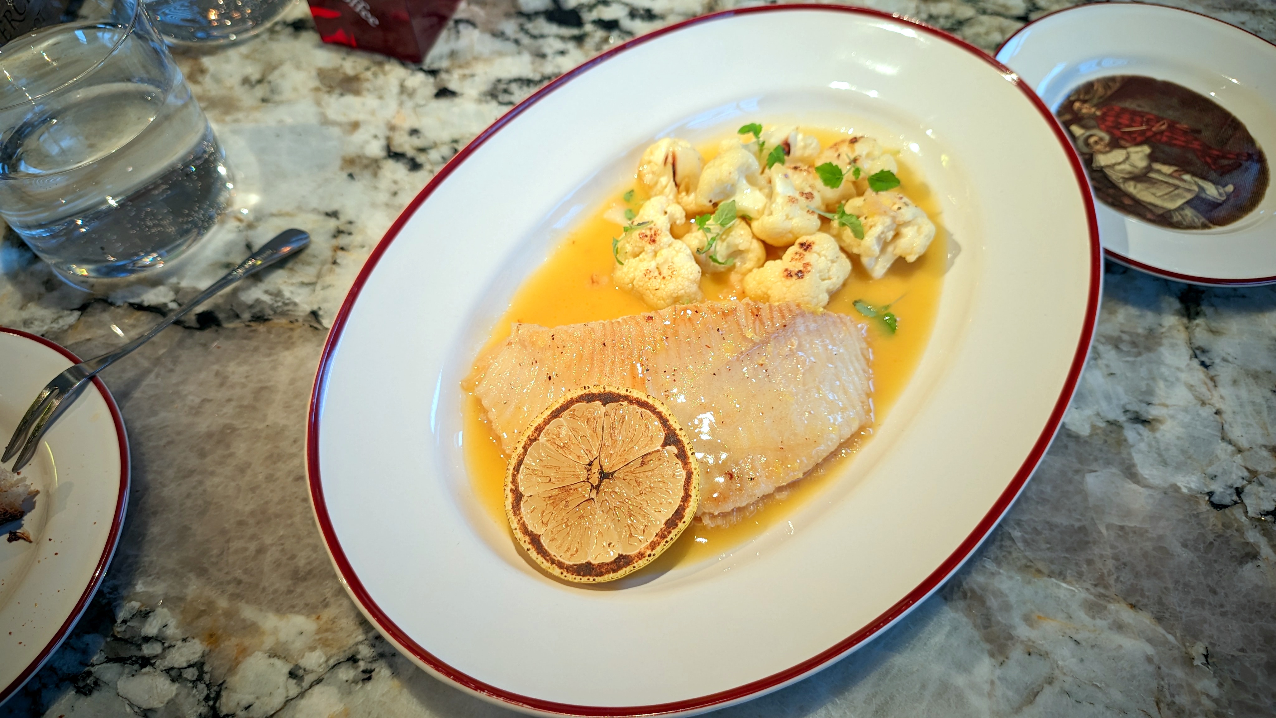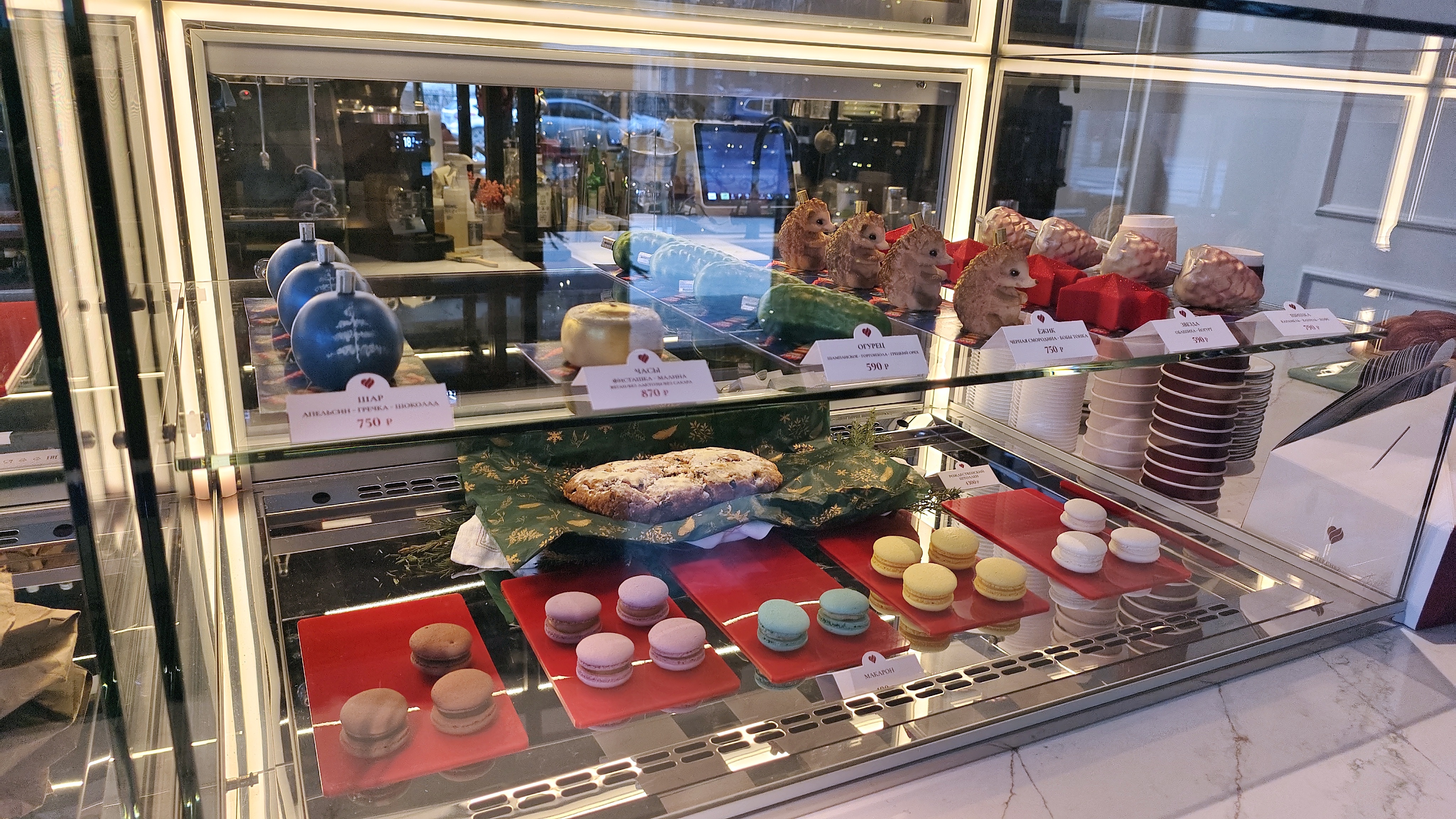 Эталонно сочно приготовленная рыба легко разделывается — крыло ската, что нечастый гость в меню, и вот не могу сказать, что дорого: не надоевшее не может быть дорогим, это ж не цезарь. Цветная капуста? Ну пусть — главное, что не примитивный гарнир. Ёжик — пирожное из действующей сезонной коллекции новогодних игрушек: ломать страшнее, чем прошлого Безумного Шляпника — знаете, что бывает, когда бьются ёлочные игрушки? Нежный, не скучный, в котором главное — черносмородиновое варенье и милота.