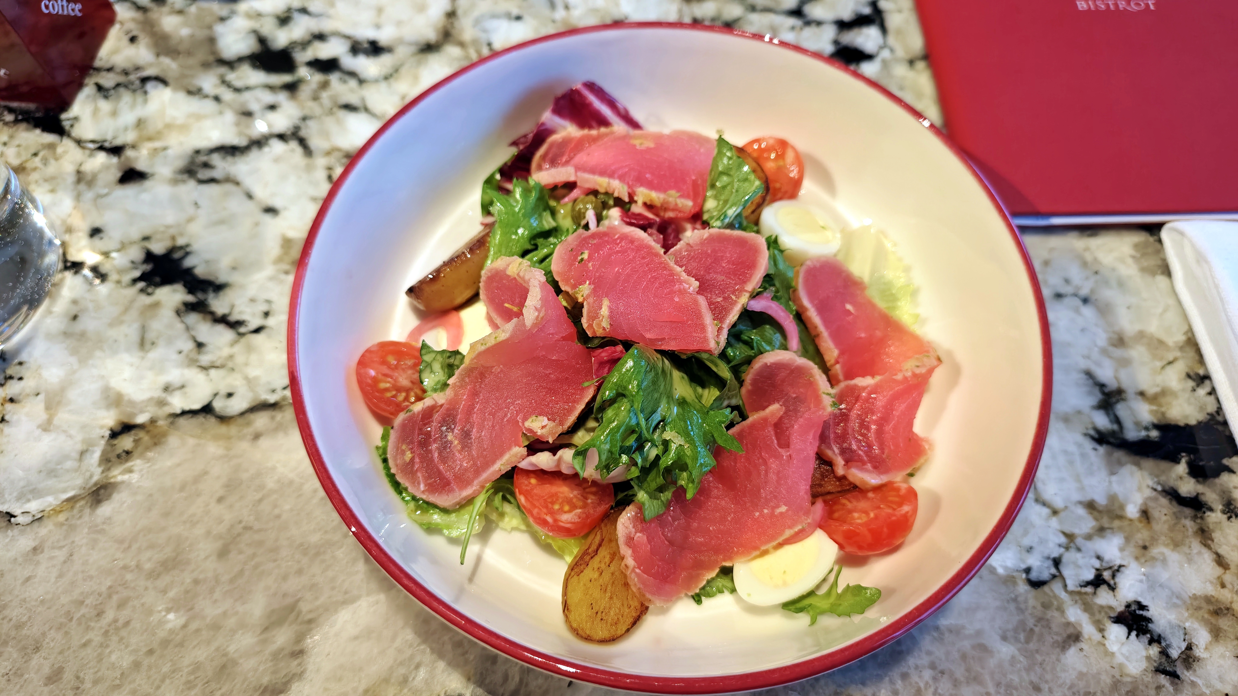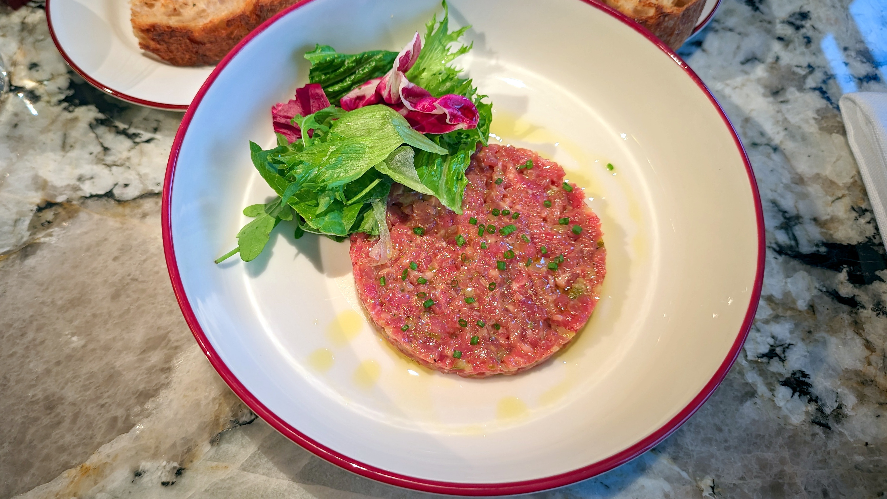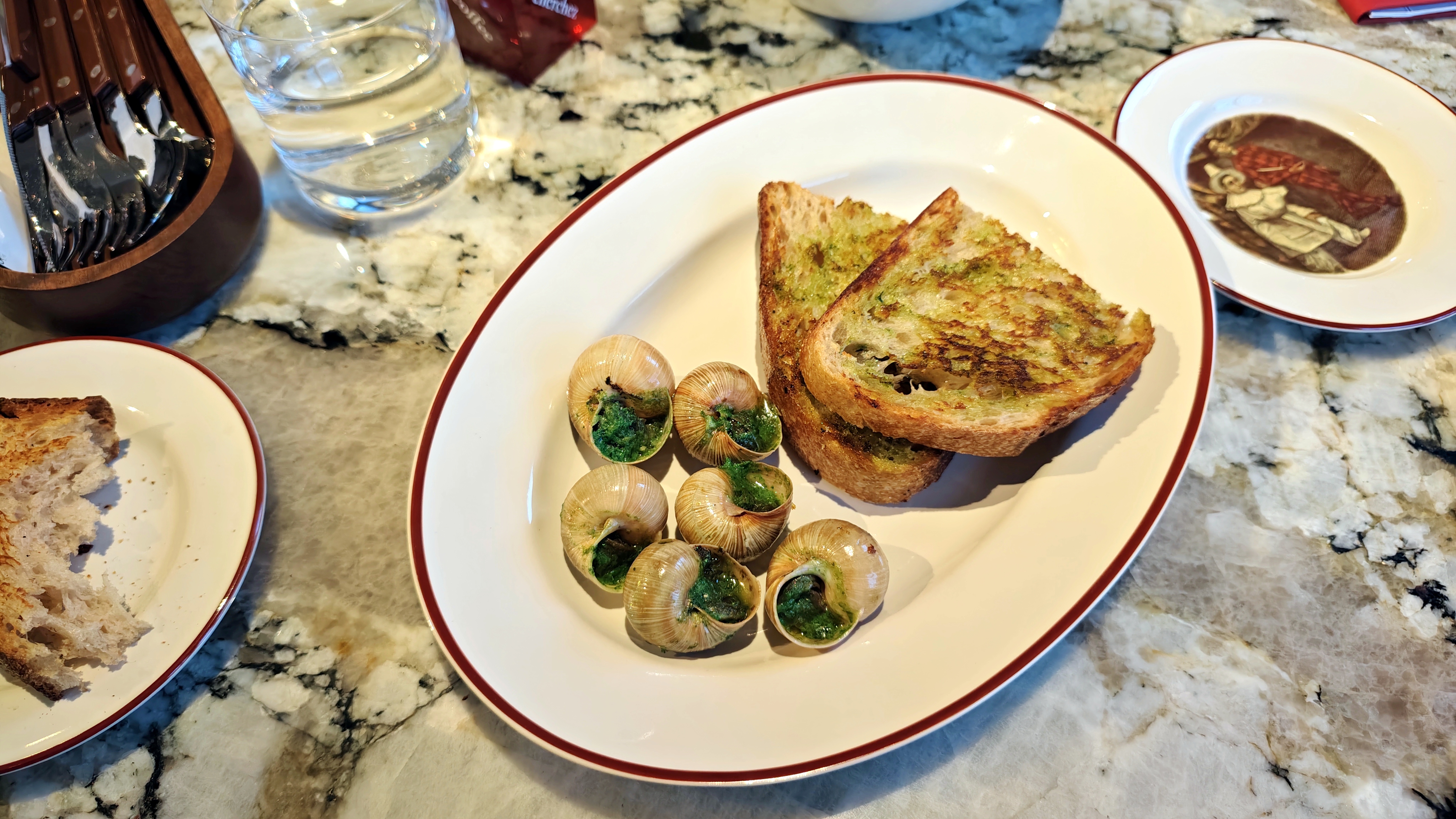 Французская рубка, ближе к ней, совершенно классическая заправка и хлеб, но поданный отдельно к тартару из говядины. Салат с красивыми пластинками тунца, почти татаки. Картошка, подмаринованный лук, отменный микс на четыре, кажется, сорта. Если советовать что-то, то перепелиные яйца делать с жидким центром, а не крутыми. Так больше ресторана в тарелке, а не бистро. Улитки по-бургундски поданы не в специальной посудинке, а на обычной тарелке: настроение не то! Полдюжины, можно понять по цене, отменно приготовлены, всё масло после препарирования переливаем из «домиков» на хлеб и наслаждаемся.